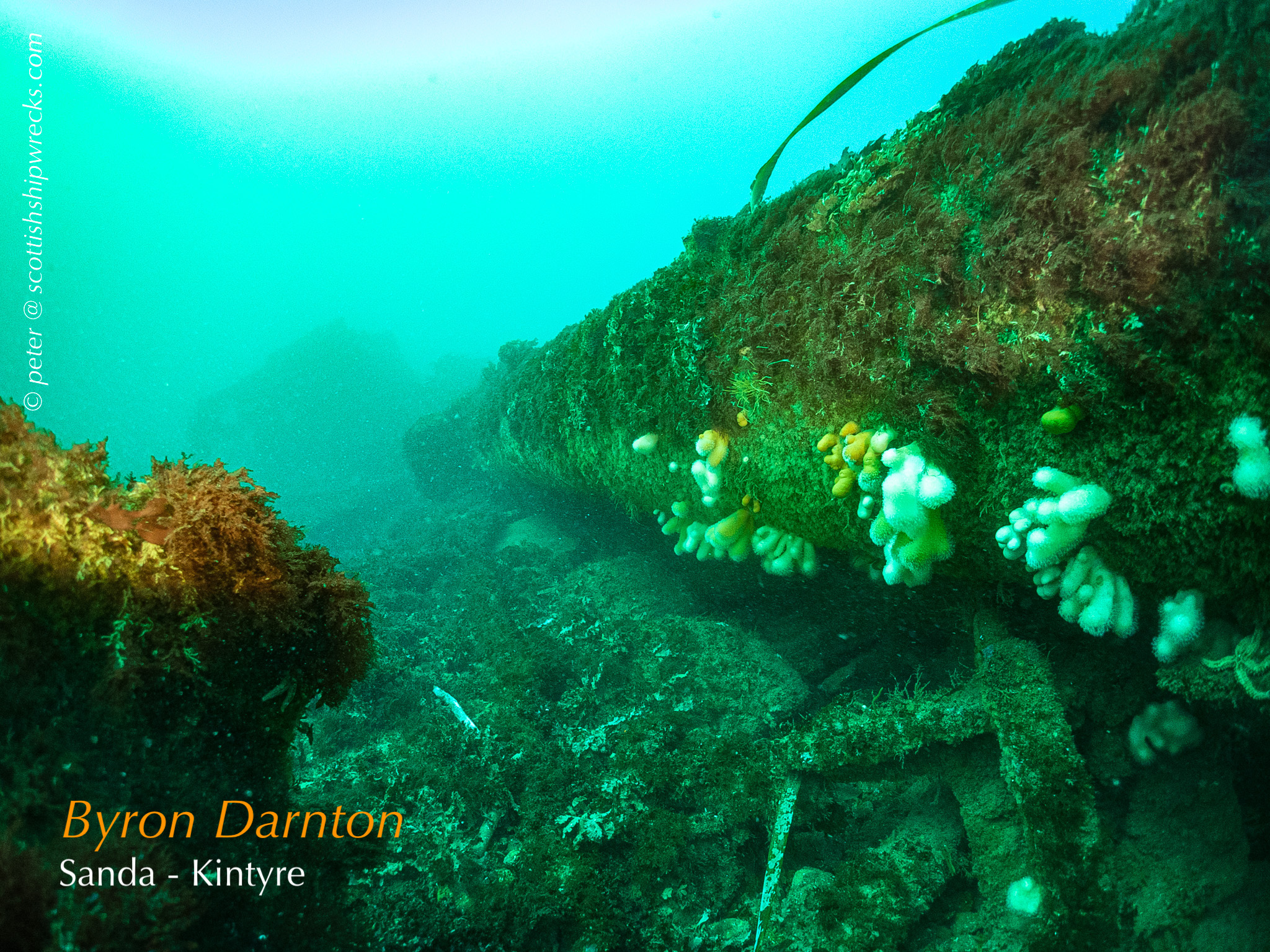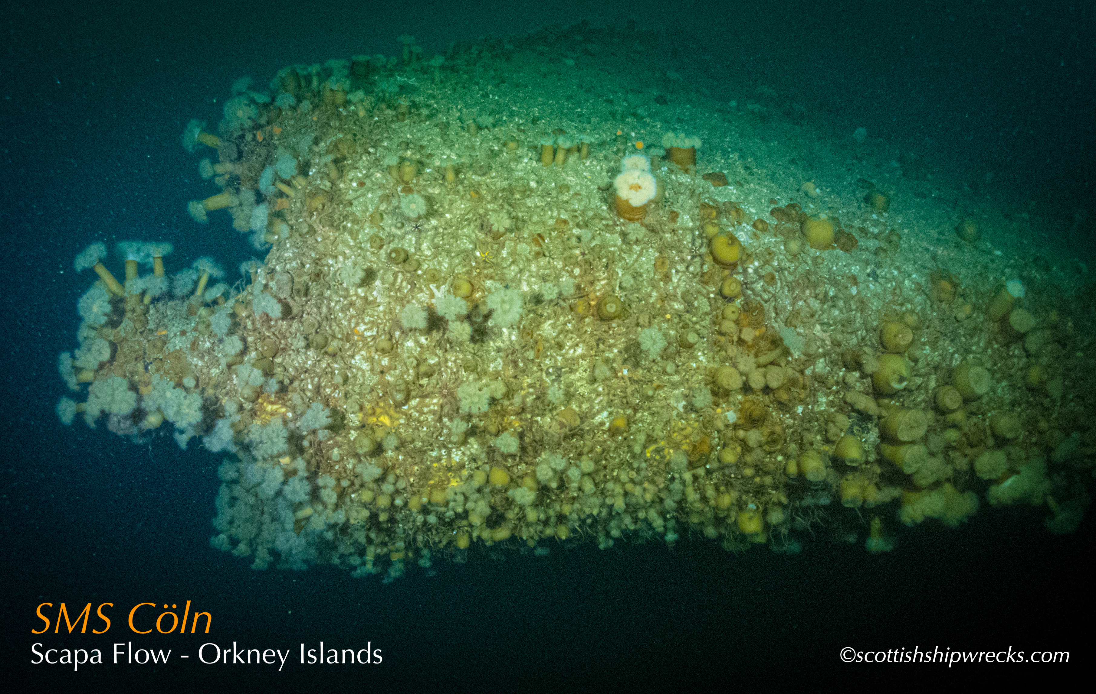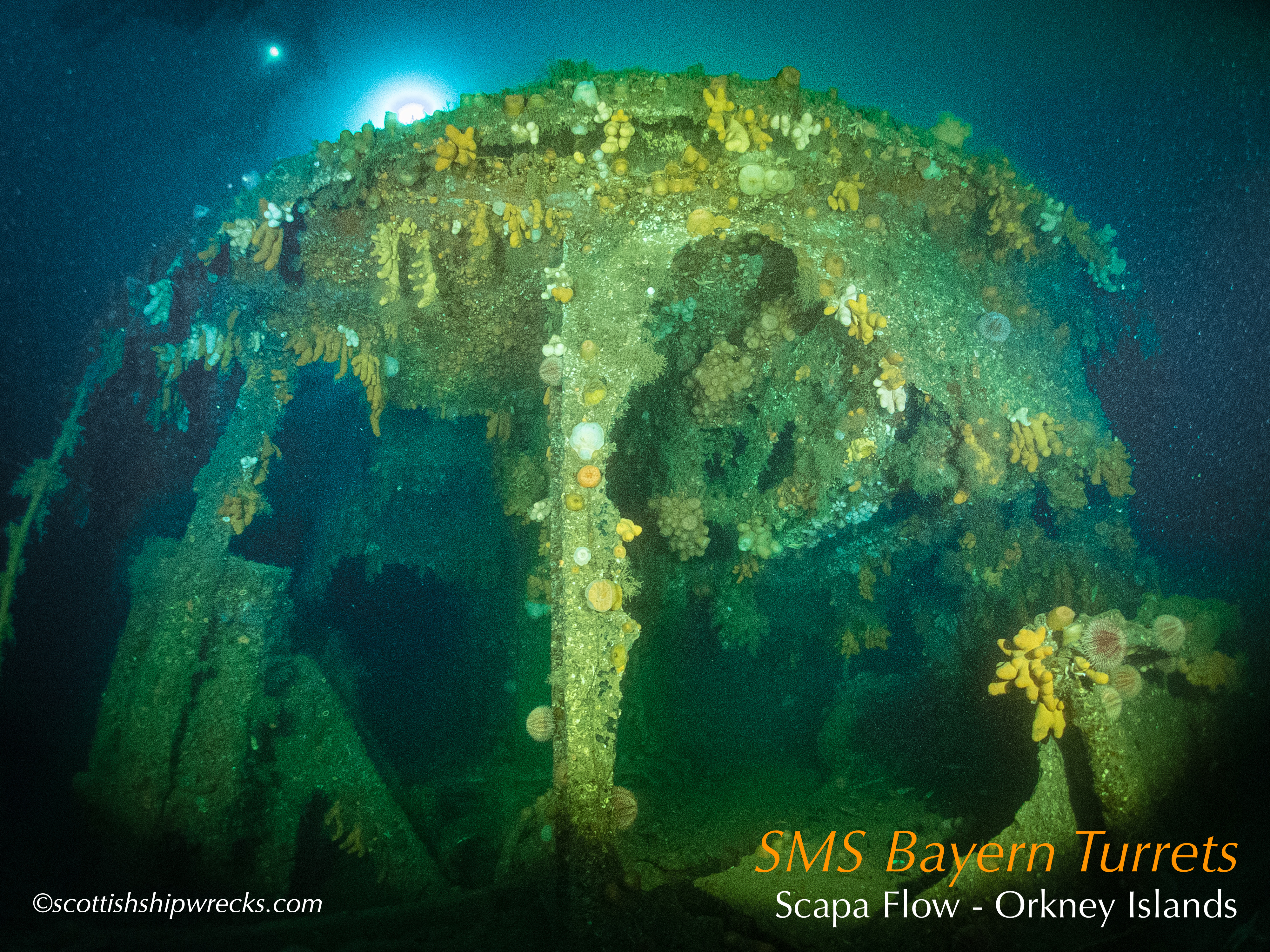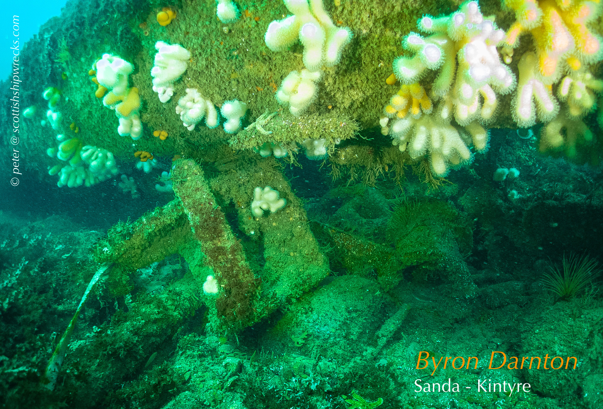 This section contain photographs of the wrecks as they lie on the seabed. These photographs have been taken over a period of many years up to and including very recently.  As such, the older photographs will not necessarily provide a view of the wreck as it exists today. However, the deterioration of the wrecks through time provides the viewer with an interesting insight into how a metal or wooden vessel will deteriorate over the years due to the action of the salty seawater and the Scottish weather. Underwater photography in Scottish waters is often a difficult exercise making the clarity of photographs taken extremely variable. The effects of rain water run off, plankton blooms, darkness and sometimes pollution provide visibility that can be 30 metres plus on offshore wrecks to as little as one metre in some cases in the Firth of Clyde or Firth of Forth. The skill of the photographer and the use of sophisticated photographic equipment and lighting combine to produce the best possible views of the wreckage but often pure luck contributes the best possible shots. The final colourful complication comes from the often beautiful colourful sealife that often encrusts the man made reefs that the wreck have become. The next section gives the viewer an idea of the typical types of sealife encountered on the wrecks.