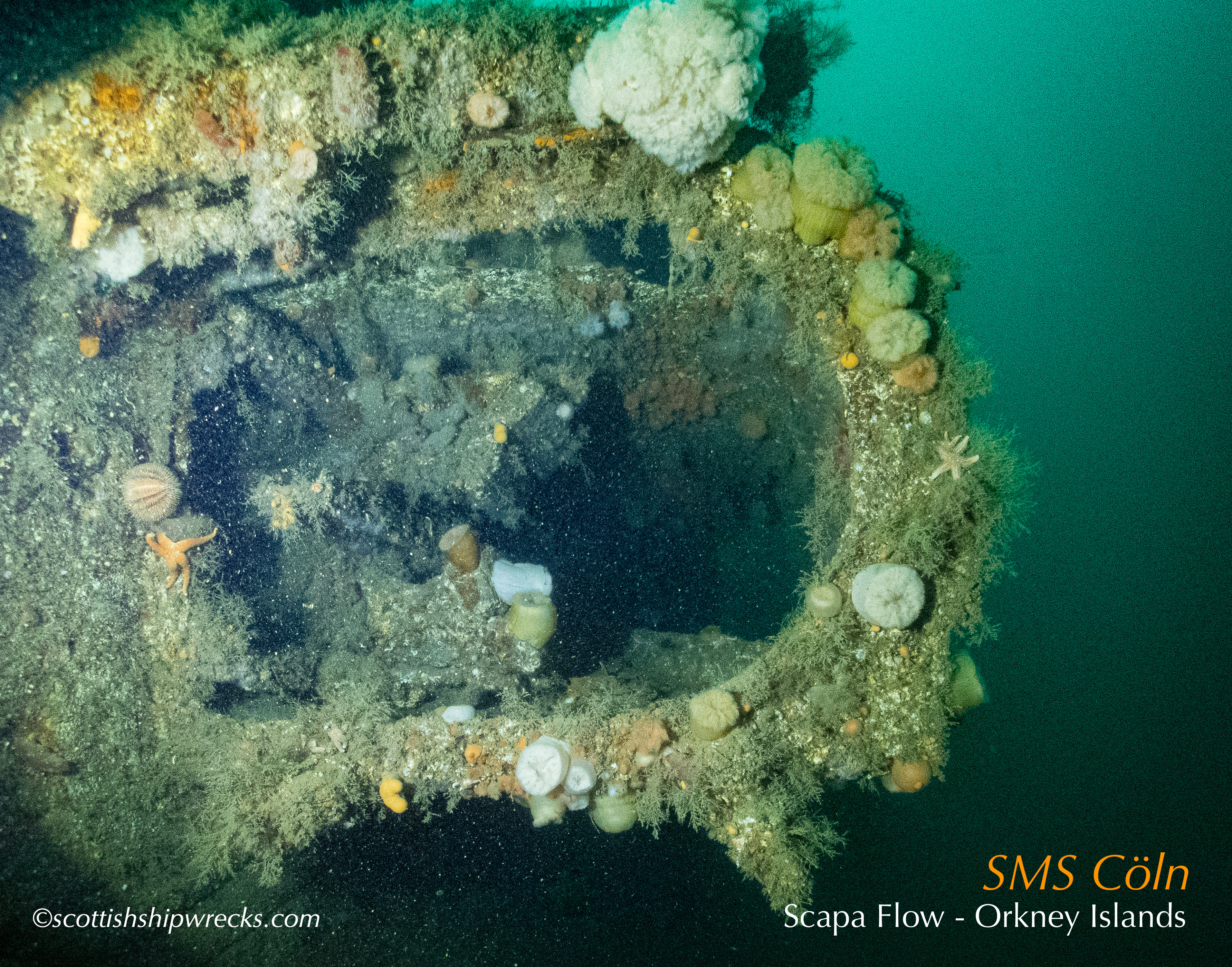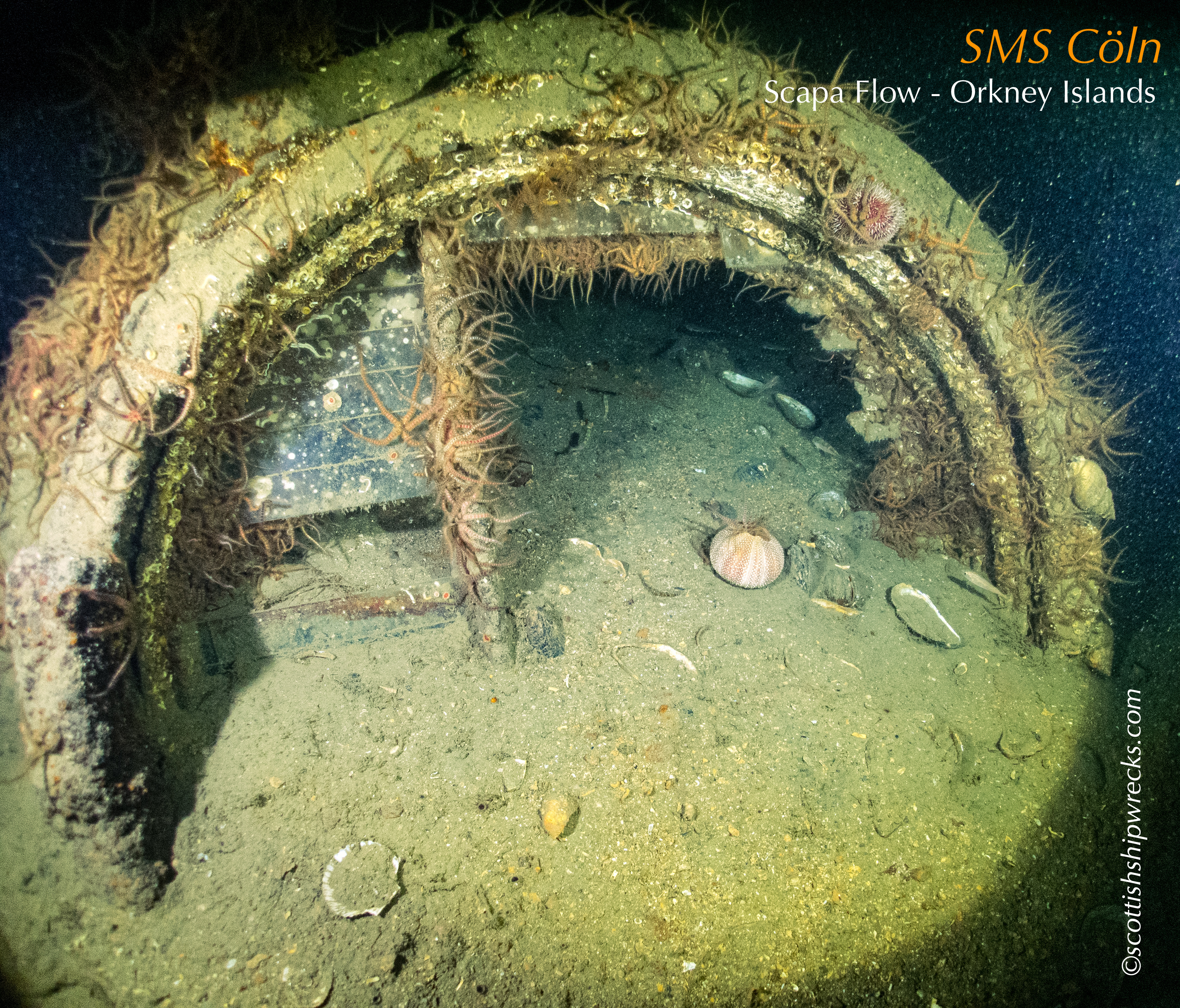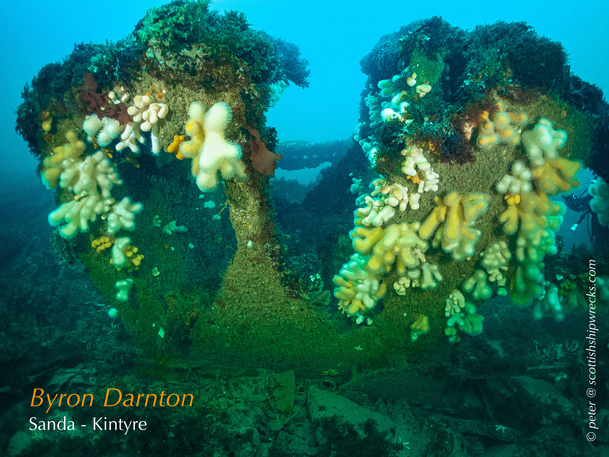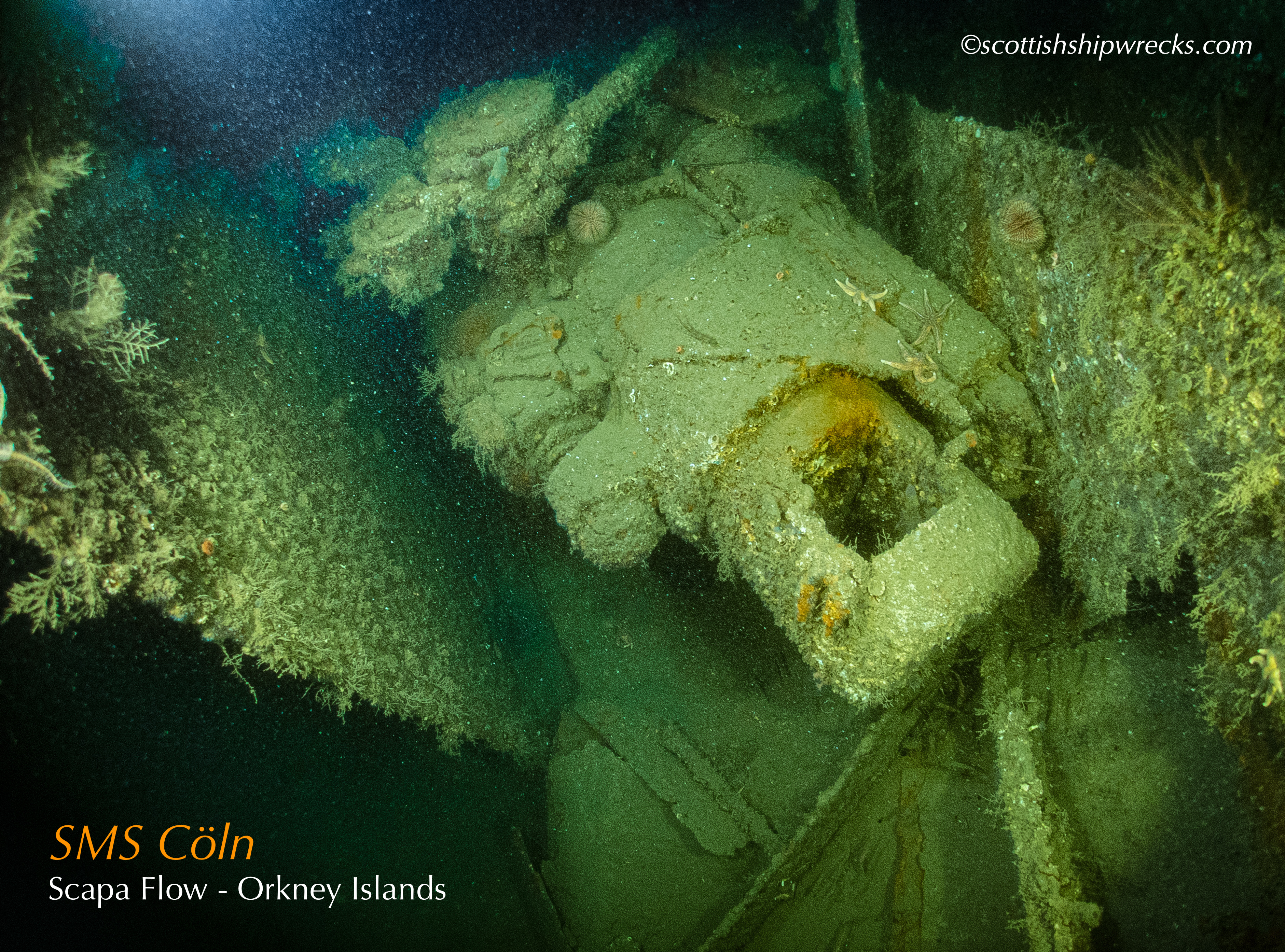 This section contain photographs of the wrecks as they lie on the seabed. These photographs have been taken over a period of many years up to and including very recently.  As such, the older photographs will not necessarily provide a view of the wreck as it exists today. However, the deterioration of the wrecks through time provides the viewer with an interesting insight into how a metal or wooden vessel will deteriorate over the years due to the action of the salty seawater and the Scottish weather. Underwater photography in Scottish waters is often a difficult exercise making the clarity of photographs taken extremely variable. The effects of rain water run off, plankton blooms, darkness and sometimes pollution provide visibility that can be 30 metres plus on offshore wrecks to as little as one metre in some cases in the Firth of Clyde or Firth of Forth. The skill of the photographer and the use of sophisticated photographic equipment and lighting combine to produce the best possible views of the wreckage but often pure luck contributes the best possible shots. The final colourful complication comes from the often beautiful colourful sealife that often encrusts the man made reefs that the wreck have become. The next section gives the viewer an idea of the typical types of sealife encountered on the wrecks.
