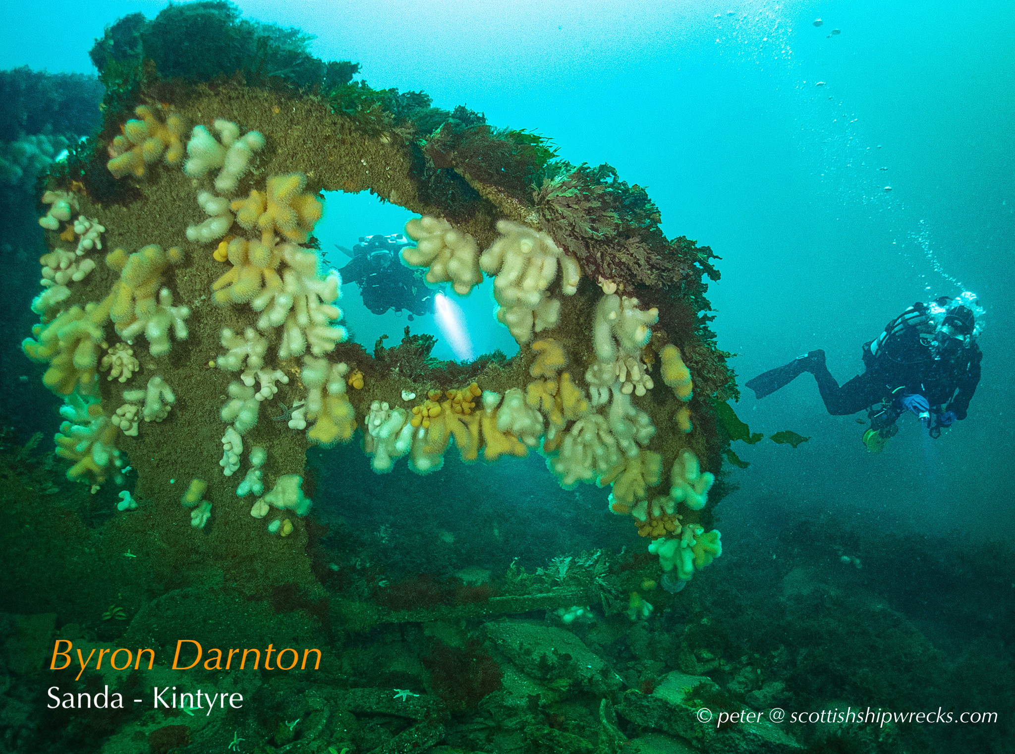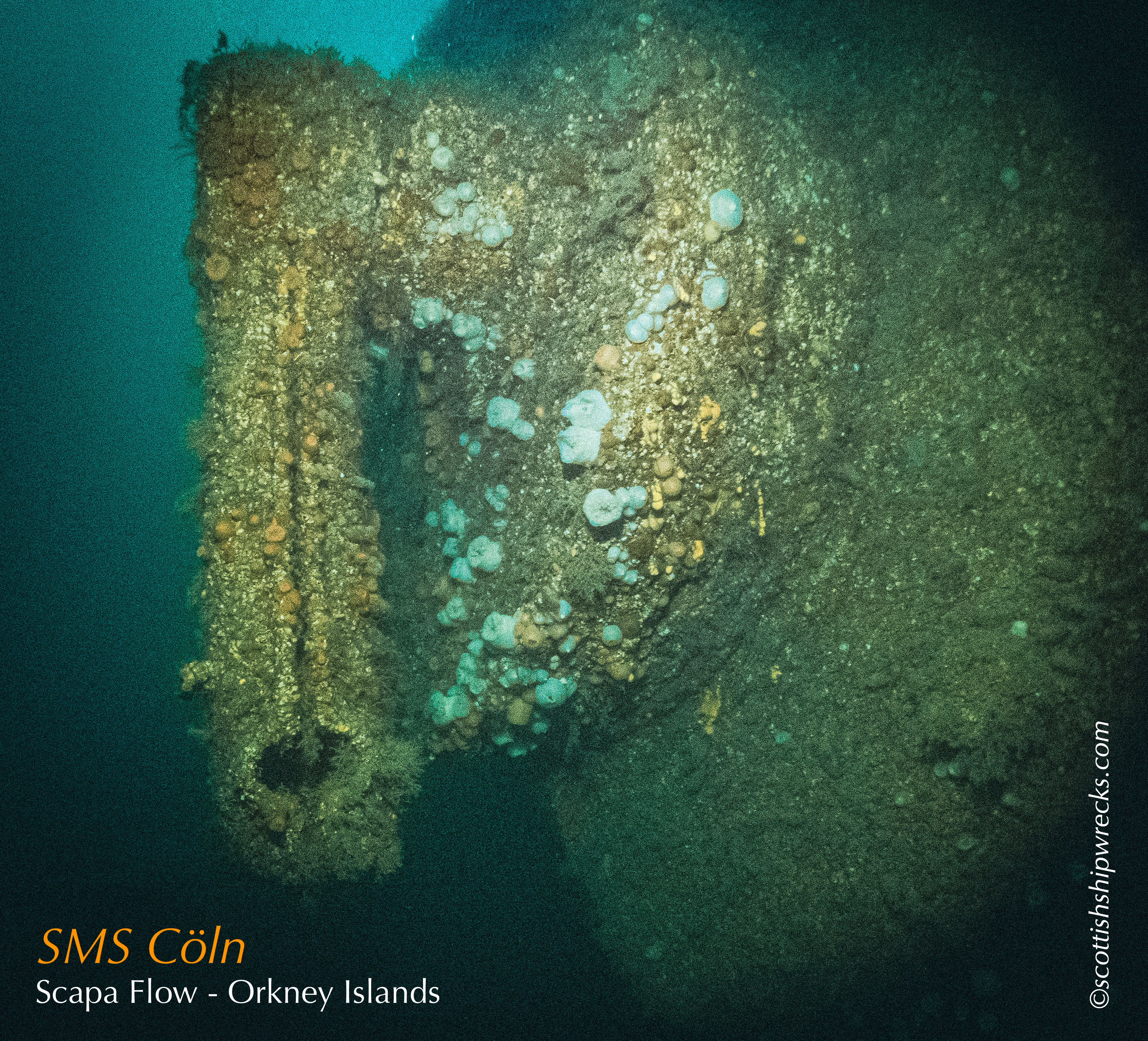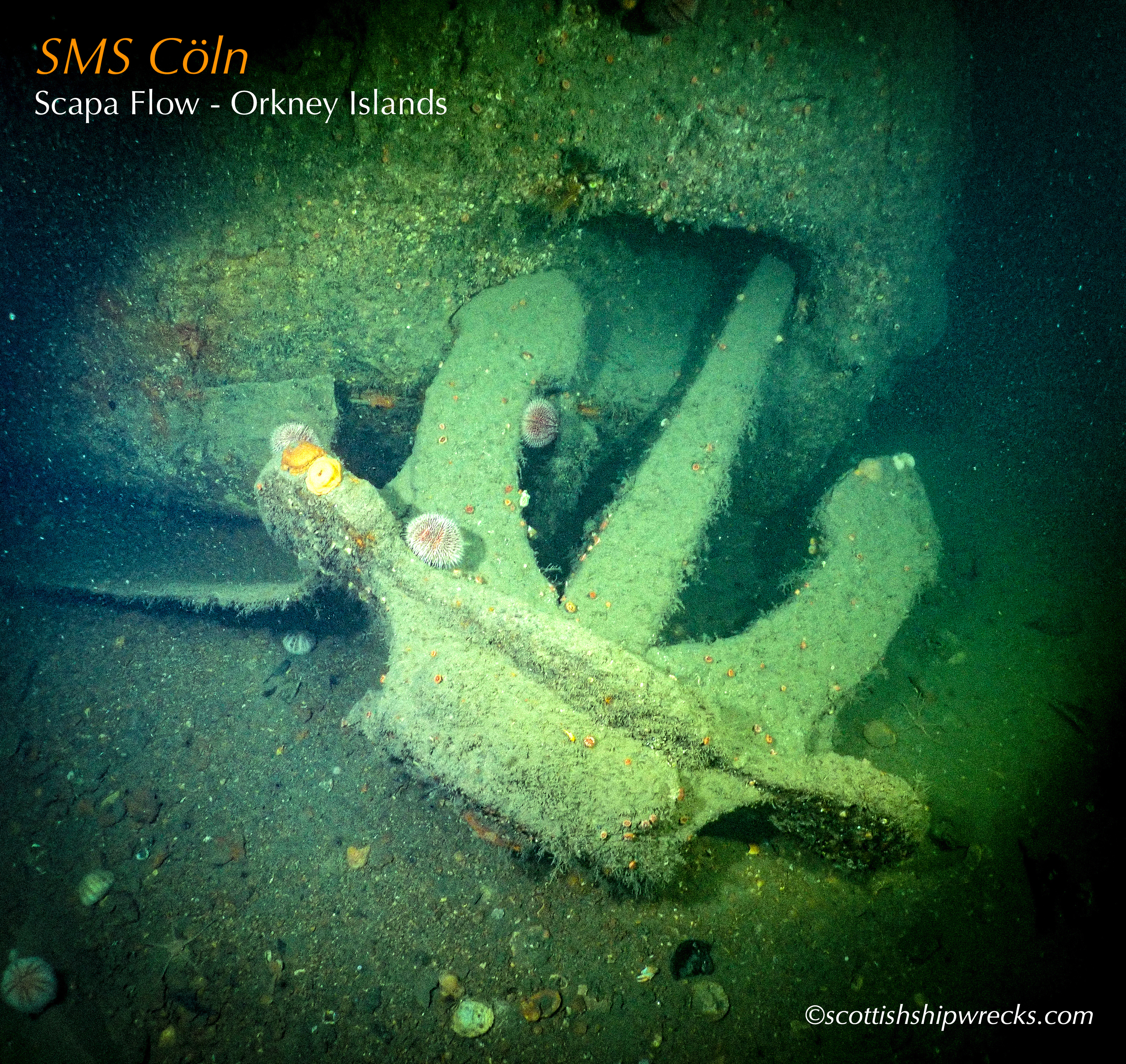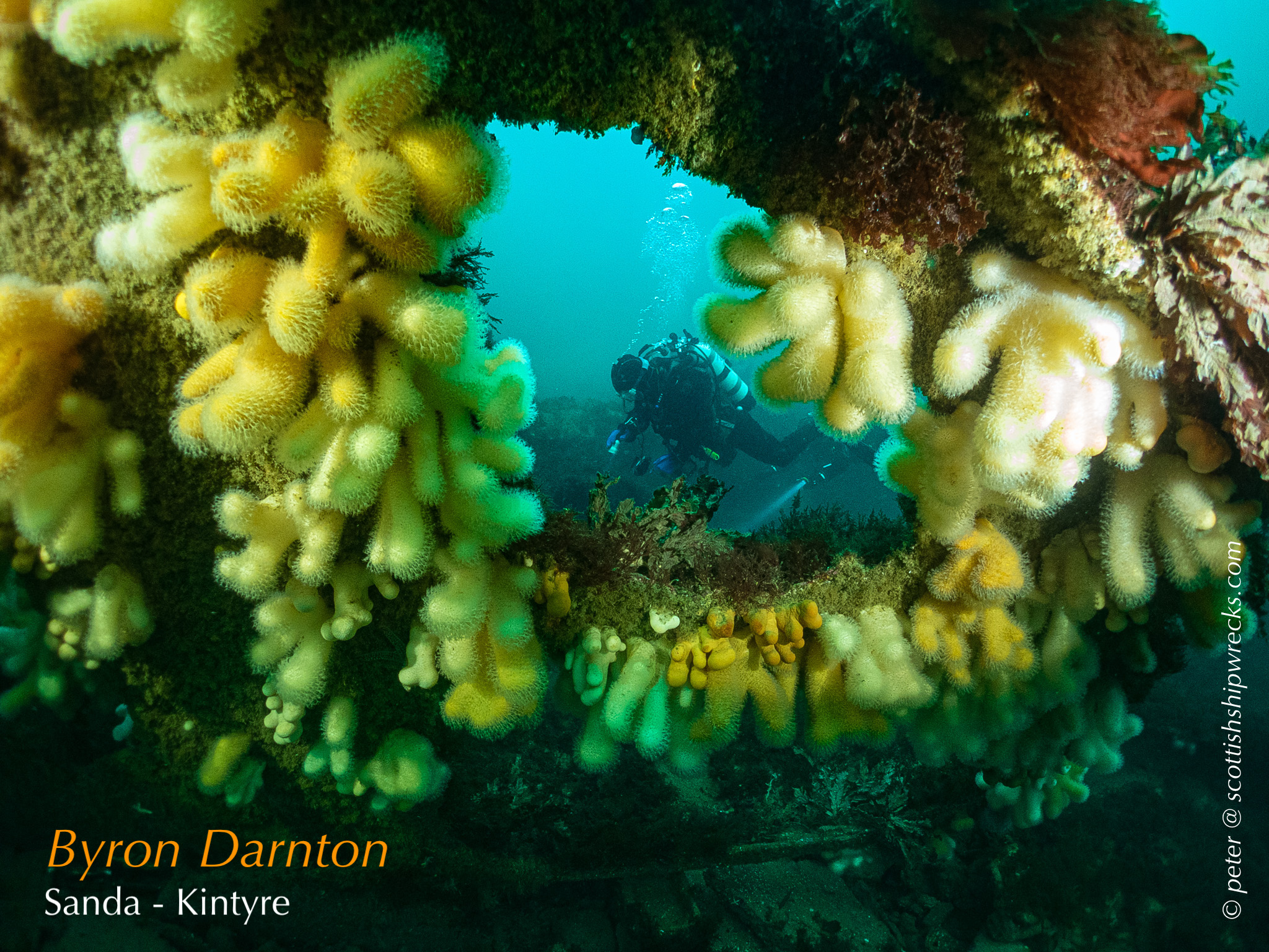 This section contain photographs of the wrecks as they lie on the seabed. These photographs have been taken over a period of many years up to and including very recently.  As such, the older photographs will not necessarily provide a view of the wreck as it exists today. However, the deterioration of the wrecks through time provides the viewer with an interesting insight into how a metal or wooden vessel will deteriorate over the years due to the action of the salty seawater and the Scottish weather. Underwater photography in Scottish waters is often a difficult exercise making the clarity of photographs taken extremely variable. The effects of rain water run off, plankton blooms, darkness and sometimes pollution provide visibility that can be 30 metres plus on offshore wrecks to as little as one metre in some cases in the Firth of Clyde or Firth of Forth. The skill of the photographer and the use of sophisticated photographic equipment and lighting combine to produce the best possible views of the wreckage but often pure luck contributes the best possible shots. The final colourful complication comes from the often beautiful colourful sealife that often encrusts the man made reefs that the wreck have become. The next section gives the viewer an idea of the typical types of sealife encountered on the wrecks.