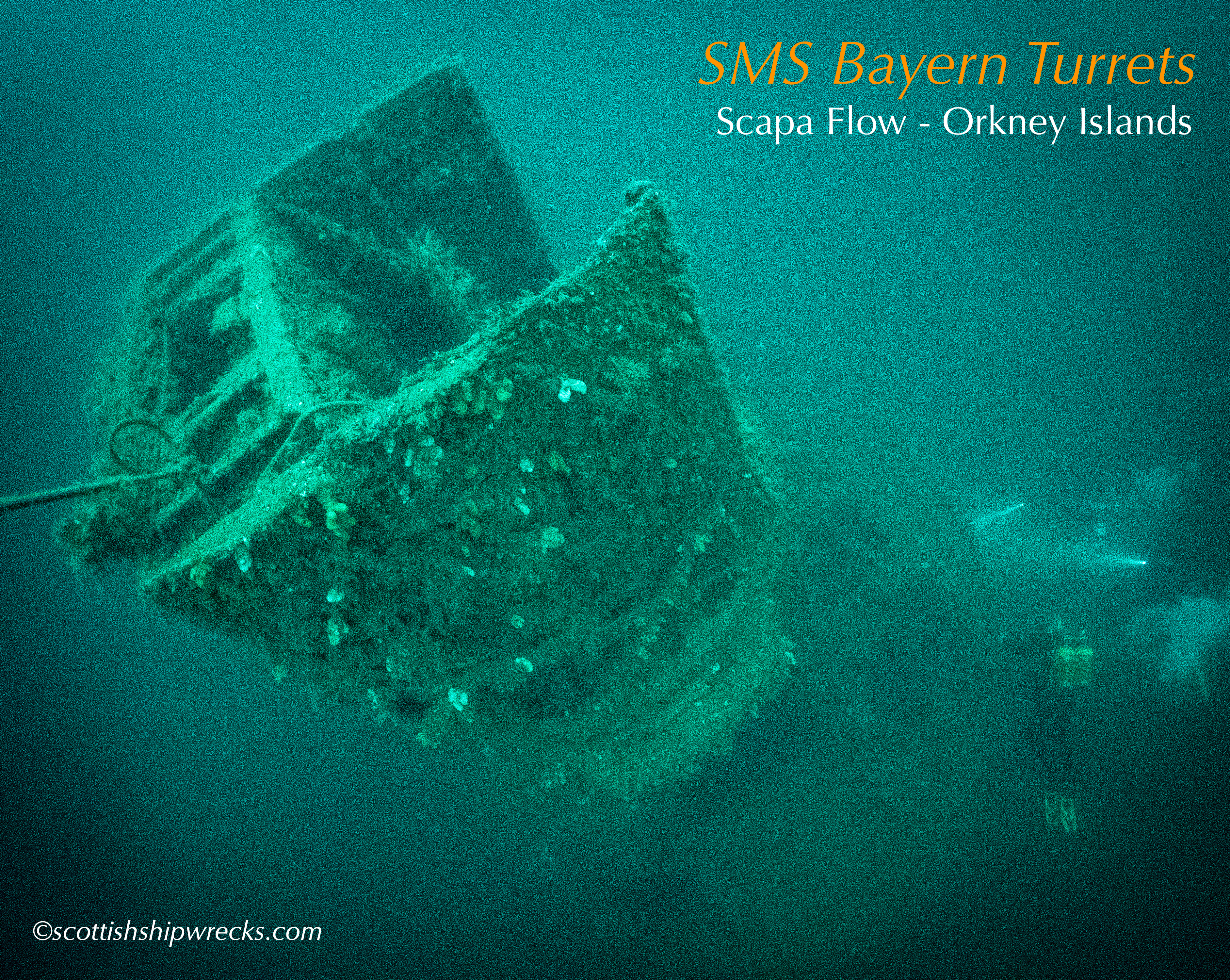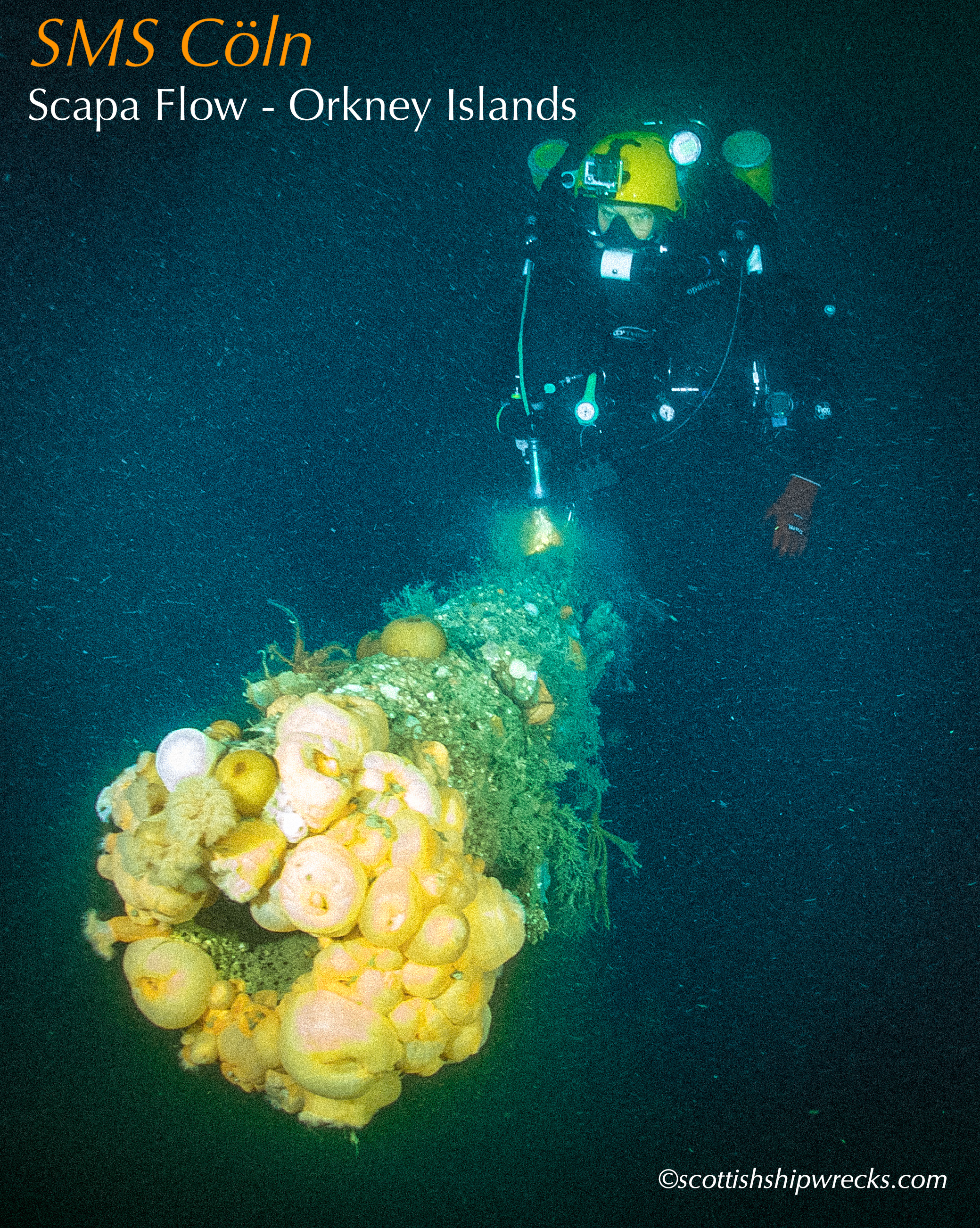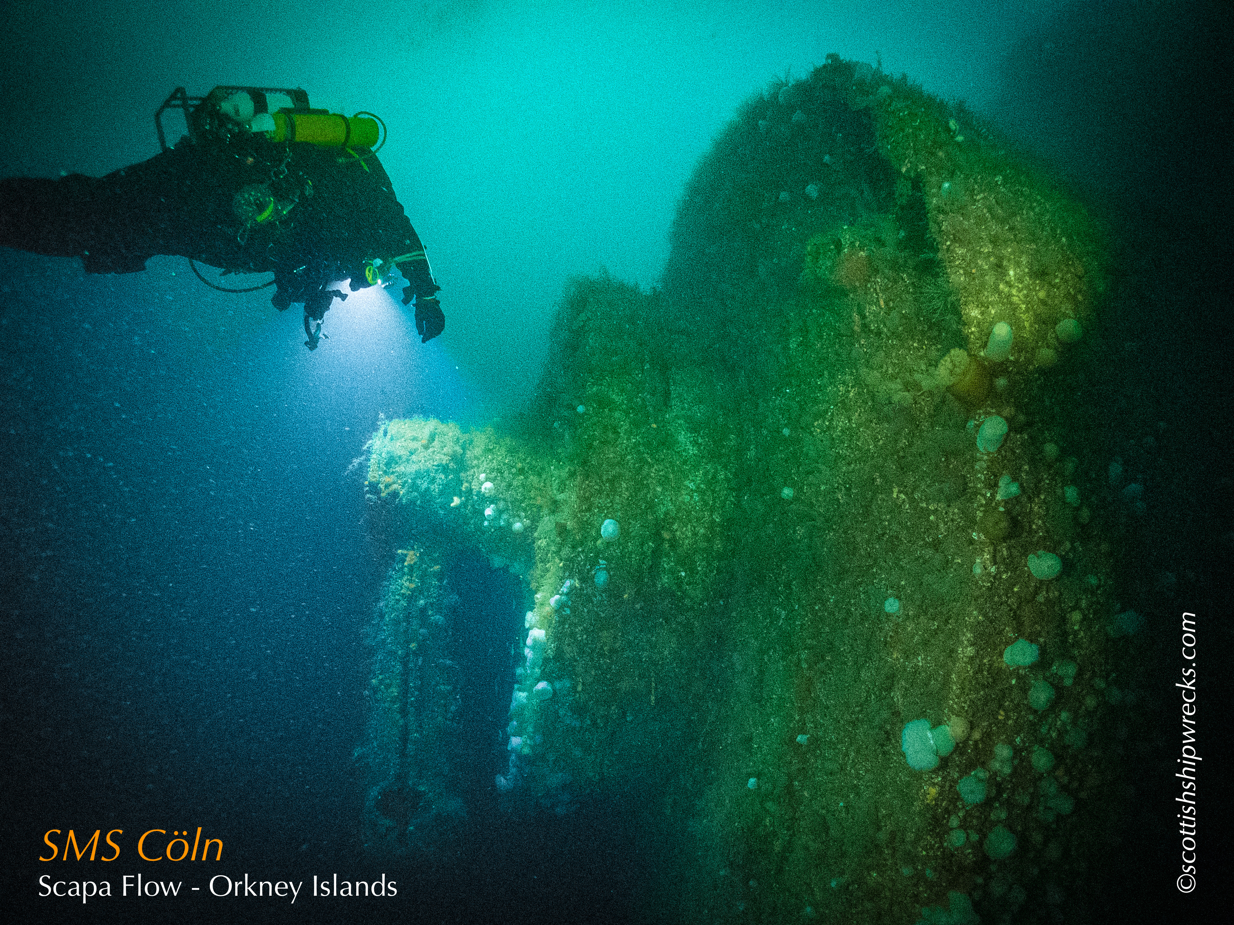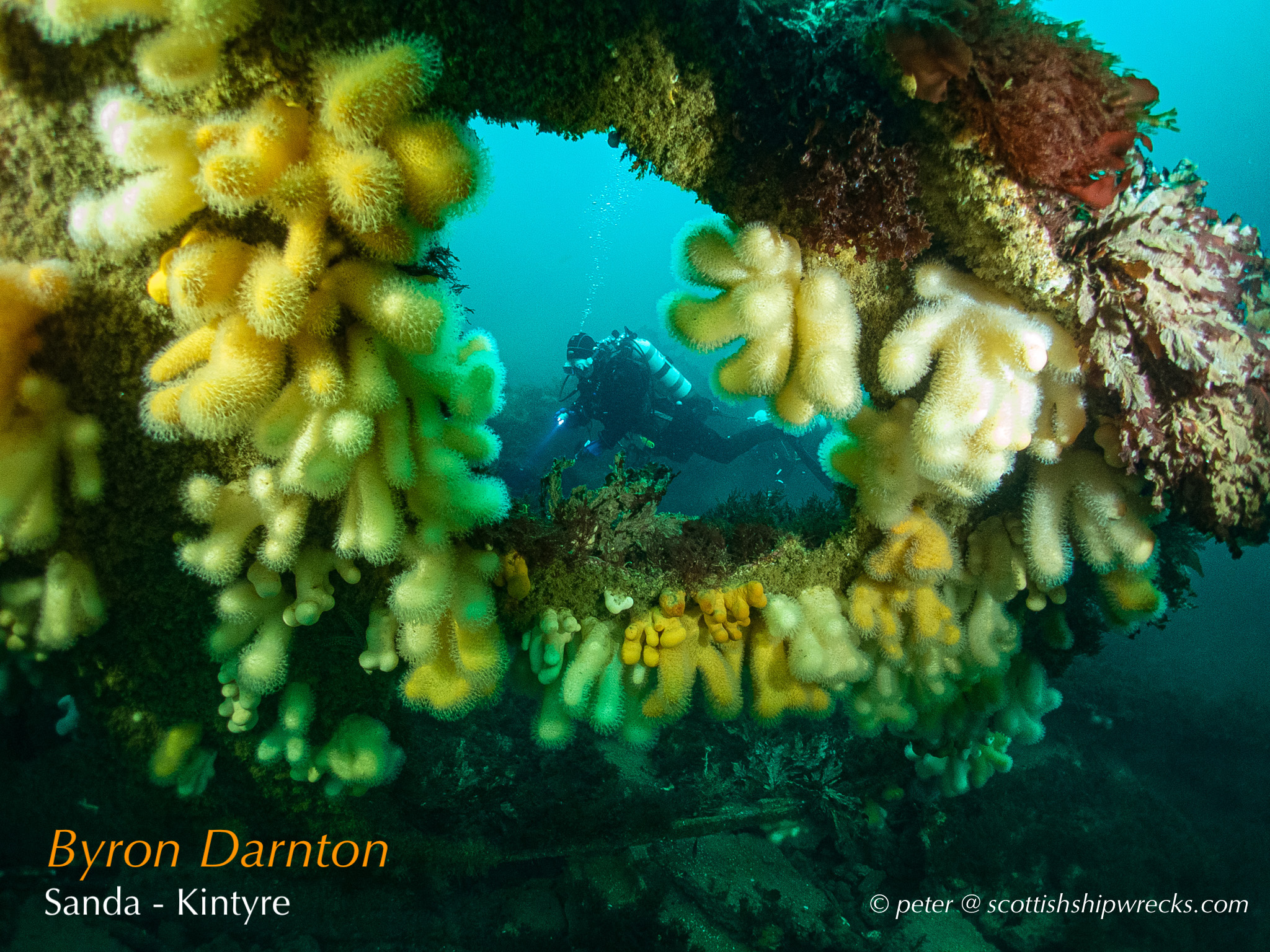 This section contain photographs of the wrecks as they lie on the seabed. These photographs have been taken over a period of many years up to and including very recently.  As such, the older photographs will not necessarily provide a view of the wreck as it exists today. However, the deterioration of the wrecks through time provides the viewer with an interesting insight into how a metal or wooden vessel will deteriorate over the years due to the action of the salty seawater and the Scottish weather. Underwater photography in Scottish waters is often a difficult exercise making the clarity of photographs taken extremely variable. The effects of rain water run off, plankton blooms, darkness and sometimes pollution provide visibility that can be 30 metres plus on offshore wrecks to as little as one metre in some cases in the Firth of Clyde or Firth of Forth. The skill of the photographer and the use of sophisticated photographic equipment and lighting combine to produce the best possible views of the wreckage but often pure luck contributes the best possible shots. The final colourful complication comes from the often beautiful colourful sealife that often encrusts the man made reefs that the wreck have become. The next section gives the viewer an idea of the typical types of sealife encountered on the wrecks.