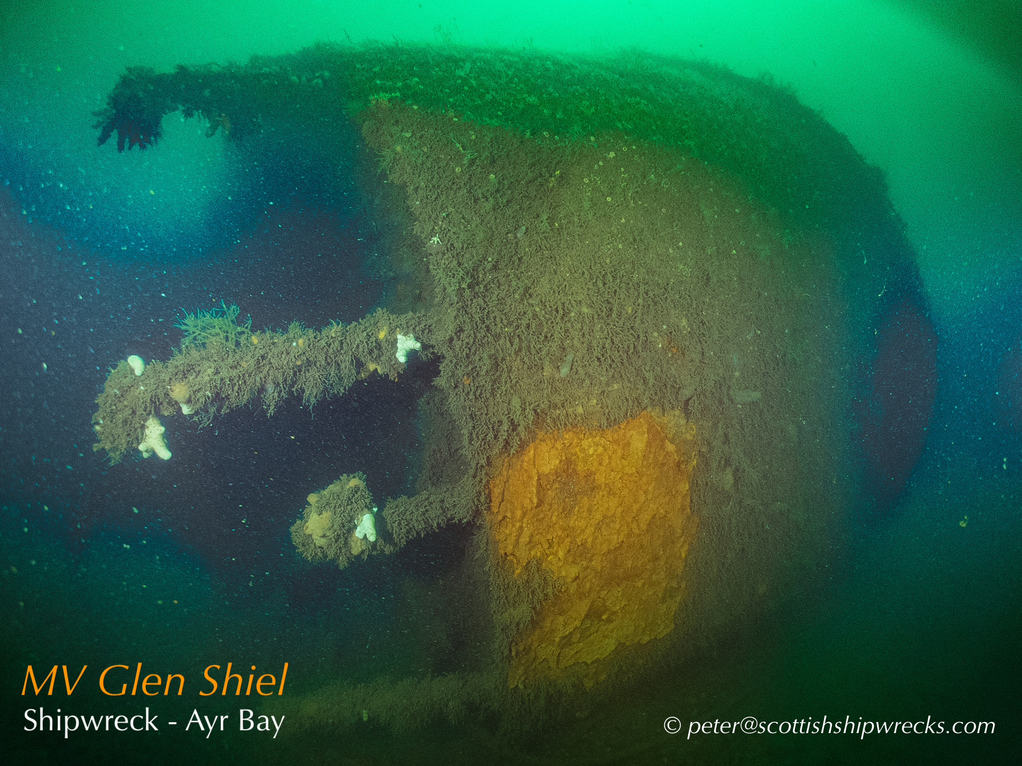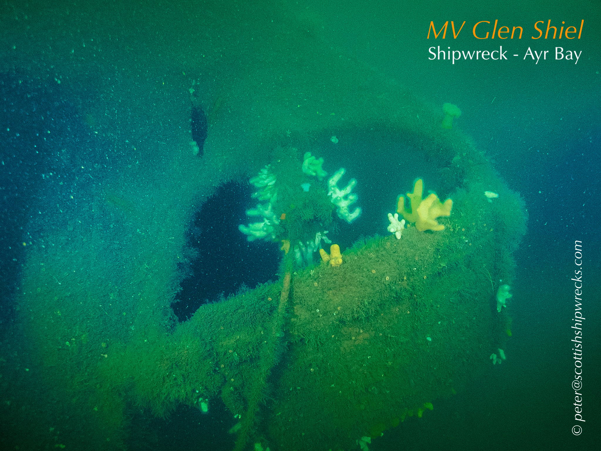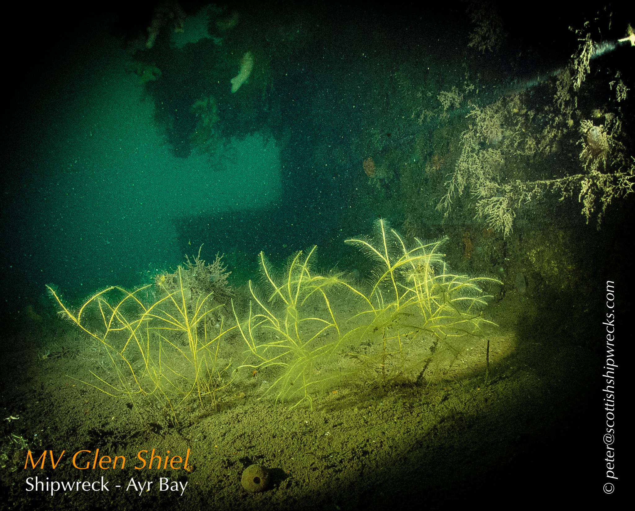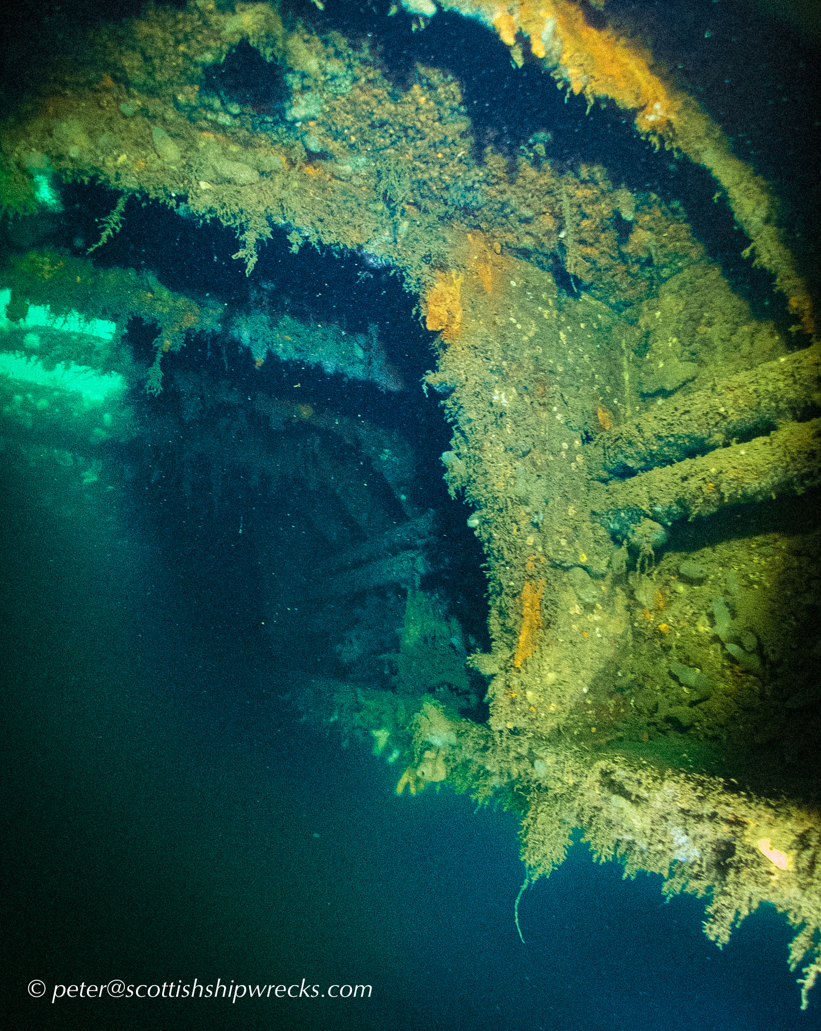 This section contain photographs of the wrecks as they lie on the seabed. These photographs have been taken over a period of many years up to and including very recently.  As such, the older photographs will not necessarily provide a view of the wreck as it exists today. However, the deterioration of the wrecks through time provides the viewer with an interesting insight into how a metal or wooden vessel will deteriorate over the years due to the action of the salty seawater and the Scottish weather. Underwater photography in Scottish waters is often a difficult exercise making the clarity of photographs taken extremely variable. The effects of rain water run off, plankton blooms, darkness and sometimes pollution provide visibility that can be 30 metres plus on offshore wrecks to as little as one metre in some cases in the Firth of Clyde or Firth of Forth. The skill of the photographer and the use of sophisticated photographic equipment and lighting combine to produce the best possible views of the wreckage but often pure luck contributes the best possible shots. The final colourful complication comes from the often beautiful colourful sealife that often encrusts the man made reefs that the wreck have become. The next section gives the viewer an idea of the typical types of sealife encountered on the wrecks.