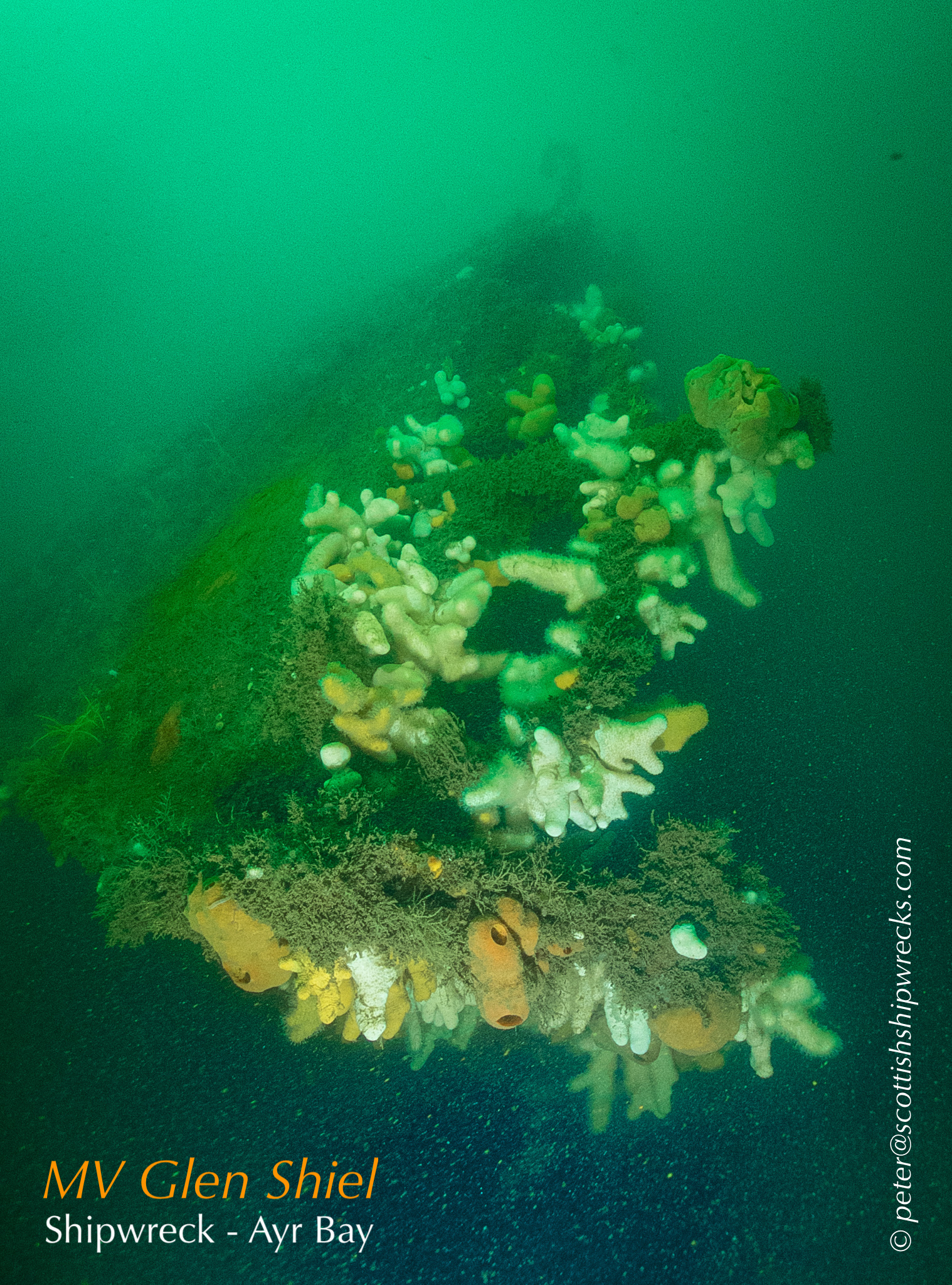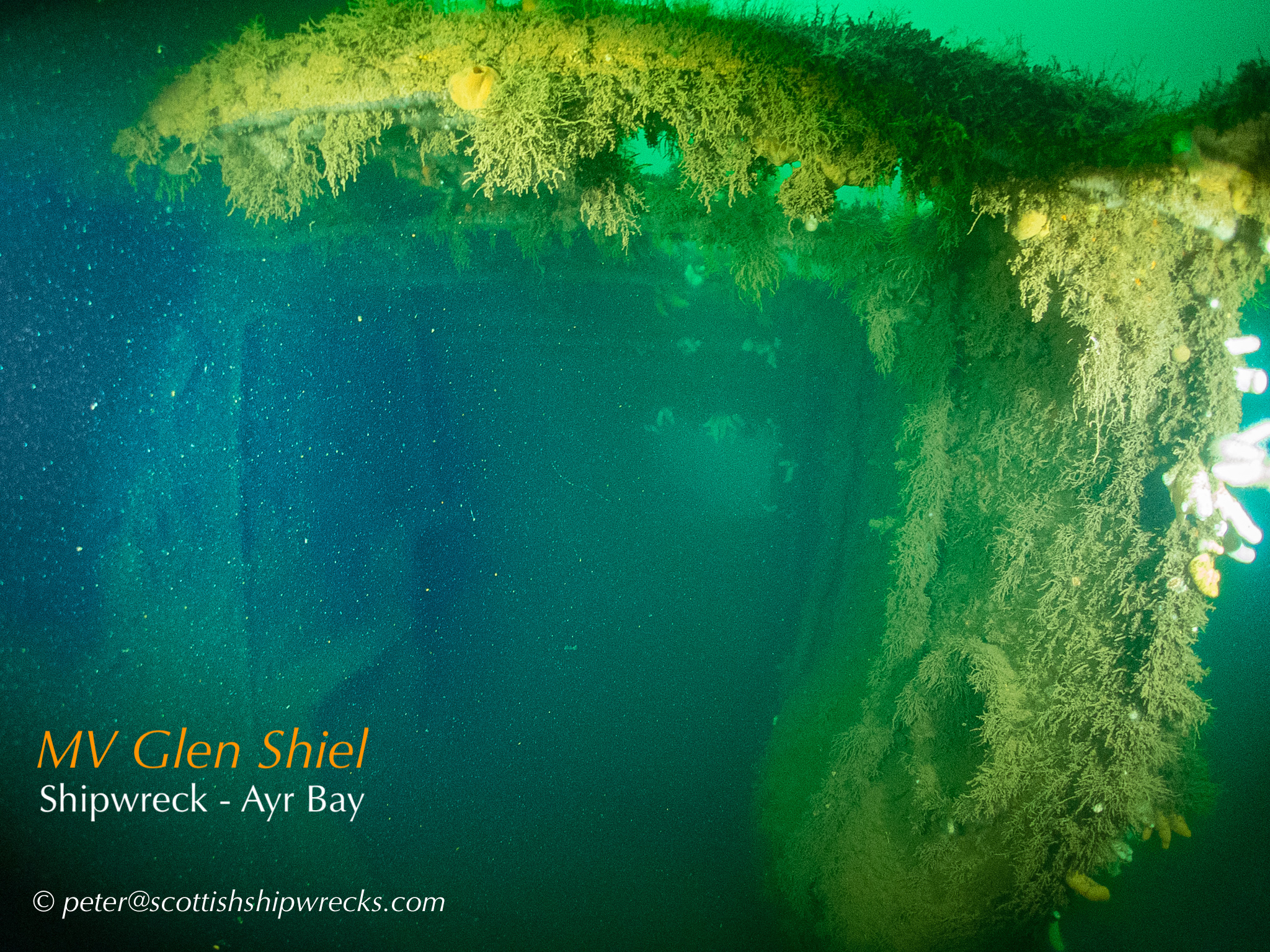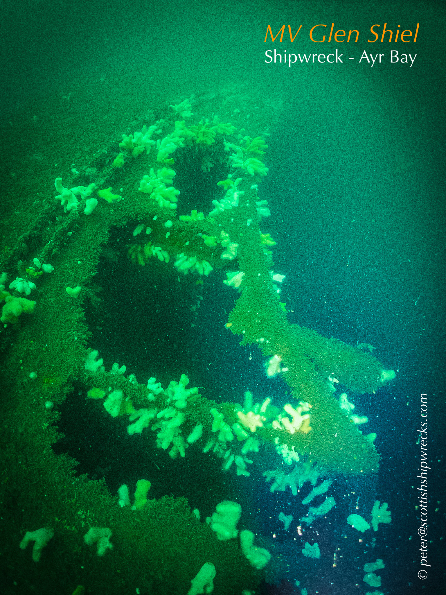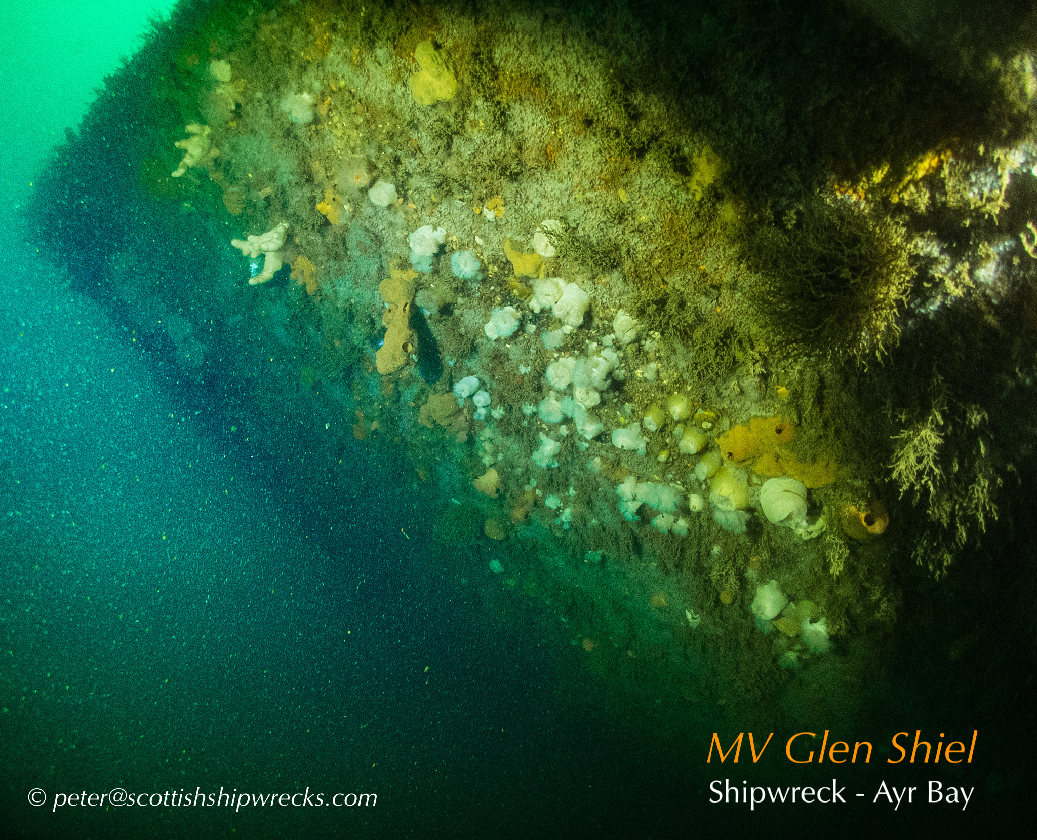 This section contain photographs of the wrecks as they lie on the seabed. These photographs have been taken over a period of many years up to and including very recently.  As such, the older photographs will not necessarily provide a view of the wreck as it exists today. However, the deterioration of the wrecks through time provides the viewer with an interesting insight into how a metal or wooden vessel will deteriorate over the years due to the action of the salty seawater and the Scottish weather. Underwater photography in Scottish waters is often a difficult exercise making the clarity of photographs taken extremely variable. The effects of rain water run off, plankton blooms, darkness and sometimes pollution provide visibility that can be 30 metres plus on offshore wrecks to as little as one metre in some cases in the Firth of Clyde or Firth of Forth. The skill of the photographer and the use of sophisticated photographic equipment and lighting combine to produce the best possible views of the wreckage but often pure luck contributes the best possible shots. The final colourful complication comes from the often beautiful colourful sealife that often encrusts the man made reefs that the wreck have become. The next section gives the viewer an idea of the typical types of sealife encountered on the wrecks.