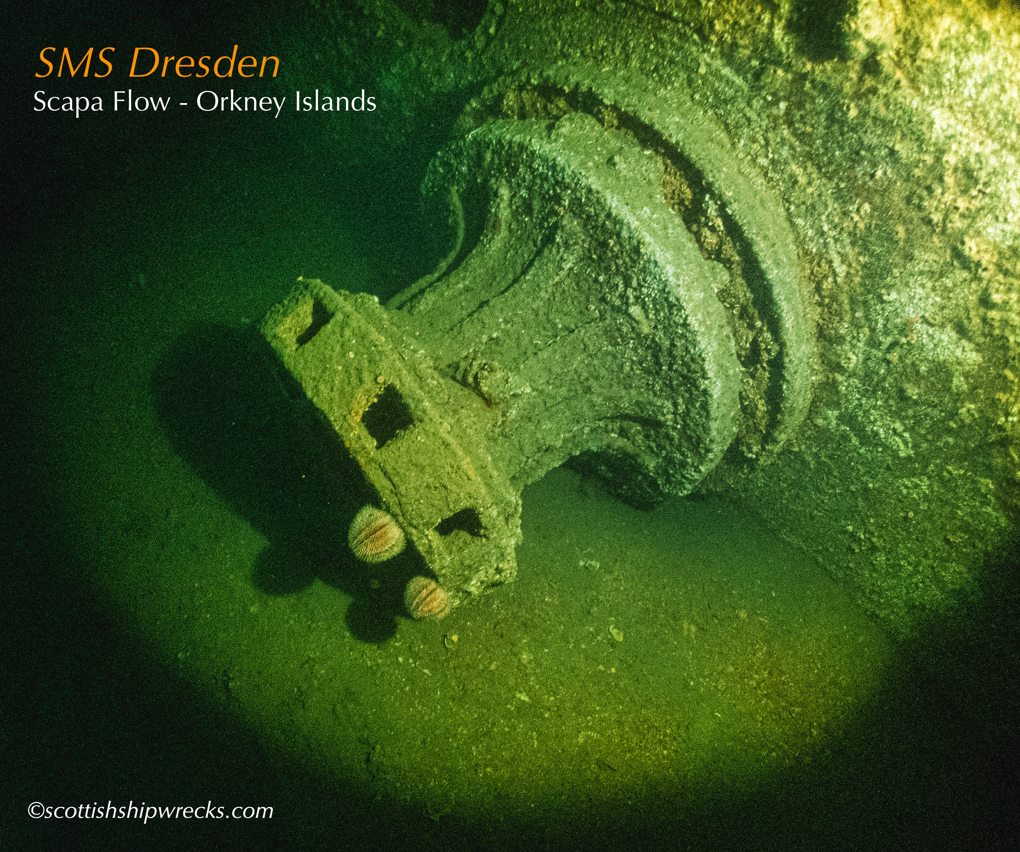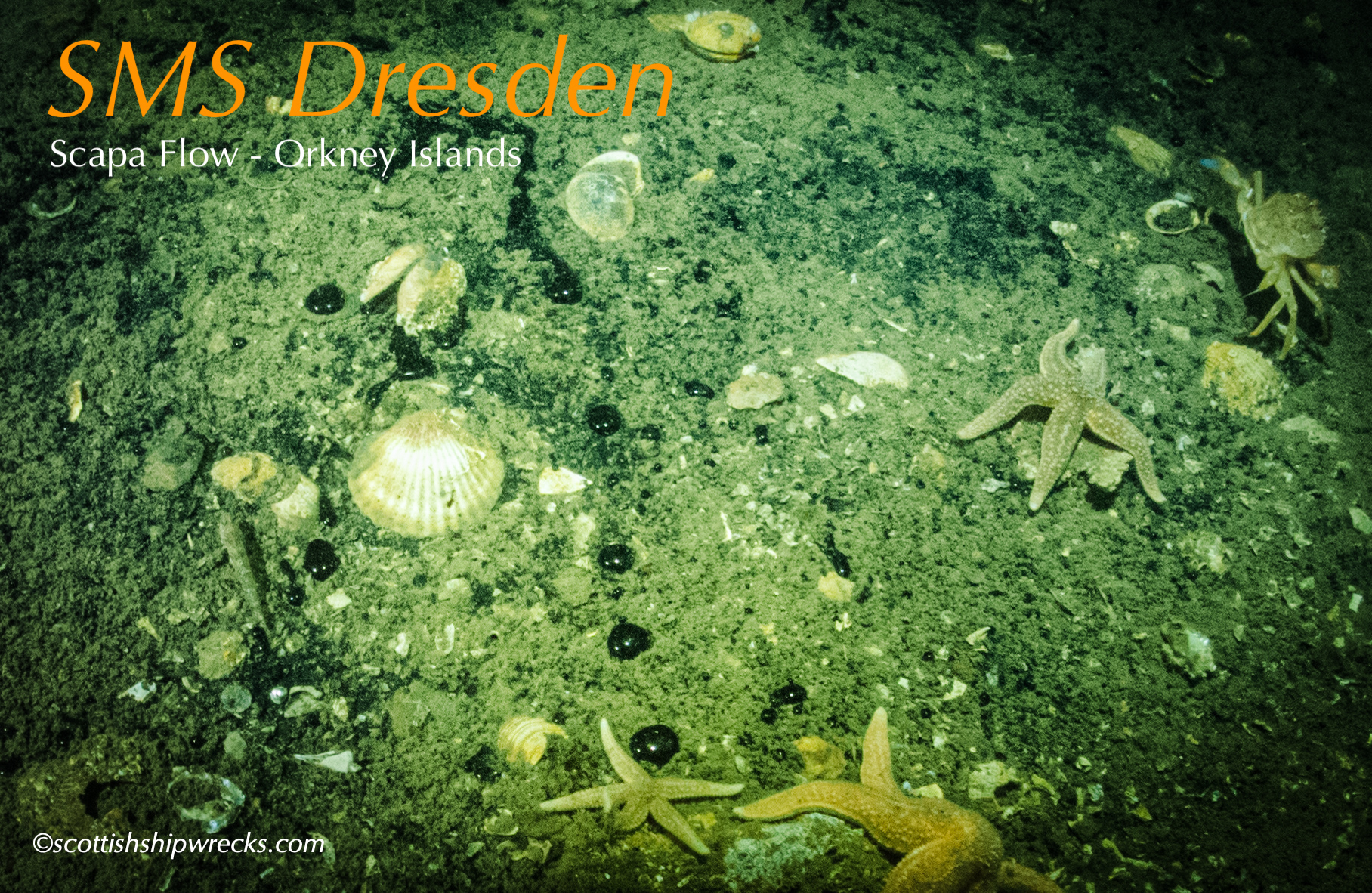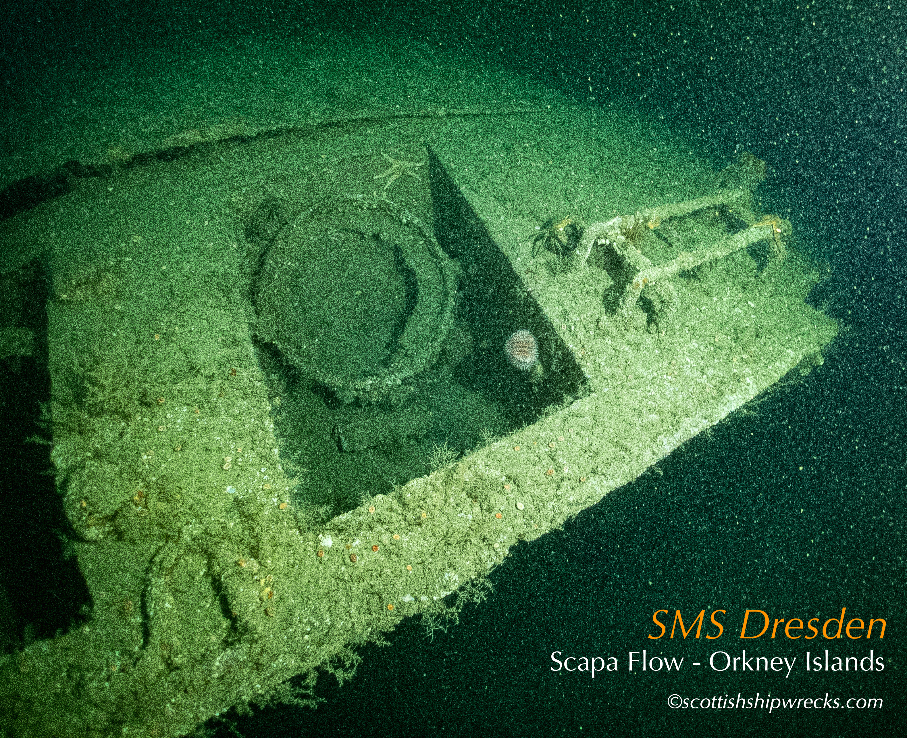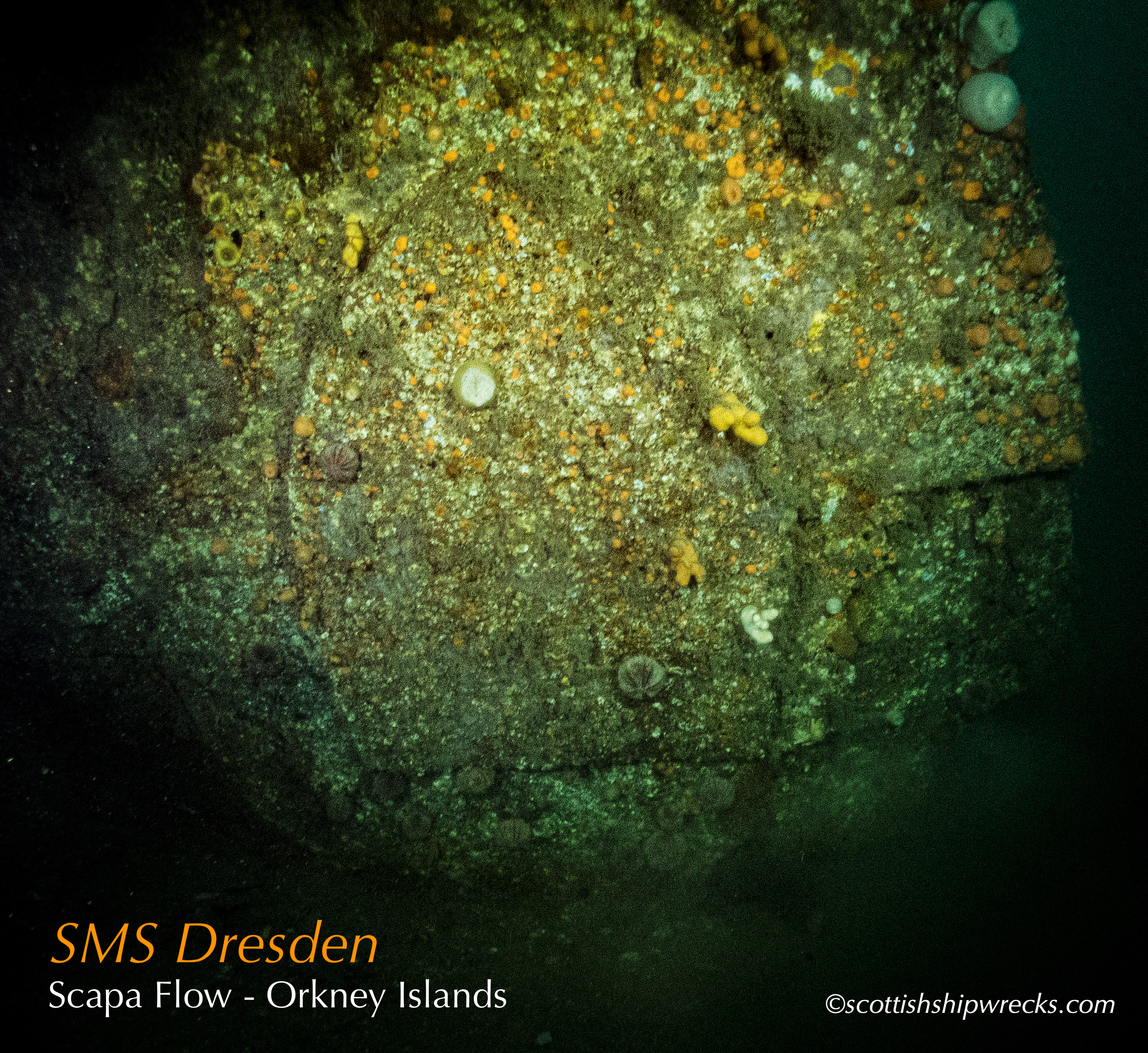 This section contain photographs of the wrecks as they lie on the seabed. These photographs have been taken over a period of many years up to and including very recently.  As such, the older photographs will not necessarily provide a view of the wreck as it exists today. However, the deterioration of the wrecks through time provides the viewer with an interesting insight into how a metal or wooden vessel will deteriorate over the years due to the action of the salty seawater and the Scottish weather. Underwater photography in Scottish waters is often a difficult exercise making the clarity of photographs taken extremely variable. The effects of rain water run off, plankton blooms, darkness and sometimes pollution provide visibility that can be 30 metres plus on offshore wrecks to as little as one metre in some cases in the Firth of Clyde or Firth of Forth. The skill of the photographer and the use of sophisticated photographic equipment and lighting combine to produce the best possible views of the wreckage but often pure luck contributes the best possible shots. The final colourful complication comes from the often beautiful colourful sealife that often encrusts the man made reefs that the wreck have become. The next section gives the viewer an idea of the typical types of sealife encountered on the wrecks.