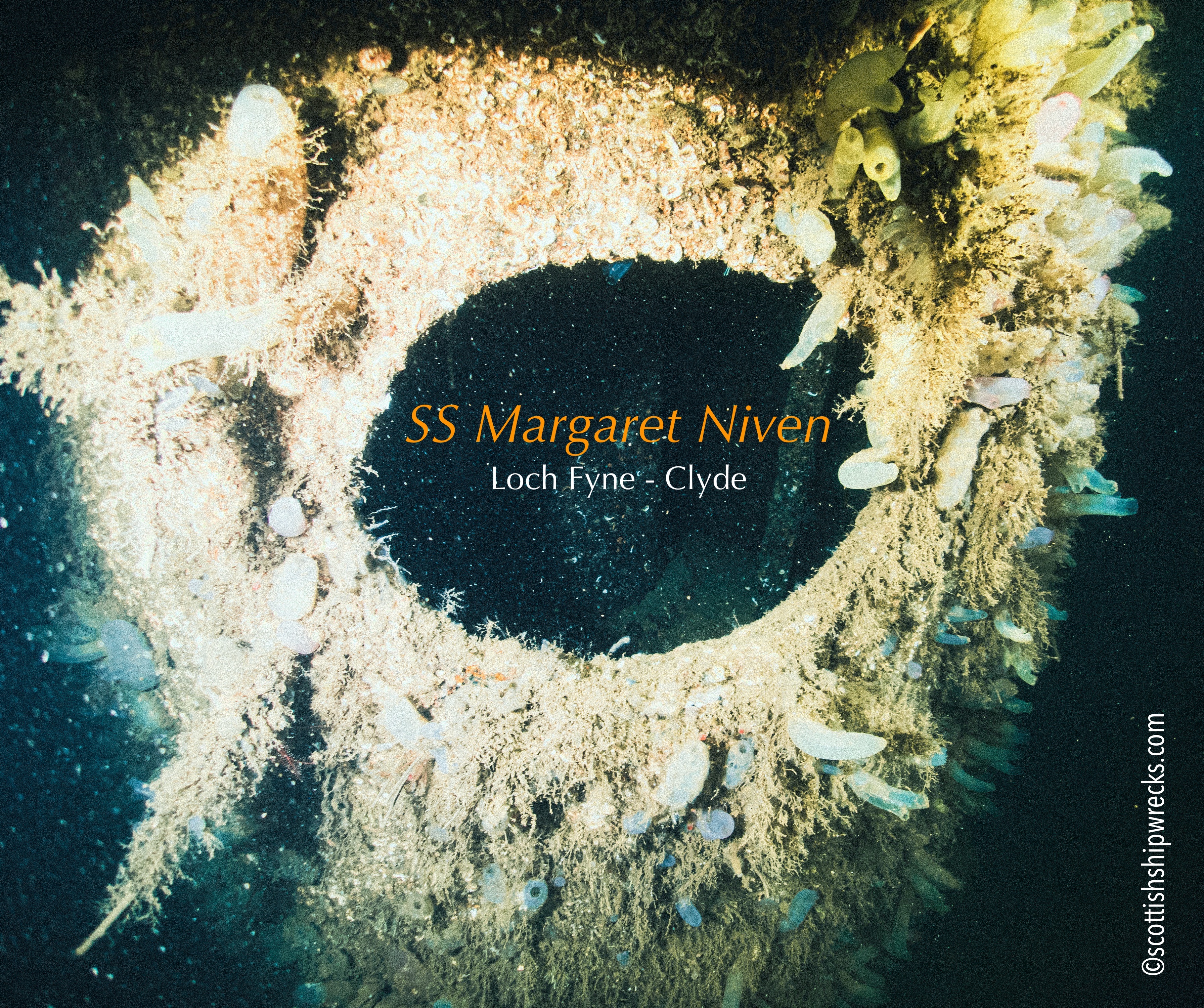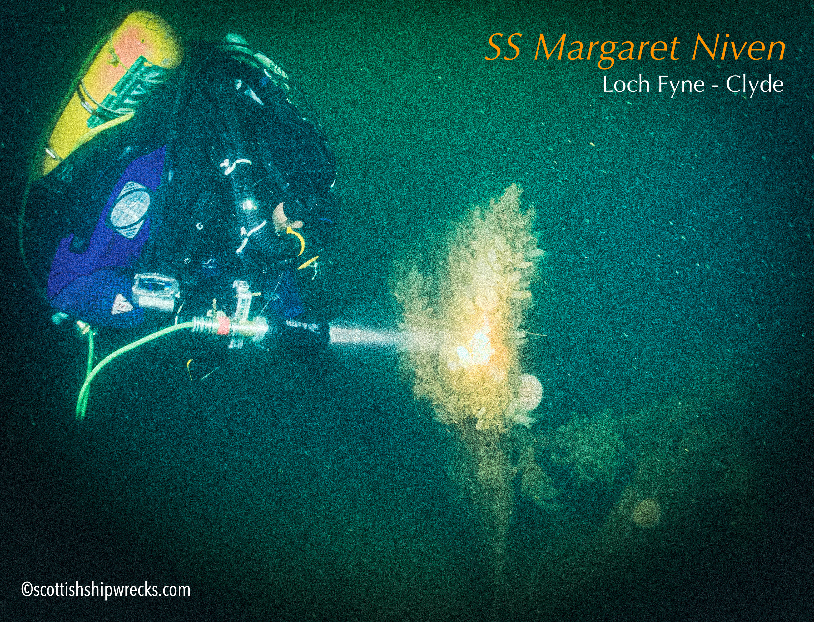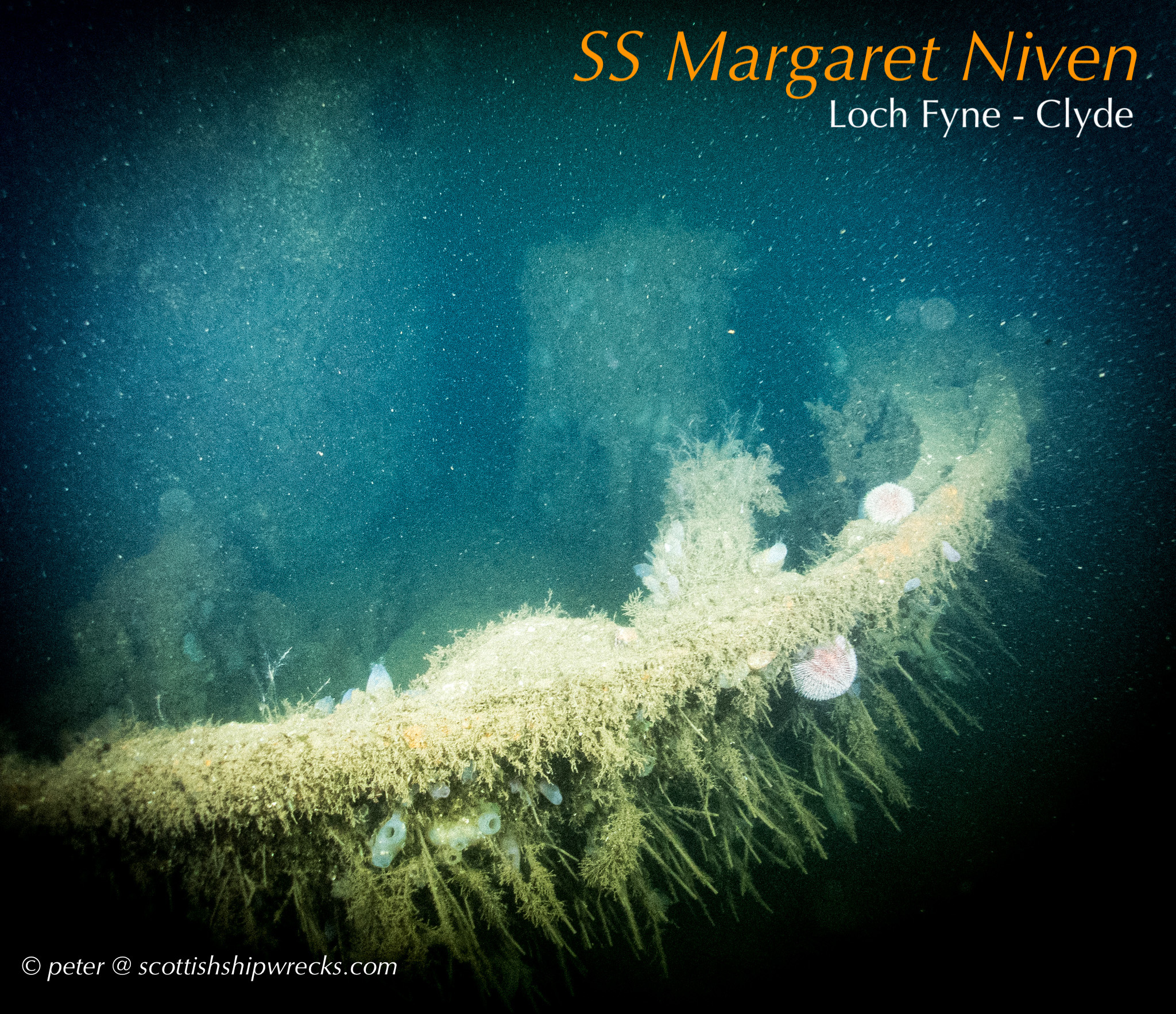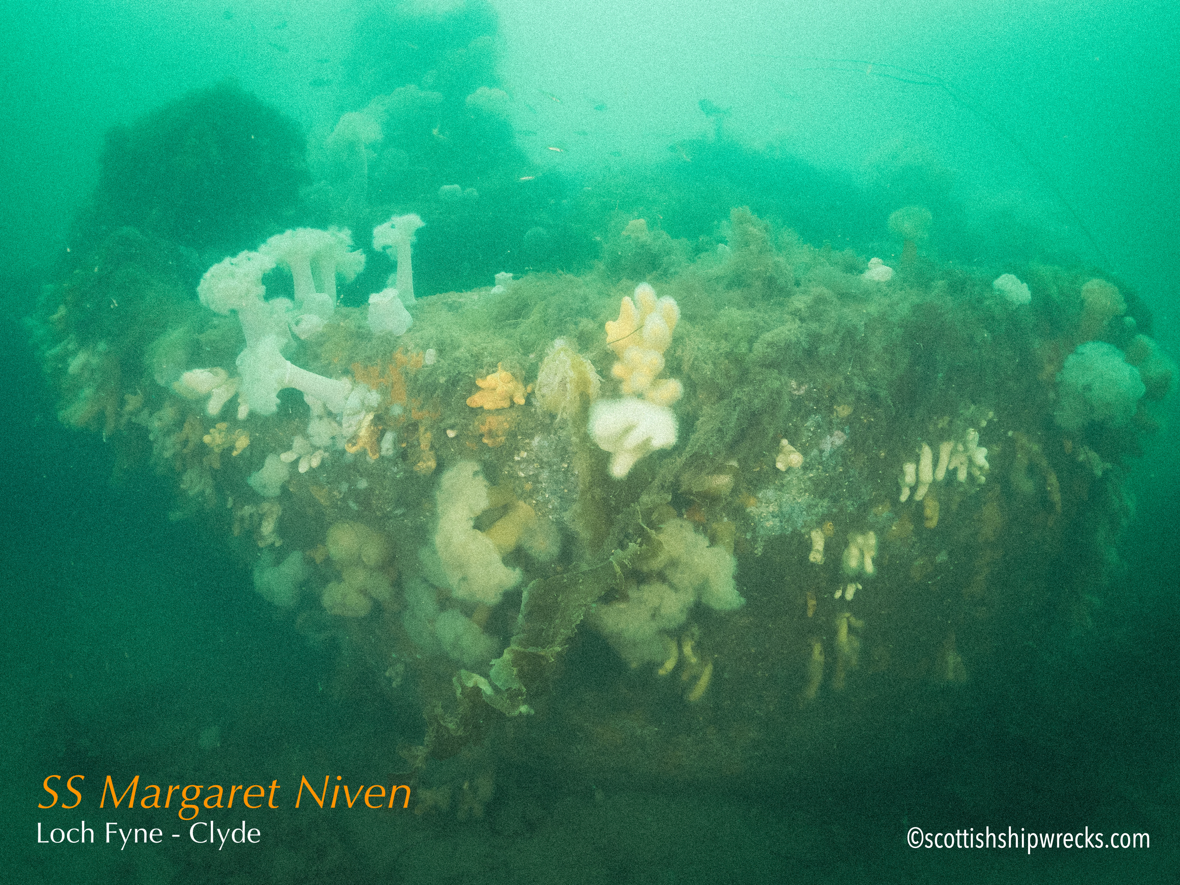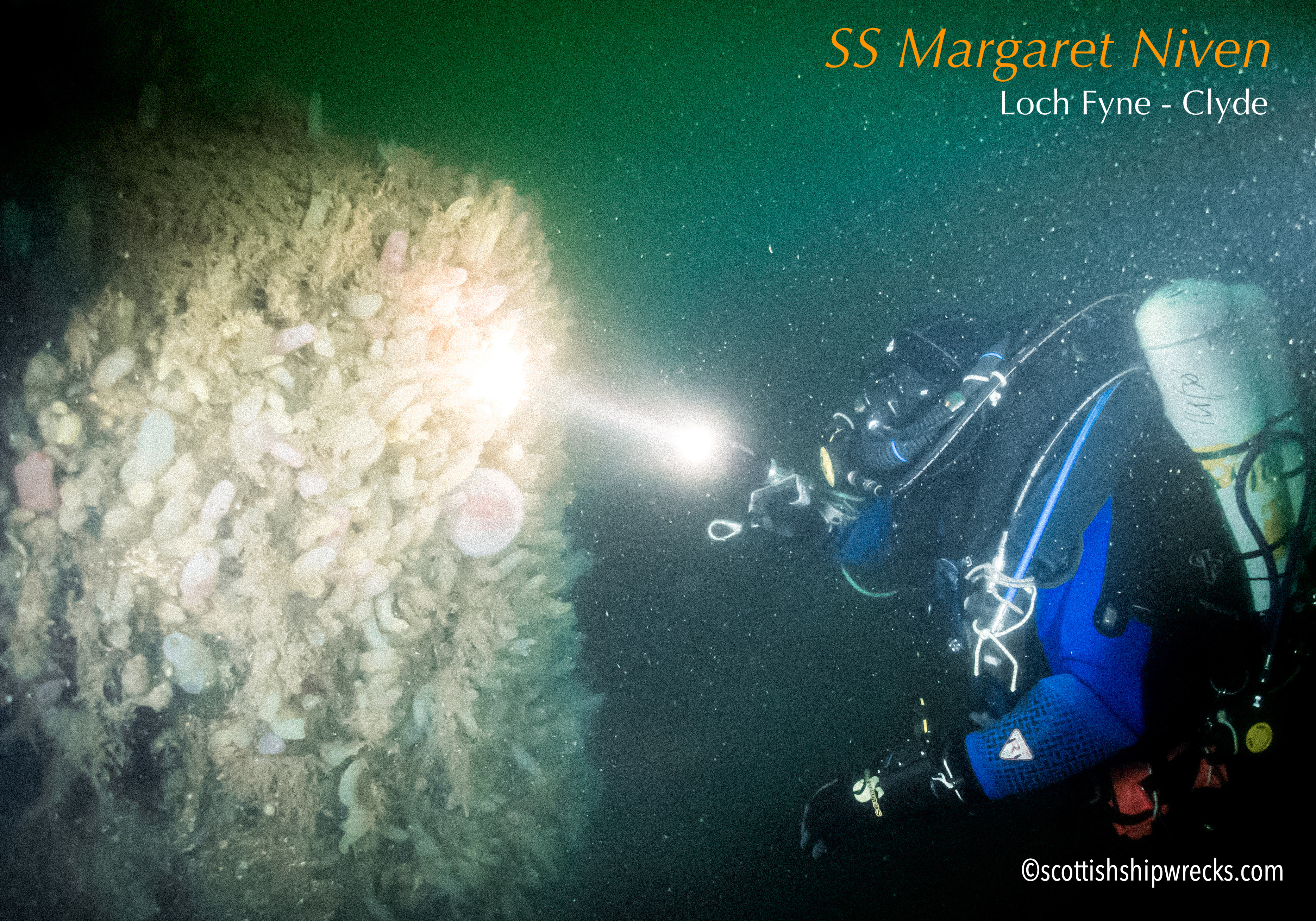 This section contain photographs of the wrecks as they lie on the seabed. These photographs have been taken over a period of many years up to and including very recently.  As such, the older photographs will not necessarily provide a view of the wreck as it exists today. However, the deterioration of the wrecks through time provides the viewer with an interesting insight into how a metal or wooden vessel will deteriorate over the years due to the action of the salty seawater and the Scottish weather. Underwater photography in Scottish waters is often a difficult exercise making the clarity of photographs taken extremely variable. The effects of rain water run off, plankton blooms, darkness and sometimes pollution provide visibility that can be 30 metres plus on offshore wrecks to as little as one metre in some cases in the Firth of Clyde or Firth of Forth. The skill of the photographer and the use of sophisticated photographic equipment and lighting combine to produce the best possible views of the wreckage but often pure luck contributes the best possible shots. The final colourful complication comes from the often beautiful colourful sealife that often encrusts the man made reefs that the wreck have become. The next section gives the viewer an idea of the typical types of sealife encountered on the wrecks.