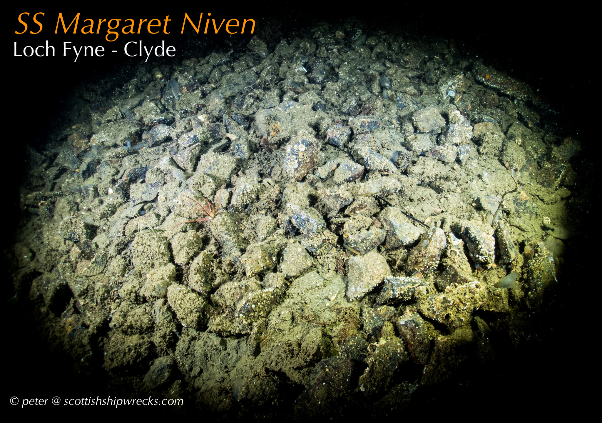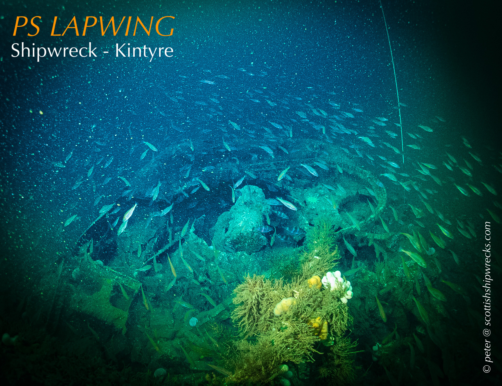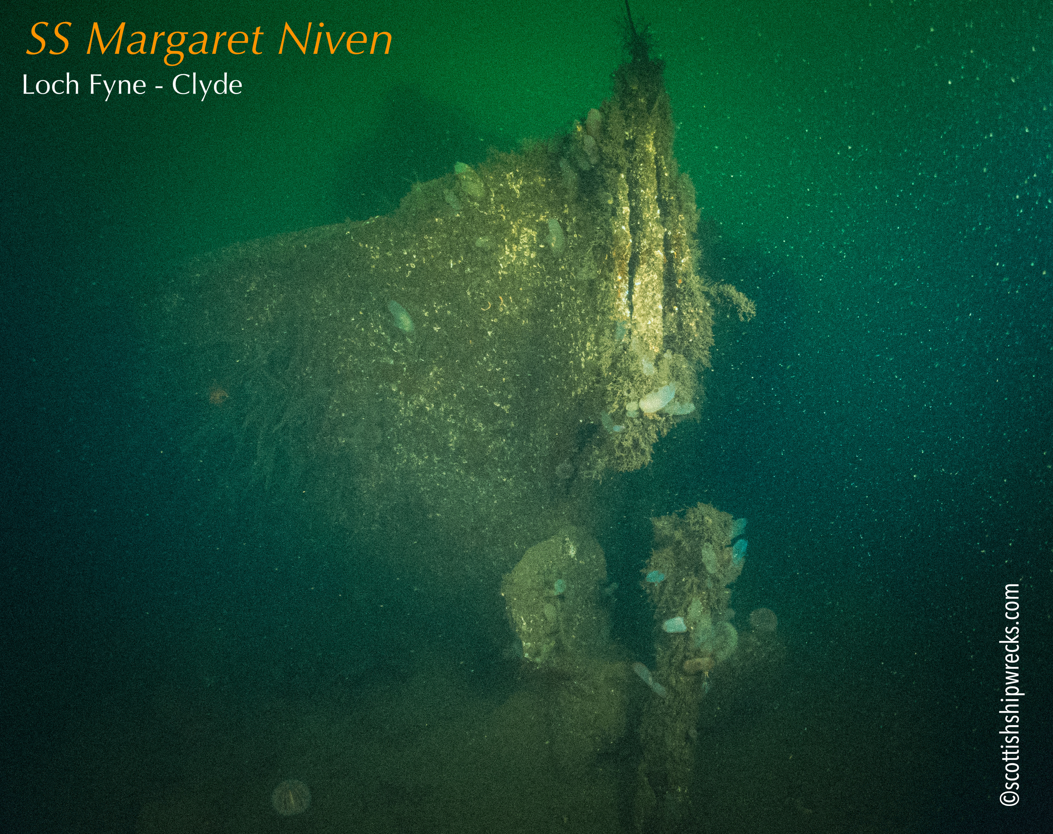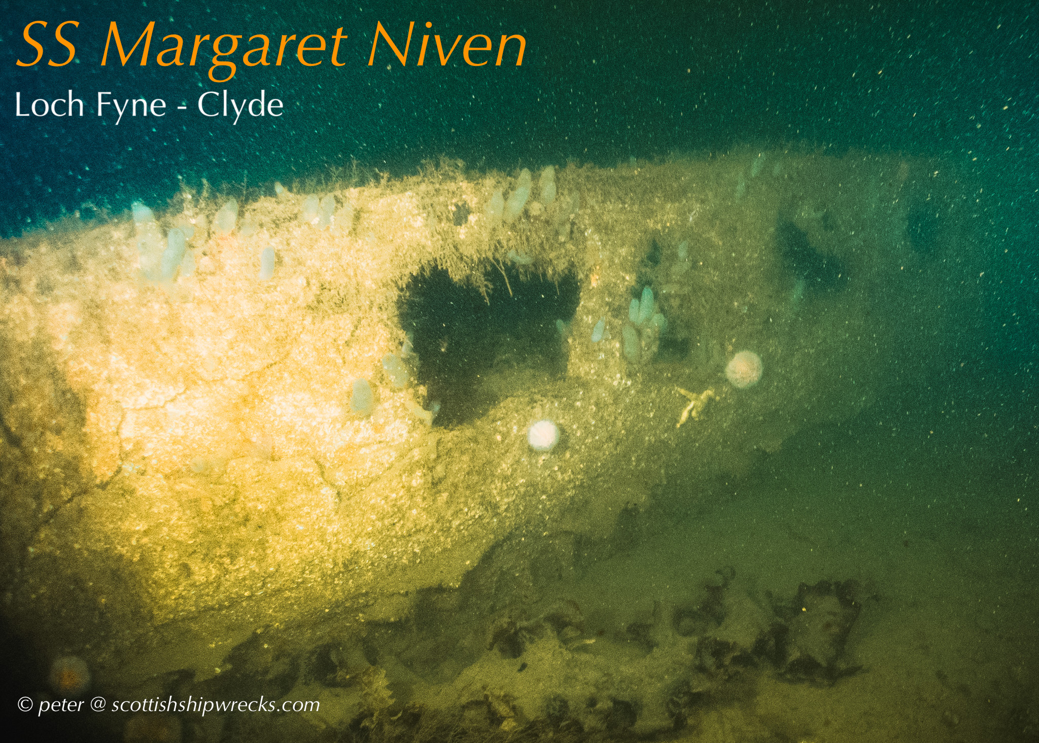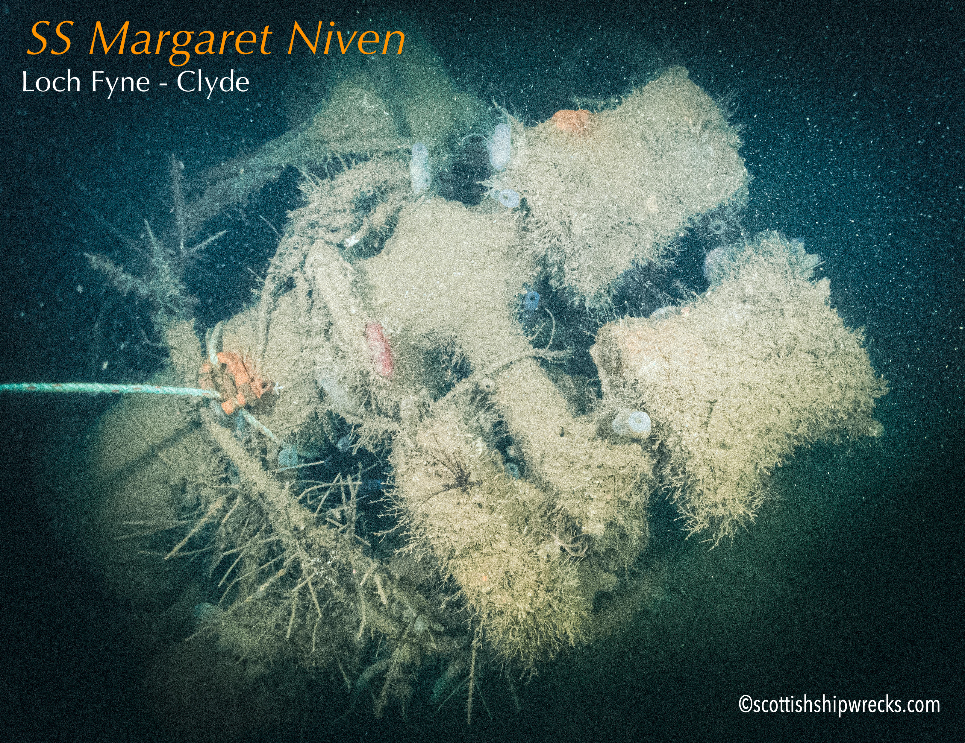 This section contain photographs of the wrecks as they lie on the seabed. These photographs have been taken over a period of many years up to and including very recently.  As such, the older photographs will not necessarily provide a view of the wreck as it exists today. However, the deterioration of the wrecks through time provides the viewer with an interesting insight into how a metal or wooden vessel will deteriorate over the years due to the action of the salty seawater and the Scottish weather. Underwater photography in Scottish waters is often a difficult exercise making the clarity of photographs taken extremely variable. The effects of rain water run off, plankton blooms, darkness and sometimes pollution provide visibility that can be 30 metres plus on offshore wrecks to as little as one metre in some cases in the Firth of Clyde or Firth of Forth. The skill of the photographer and the use of sophisticated photographic equipment and lighting combine to produce the best possible views of the wreckage but often pure luck contributes the best possible shots. The final colourful complication comes from the often beautiful colourful sealife that often encrusts the man made reefs that the wreck have become. The next section gives the viewer an idea of the typical types of sealife encountered on the wrecks.