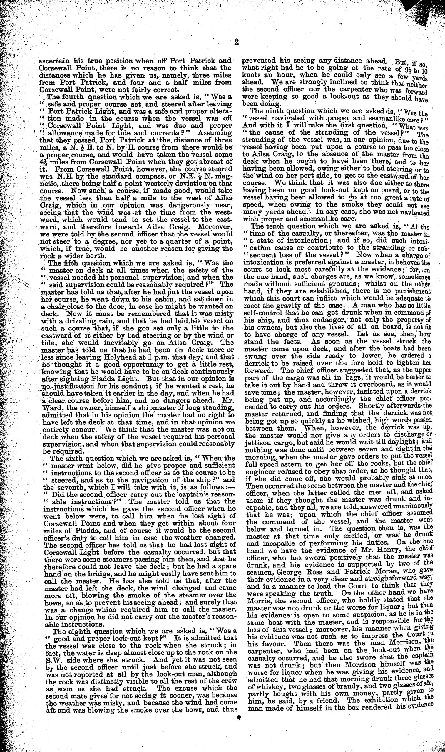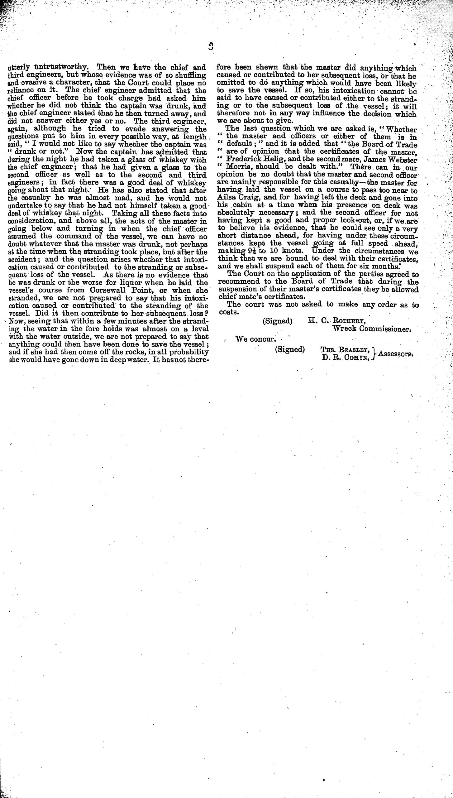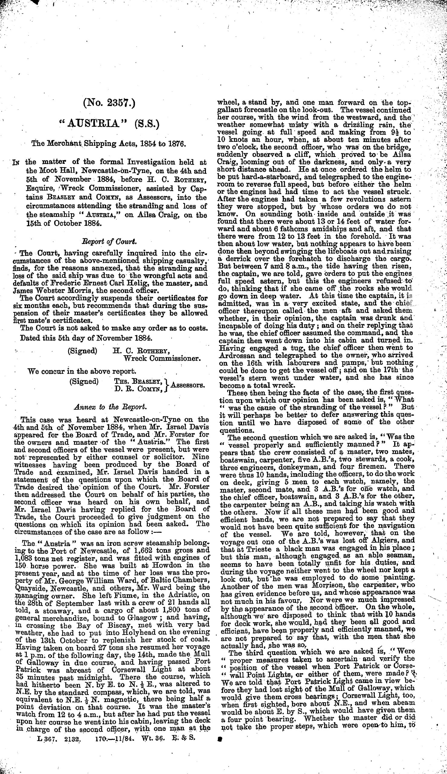 At a subsequent enquiry, Captain Helig and second officer James Morris were jointly found responsible for the loss of the Austria. Captain Helig was severely censured for having laid a course from Corsewall Point which, at best, would have taken the Austria half a mile west of Ailsa Craig. James Morris was criticised for not keeping a proper lookout, especially after stating in his own evidence that his vision had been impaired by smoke from the funnel blowing across the bridge. Both men had their master’s certificates suspended for six months. Captain Helig was charged with drunkeness in command of the vessel but this was never fully proven, although in evidence various crew members stated that a good deal of alcohol had been consumed that night.