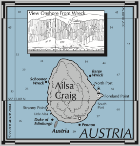 Although not positively identified as such, the authors are of the opinion that what remains of the Austria, after extensive salvage activity, lie off the south coast of Ailsa Craig in approximate position 55° 14.783’N, 005° 07.250’W (GPS). The wreck located here is of a large steamship heavily broken and scattered among the boulder shingle seabed, lying in general depths of 10 to 20 metres. However, wreckage has also been found in deep water between 30 and 35 metres and again 200 metres west of the reported position in 20 metres. It is not known whether they are all part of the same wreck.