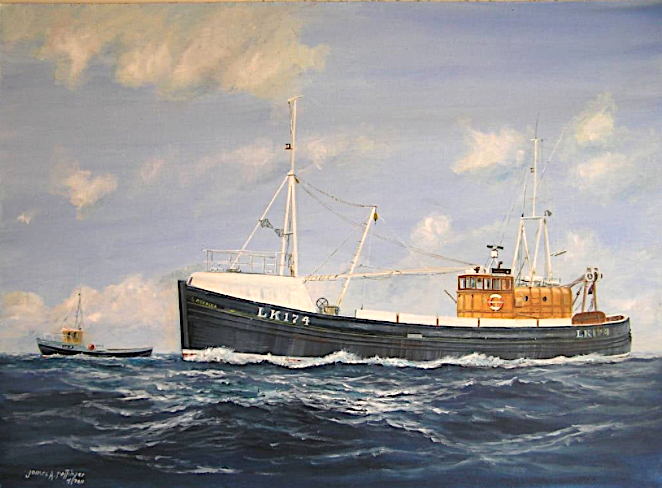 The wooden motor trawler Lilt was launched from the Buckie yard of George Thomson & Son (Yard No 29) in December 1949. She measured 65.7′ x 19.2′ x 8.5′ and her tonnage was 49 gross tons. She was powered by a diesel engine provided by Blackstone & Co Ltd, Stamford delivering 160 brake horse power. Built to the order of three partners George Coull, James Coull and Philip Mustard of Buckie, she was registered and operated from that port with a fishing registry of BCK 43. Following re-build and engine works she passed to new Buckie owners in 1967 and was renamed as Avrella. In 1974 she was sold to Shetland owners and re-registered as LK 174 where she remained for the rest of her fishing career finally retiring in 1985 when her fishing registry was cancelled.