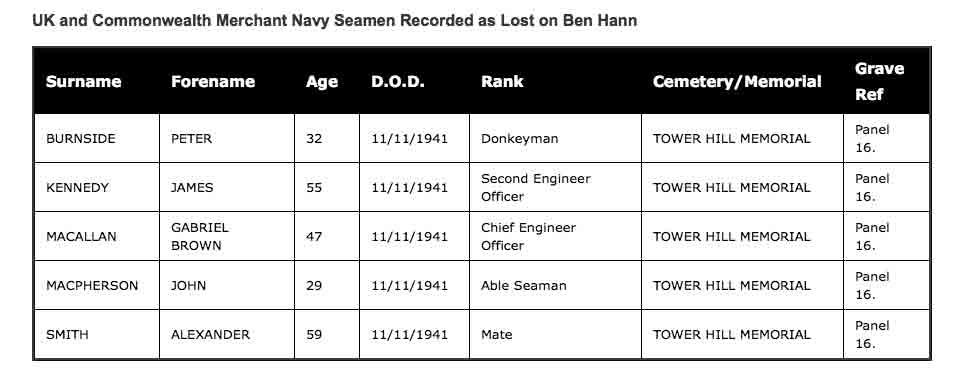 There is very little information recorded about the circumstances of her loss. In fact her exact location was only confirmed in 2012 with the discovery of the makers plate on the wreck. Up to this date the story can be simply told as follows. On the 10th November 1941 she left Fort William en-route to Bowling where it is believed she was to undergo repairs. The vessel was under the command of James Eynon – Master who had a total of ten crew on board. It is believed the Ben Hann was sighted sometime on the 11th November, off Kintyre, but nothing else was reported until two life belts and a life raft were found ashore on Islay, five miles east of Port Ellen, a few days later. Searches were made over the following days but no trace of the vessel could be found. Bodies of five of her crew later washed ashore and were buried at Islay, Berneray, Cardiff and Drumtemple. The five crew unaccounted for are listed on the Merchant Seaman memorial at Tower Hill, London.