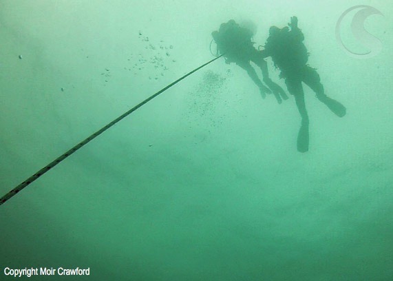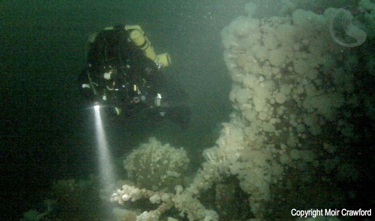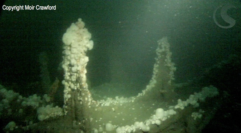 The wreck of the Ben Hann lies in 61-62 metres on a flat mud and shell seabed in position 55°30.298’N 005°51.412’W. She lies 045/225° with her stern to the north. The hull rises no more than 2-3 metres above seabed level and what is left of the engine room casing perhaps another 2.5 metres. Most of the superstructure has fallen over the side or onto the fore deck. There are holes in the side of the engine room and aft accommodation where plates have fallen away allowing a diver see into the heart of the ship.