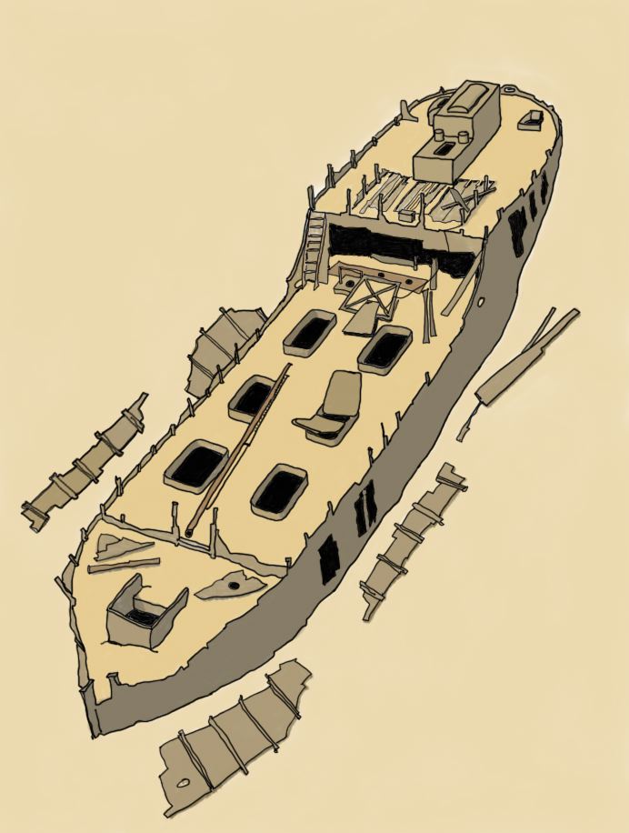 The fore deck area is around 60 metres deep and is thought to be made up of six tanks, each with its own access hatch and ladder disappearing into the gloom. The high foc’sle has fallen onto the seabed all-round so the fore deck is flush from forward engine room bulkhead to stem post. Debris litters the fore deck including the main mast. There are a number of square frames with diagonal bracing lying on the fore deck and, from reviewing pictures of one of her sister ships, the Ben Henshaw, these would appear to be supports for an elevated walkway that would have linked the bridge and the foc’sle. The aft deck on the Ben Hann has a small rectangular housing over the engine room, but little else of the bridge remains other than an outline of its base on the deck.