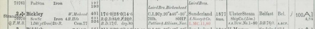The iron steamship Bickley was launched from the Monkwearmouth yard of Alfred Simey and Co Ltd (Yard No 51) in April 1877. She measured 176.0′ x 28.0′ x 14.6′ and her tonnage was 631 gross tons, 401 net tons. She was powered by a 2 cylinder compound steam engine by Pattison and Atkinson, Newcastle delivering 80 registered horse power. Her official number was 76970. She was built for Pile and Co Ltd., London and was sold to the Ulster Steamship Company (G Heyn and Sons) Belfast in 1884.