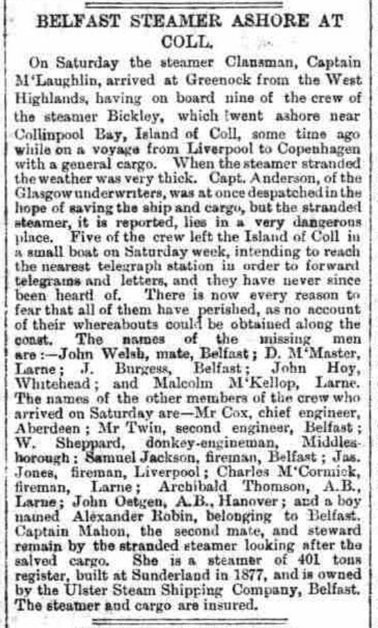 Salvage crews were quickly on the scene to begin removing her general cargo and it was expected that the ship herself, which was lying down by the head with her forehold full of water, would also be saved. Contemporary records don’t reveal whether attempts to refloat her were actually made or indeed if she was finally removed. The authors believe that she was substantially salvaged but that the large boiler in position 56° 33.973’N, 006° 39.655’W , which lies in 10 metres of water on the east side of the rock charted in the centre of Crossipoll Bay approximately half a mile east of Runan Faochag, is likely to be from the Bickley.
