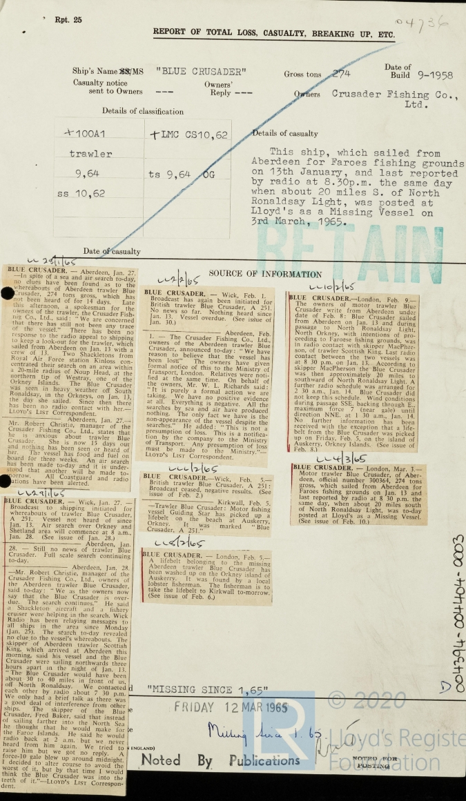 We would like to thanks Lloyd’s Register Foundation – Heritage & Education Centre for allowing us to reproduce documents from their archive in this article.