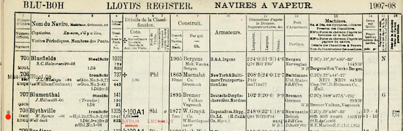 The iron steamship Blythville was launched from the yard of William Gray and Co Ltd., Hartlepool (Yard No 171) on 28th July 1877. She measured 248.0′ x 32.1′ x 18.4′ and her tonnage was 1394 gross tons, 897 net tons. She was powered by a 2 cylinder compound steam engine by North East Marine Engineering Ltd delivering 120 nominal horse power. Built for William Gray’s own shipping line she was sold to H Cail of Newcastle in 1906 became part of Cail’s Zapata Steam Shipping Co Ltd of Newcastle in 1907. Her official number was 78402.