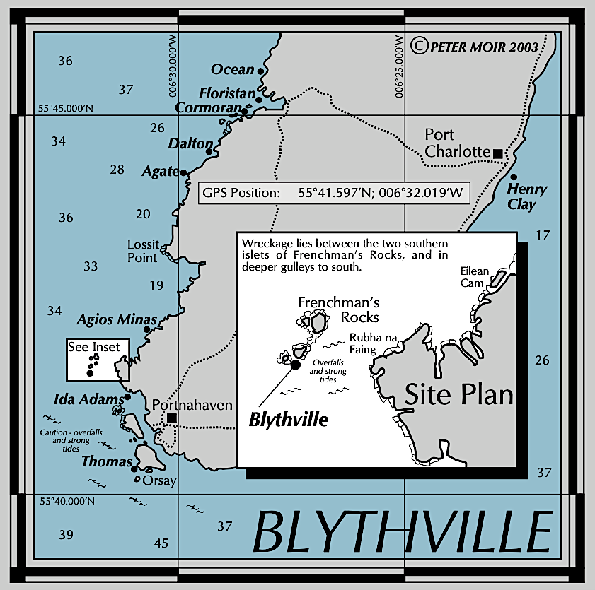 The scattered wreckage of the Blytheville lies around 8 metres of water in position 55° 41.597’N, 006° 32.019’W. Much of the wreckage lies in a narrow gulley at the south west corner of Frenchman’s Rocks. The stern section is most in tact and engine and boiler are still visible. Tides around the rocks are ferocious so great care must be taken when diving the site and slack water is essential.