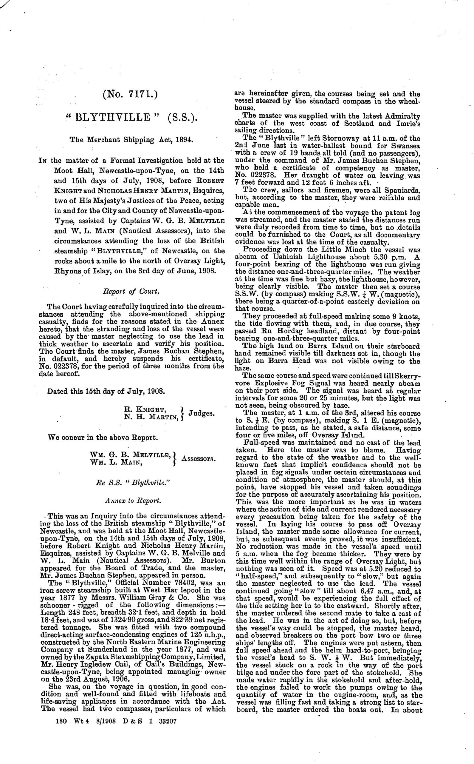 By 5:30am the captain was getting concerned and he slowed his speed to half then again to slow ahead at 7am. Shortly afterwards he ordered the mate to get out the sounding lead but before this could be done they heard breakers close by and almost immediately they sighted rocks three lengths ahead of their ship. The engines were reversed and the helm put hard over but it was too late. The Blytheville ran aground striking the Frenchman’s Rocks near her port bilge and within minutes the engines and pumps stopped as water poured into the engine room. The vessel had a heavy list to starboard and, as it was clear that she was about to sink. The crew launched and boarded the ship’s boats and reached the shore safely. When the captain returned later with some locals the ship had slipped off the rocks and vanished. At the subsequent inquiry his certificate was suspended for three months. The court held that he had not navigated his vessel in a seamanlike manner as he had failed to use the sounding lead to verify his situation.