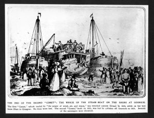 The Comet II was a paddle steamer built by James Lang at Dumbarton and launched in 1821. Her wooden hull measured 81.0′ x 13.8′ x 9.0′ . She was powered by a single cylinder steam engine supplied by Duncan McArthur of Glasgow. She was lost in one of the earliest and most catastrophic of steamship disasters on the Clyde. She was built to replace the Comet I, the pioneer of commercial steamship navigation, which was wrecked off Craignish Point, Argyll in 1821.