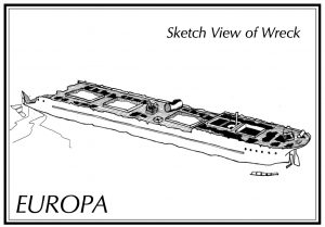 Virtually all that remains of the Europa is the bare hull. The lack of any deck structures is possibly due to the wreck having been wire swept at some stage although, given the depth she lies in, this is unlikely, or that all the deck structures were timber and have subsequently disintegrated. The bow section has collapsed onto the seabed forward of the main foredeck hatch.