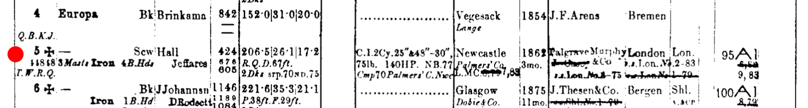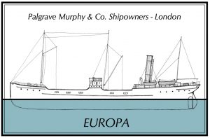 The iron steamship Europa was launched from the Jarrow yard of Palmer’s Shipbuilding and Iron Company (Yard No 110) on 7th April 1862. She measured 206.5′ x 26.1′ x 17.2′ and her tonnage was 678 gross tons, 424 net tons. She was powered by a compound steam engine by Palmer’s delivering 90 registered horse power. Her engine was later updated by Palmer’s providing additional power delivering 140 registered horse power. Built for the London Steam Navigation Company (Fenwick and Pickernell) Ltd she was sold to her final owners, Palgrave, Murphy (Dublin) and Co Ltd in 1883.