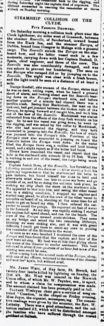 Fate played a hand in the collision between the steamships Europa and Roseville on Saturday 11th October, 1884. If the carpenter of the Europa had signed on as arranged, she would not have been delayed and would have passed the tragic spot off Levan Castle hours earlier. The Europa had departed from Glasgow for Malaga the previous afternoon with 850 tons of general cargo. Around 7pm the same day she anchored off Greenock while Captain Bushell went ashore to hire another carpenter. He returned to his vessel around 11pm and the Europa proceeded on her voyage soon after. On passing McInroy’s Point shortly after midnight, the bow lookouts reported the lights of an incoming vessel dead ahead. These lights belonged to the SS Roseville, en route from Taganrog to Glasgow with 1850 tons of barley. As the two vessels closed the Europa started to cut across the track of the Roseville. The cries of alarm from the lookouts were too late for any evasive action to be taken. The vessels, both travelling at full speed, collided almost head on. The Europa was struck about her starboard hawespipe and cut through to the front of her main foredeck hatch. Panic and confusion ensued on both vessels, as the Europa began to fill and settle down. Some of her crew were in their bunks at the time and they rushed on deck, half naked. They, and several others on duty, scrambled aboard the Roseville. Unhappily, not everyone on board the Europa was so fortunate as she sank quickly, some three minutes after the collision, carrying with her Captain Bushell and four of her crew. Boats were immediately launched from the Roseville to search for survivors, but nothing was found except large quantities of floating debris.