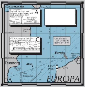 The Europa lies east of Cloch Point, in position 55°57.083’N, 004°52.112’W. Sitting upright on a gently sloping mud seabed with bow pointing south, the wreck is oriented about 005°/185°. Seabed depths vary from 40 metres at the stern to 34 metres at the bow. Depths on the wreck average 32 metres, however, this will increase below deck level in such areas as the engine room or stern accommodation.