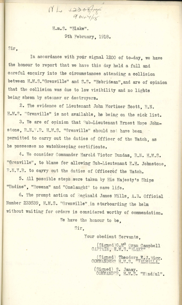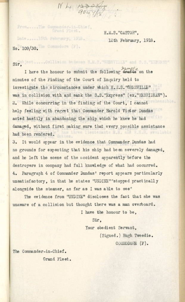 The collision, the subsequent loss of the Express and everyone aboard and in particular the actions of Commander Dundas following the collision, were the subject of an Admiralty enquiry and then a legal tussle between the owners and the Navy to establish responsibility for the accident. The naval enquiry found that the collision was an accident primarily as a result of the ships running without lights and the low visibility at the time of the collision. Some concern was recorded relating to Dundas and in particular his hasty departure from the scene following the incident. He was also criticised for allowing Sub-lieutenant Ernest Johnstone RNVR to act as officer of the watch when he was not permitted to do so as he had no watch keeping certificate. However, they did not believe this had contributed in any way to the accident. In April 1919 the owners of the Express took legal action to attempt to secure financial retribution for the loss but the court held that neither party was to blame and, like the earlier naval enquiry, the collision was the result of the ships running with no lights in poor visibility.