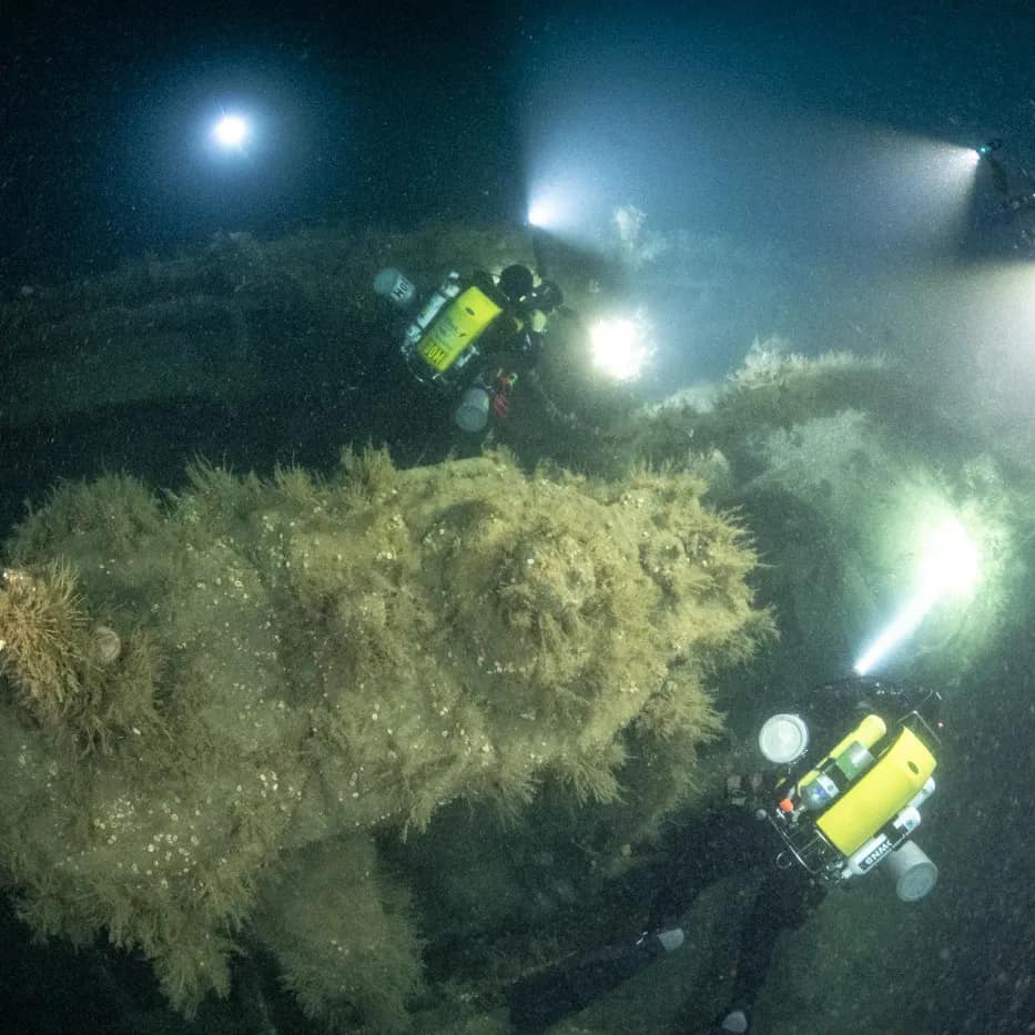 The wreckage believed to be the Express was first dived in 2023 with the main section lying in position 58 49.430 N, 002 21.766 W oriented 035/215 degrees. The wreckage, which proved to be of a steamship with a compound steam engine with the stern missing lies in 79 metres with a least depth clearance of 75 metres. The expedition’s dives did not provide any definite proof of the identity of the vessel but the position of the wreck and the missing stern section make it more or less certain this is indeed the Express. It is also believed that, although it was not investigated by the dive team, the nearby obstruction in position 58 49.390N, 002 21.799W which is surveyed 7 metres long, is the stern section of the Express.
