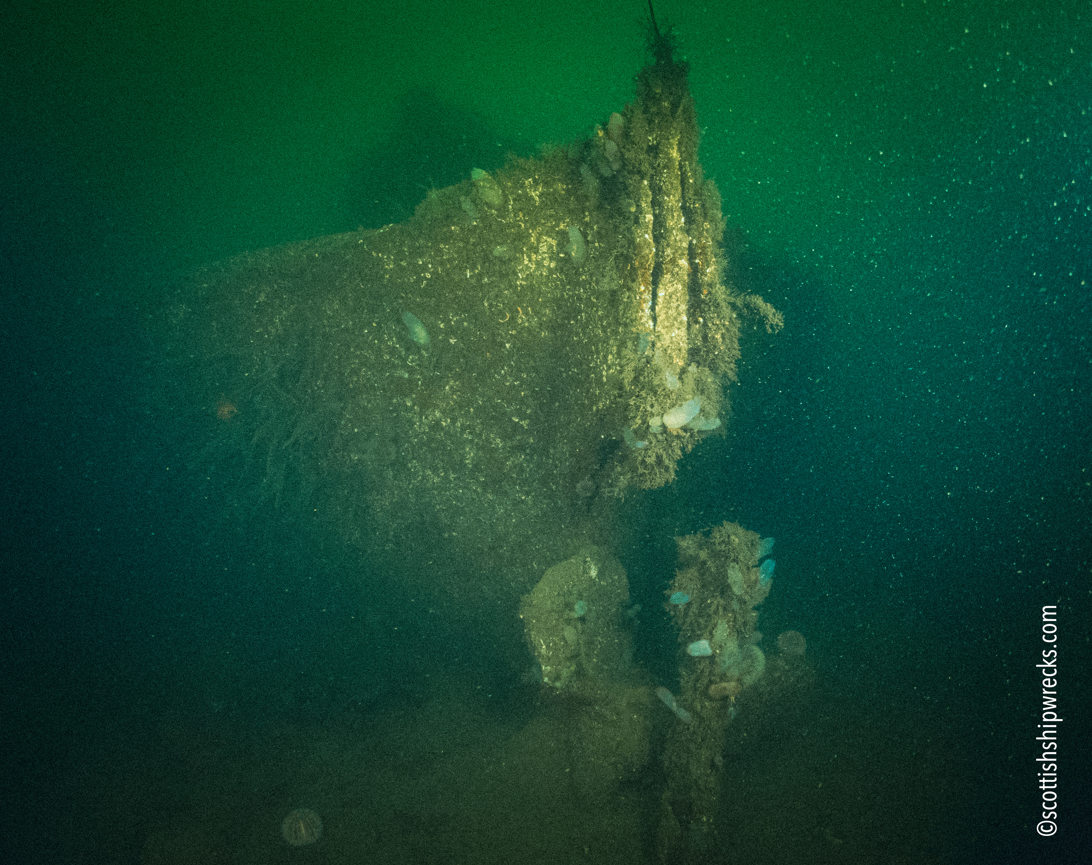 Friday Dive – the Margaret Niven was a small iron steamlighter launched in 1866 at Port Glasgow. The 63 foot long vessel was on a voyage from Crarae Quarry, Loch Fyne to Glasgow with a full cargo of stone chips when she ran aground north of Tarbert, Loch Fyne in 1908. The wreck lies on a muddy seabed 50 metres north east of a small reef known locally as the “Bauld Heid”, aka Sgeir Mhada Cinn, just north of Barmore Island. The reef is marked by a metal pole, positioned at a suitably jaunty angle. The wreck lies between 24 and 28 metres on a gently sloping mud and stone seabed, the remains are essentially the hull, damaged propellor, vertical boiler, small engine, bow winch and her cargo of stone chips. We will upload a page on this wreck shortly, but here are some images from the dive with visibility around 3-4 metres.