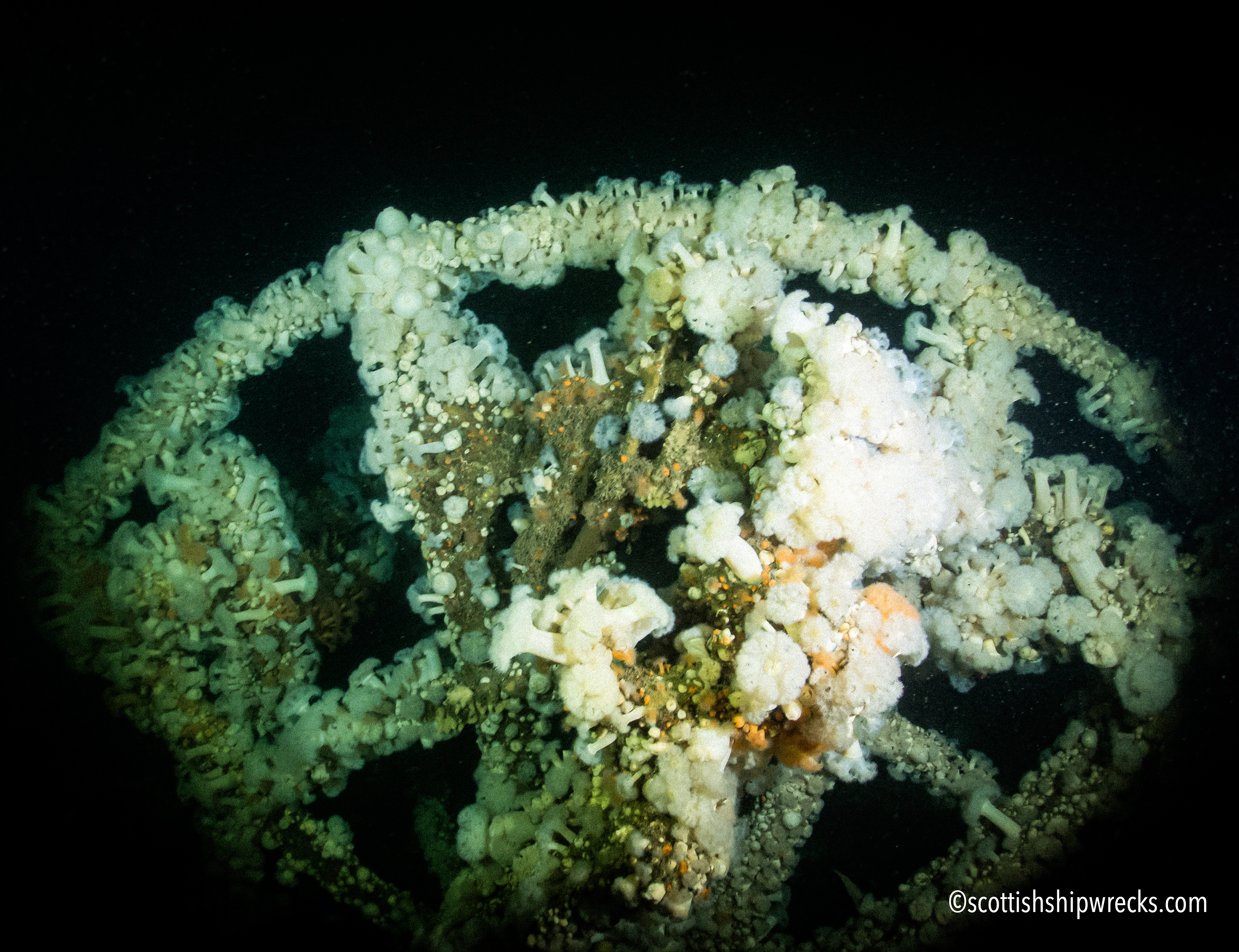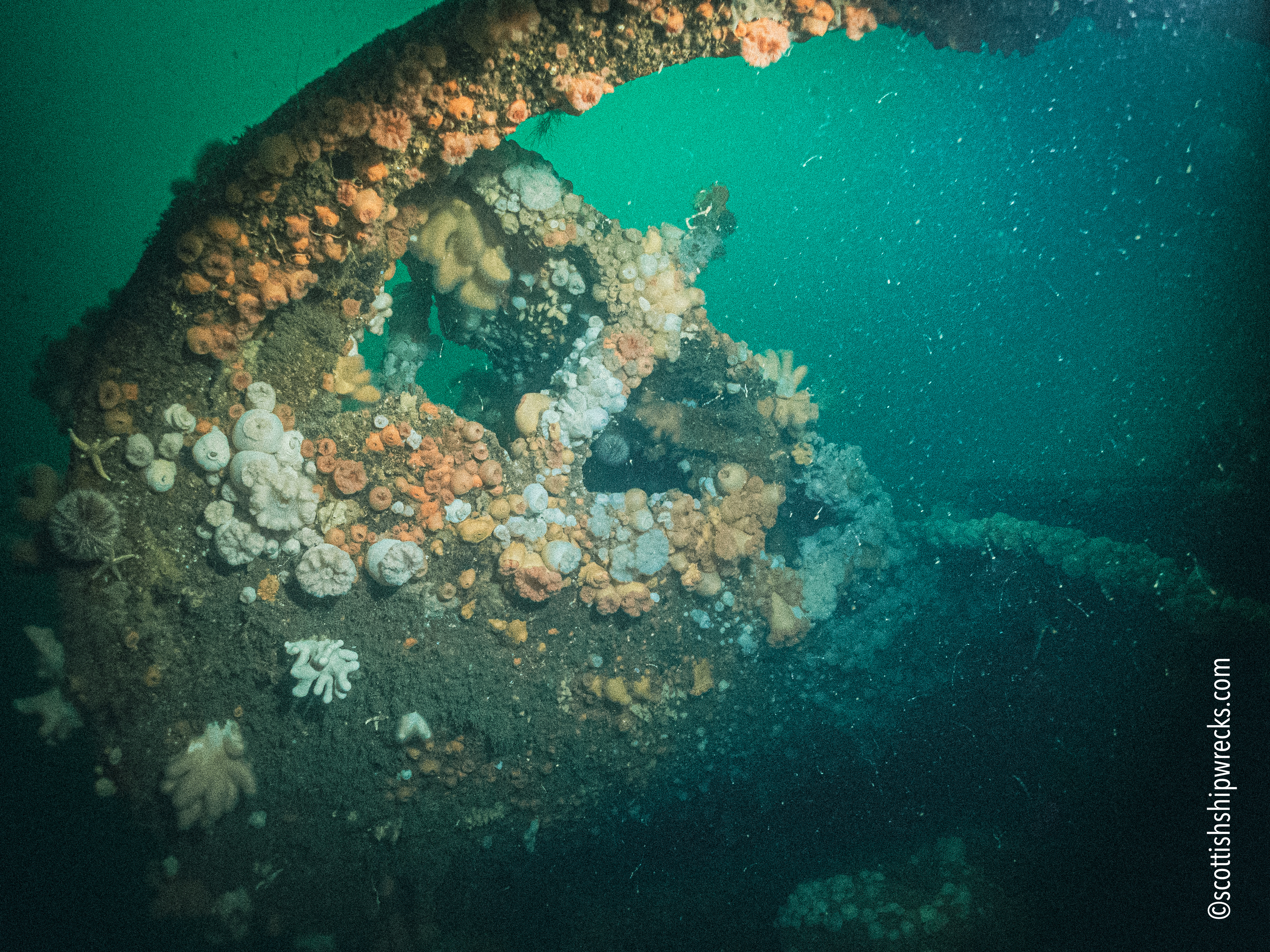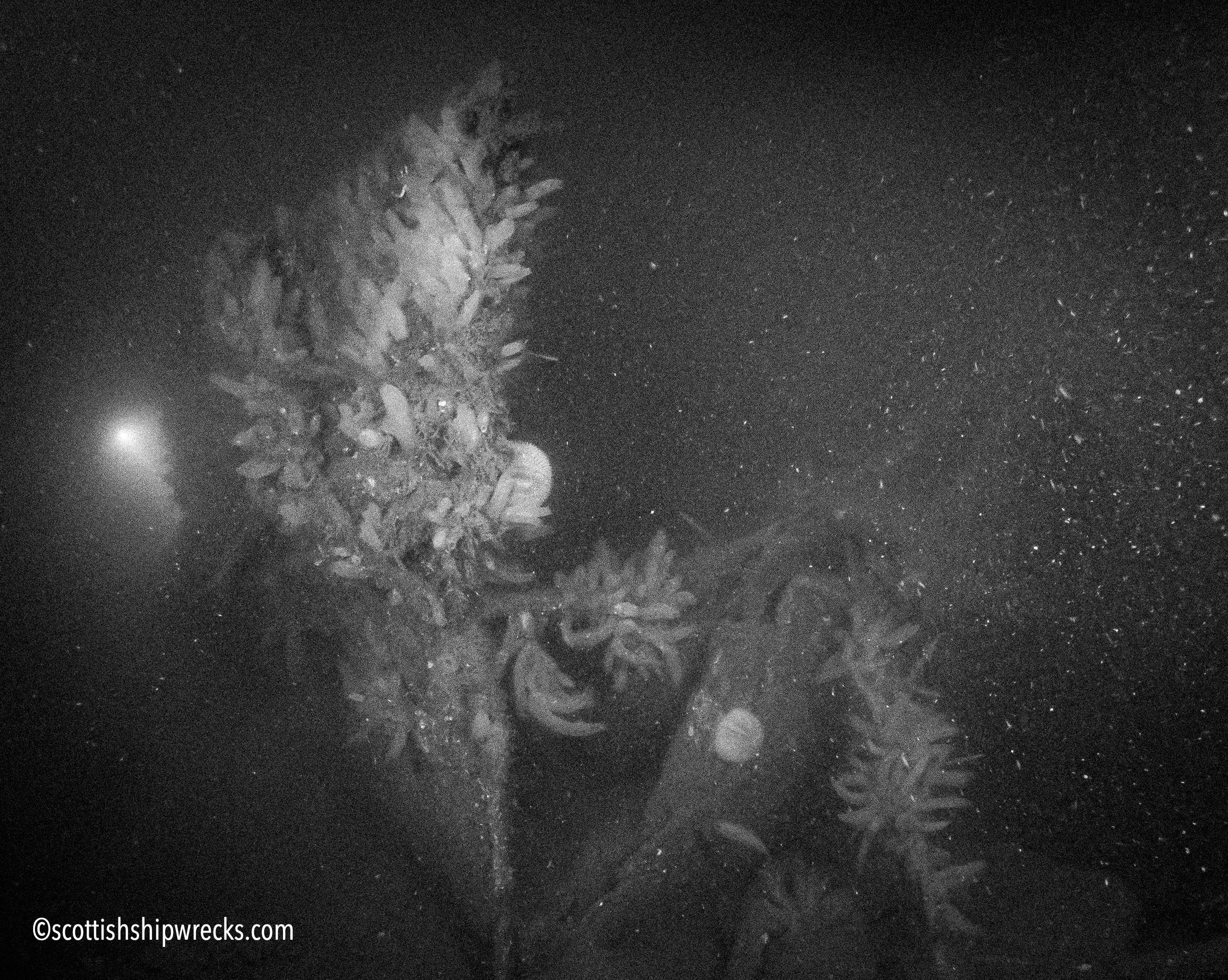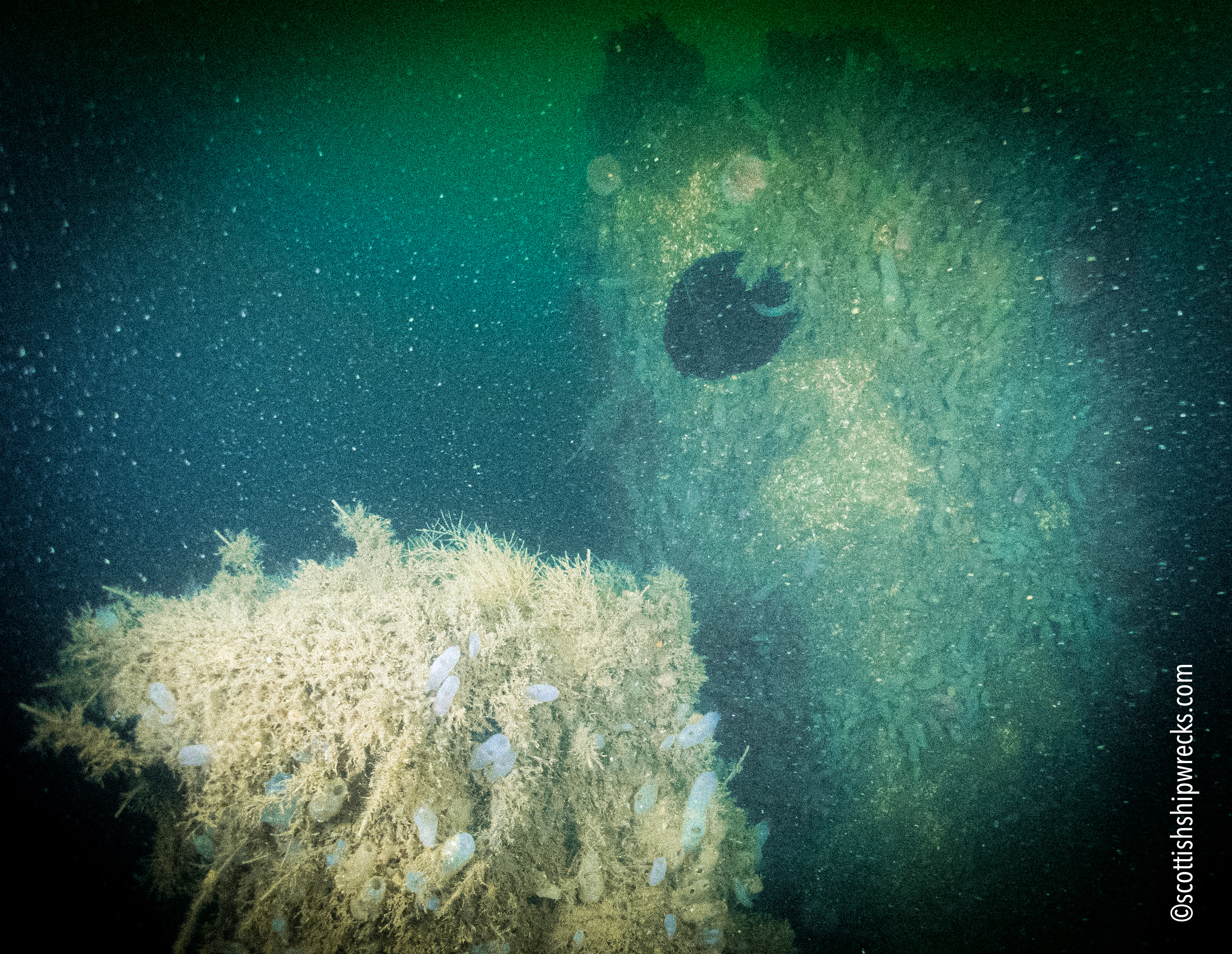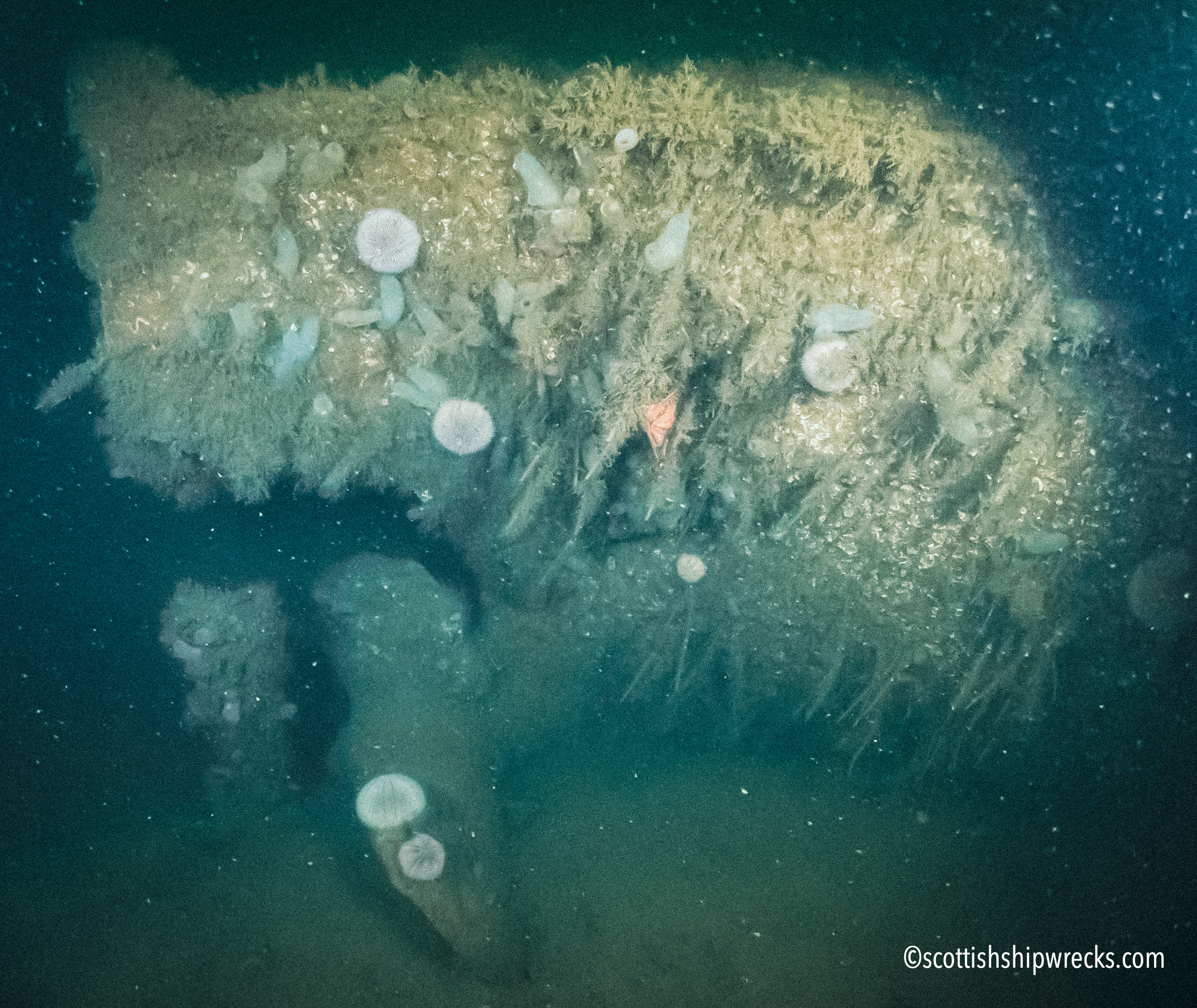 The second wreck to be visited was the Universe, fortunately she has avoided the attentions of any fishing activity, with no nets, buckie pots, ropes or any debris. This wreck lies in 62 metres and rises between 2-4 metres. Visibility of the wreck was very good, probably 10-12 metres, sealife has coated the paddle box framing with dense clumps of orange and white plumose anemones, shoals of small fish and large bib swam around the central section. We hope to add a page for this wreck once we have concluded a bit more research into her loss, but here are some pictures from the dive.