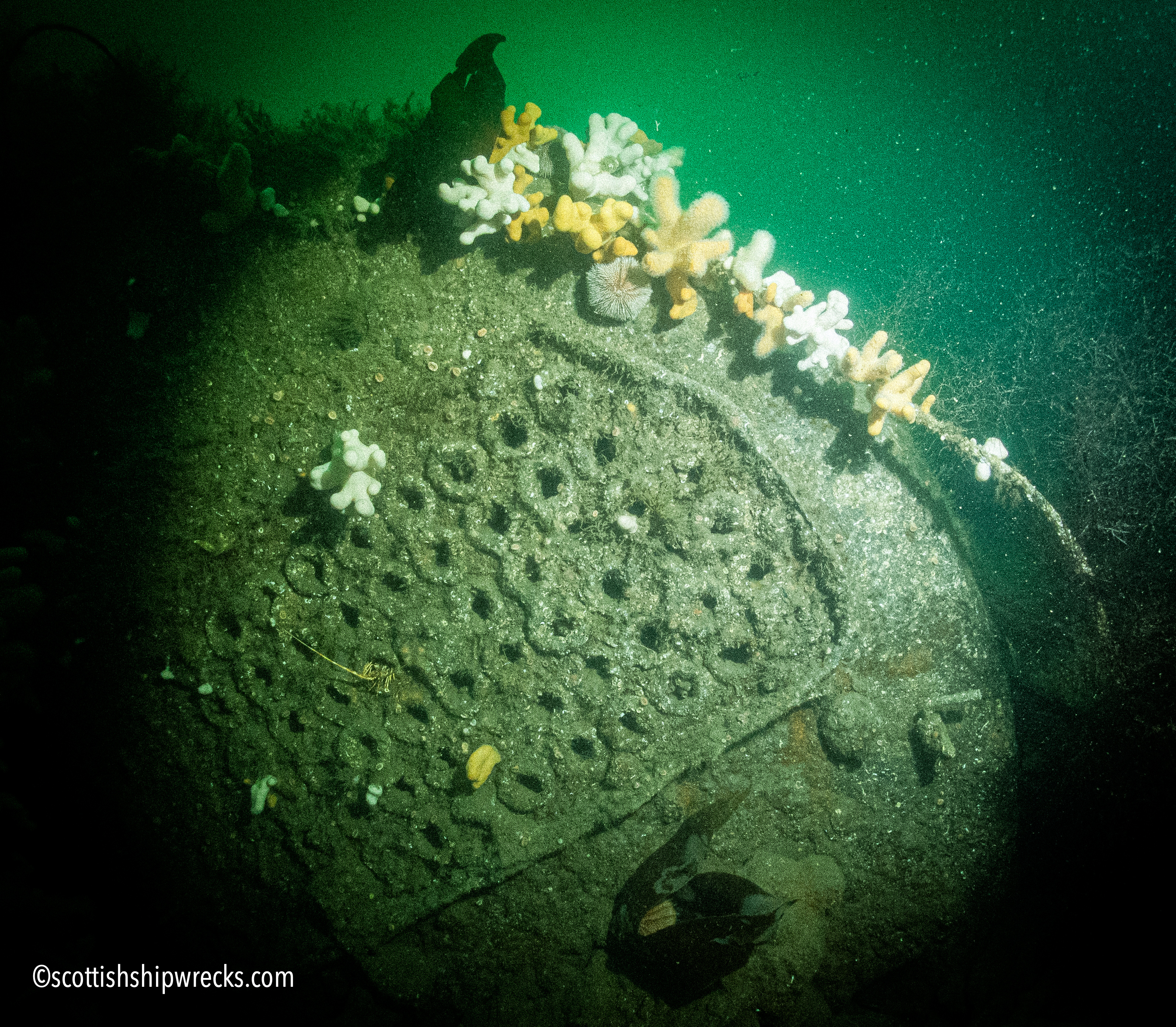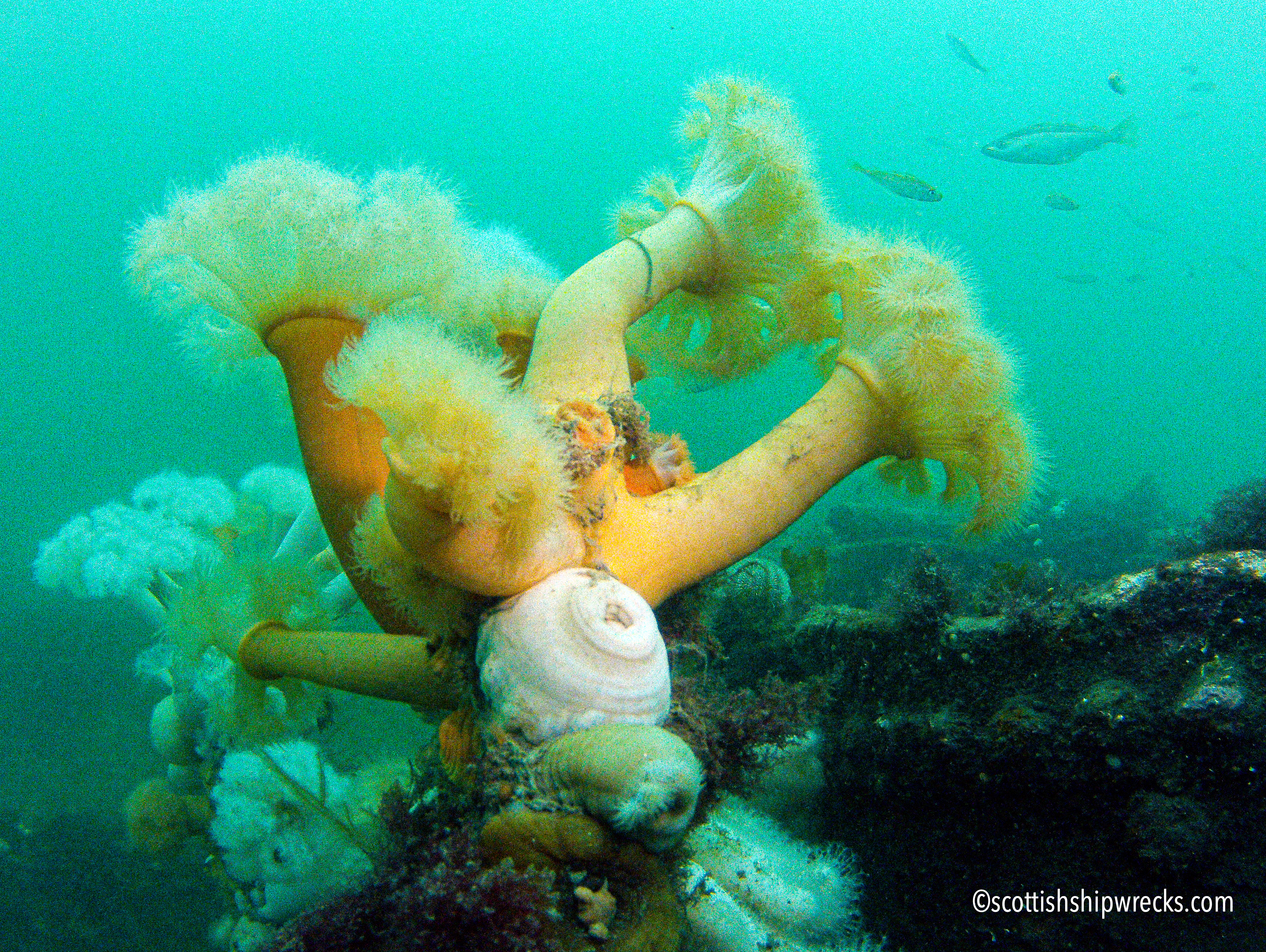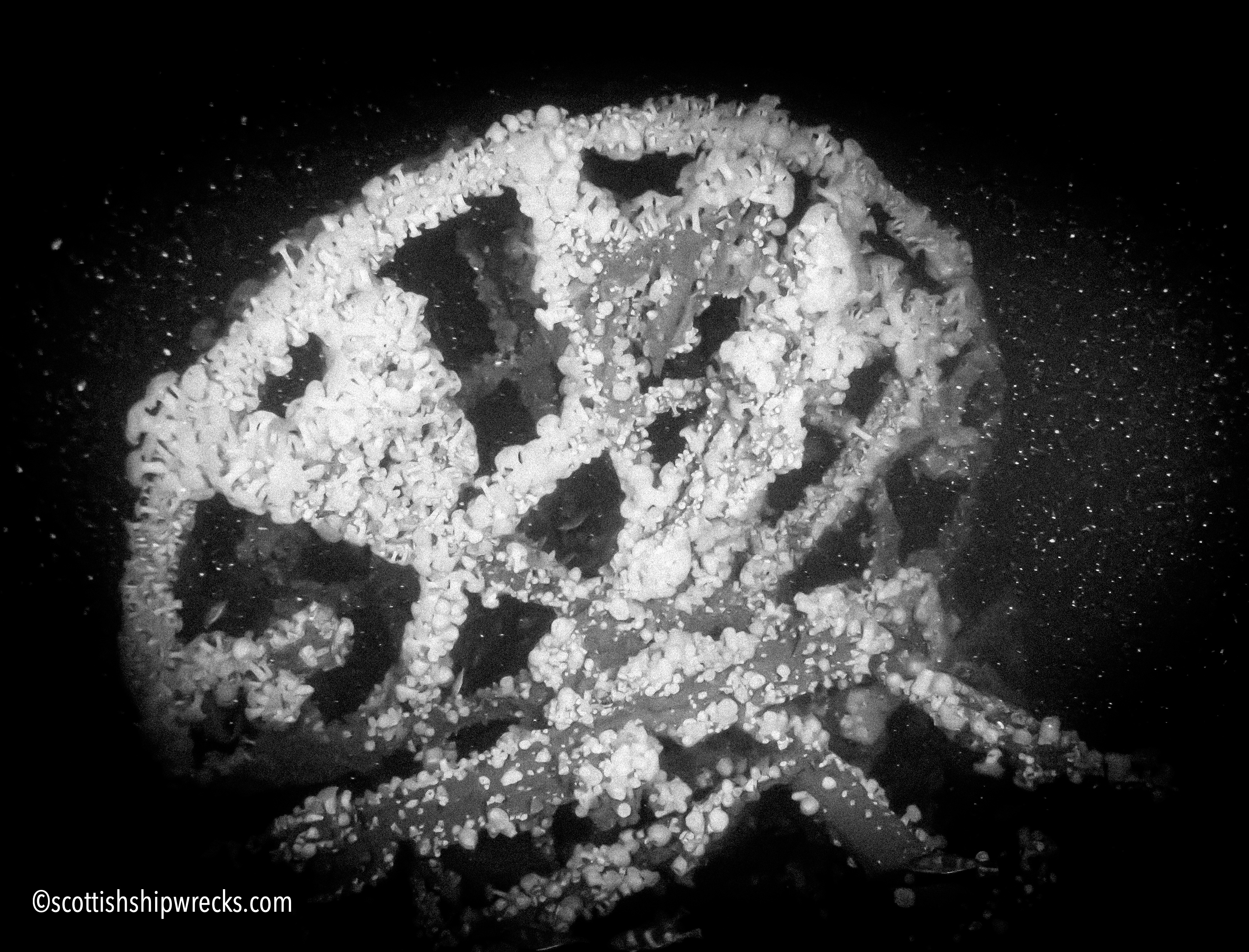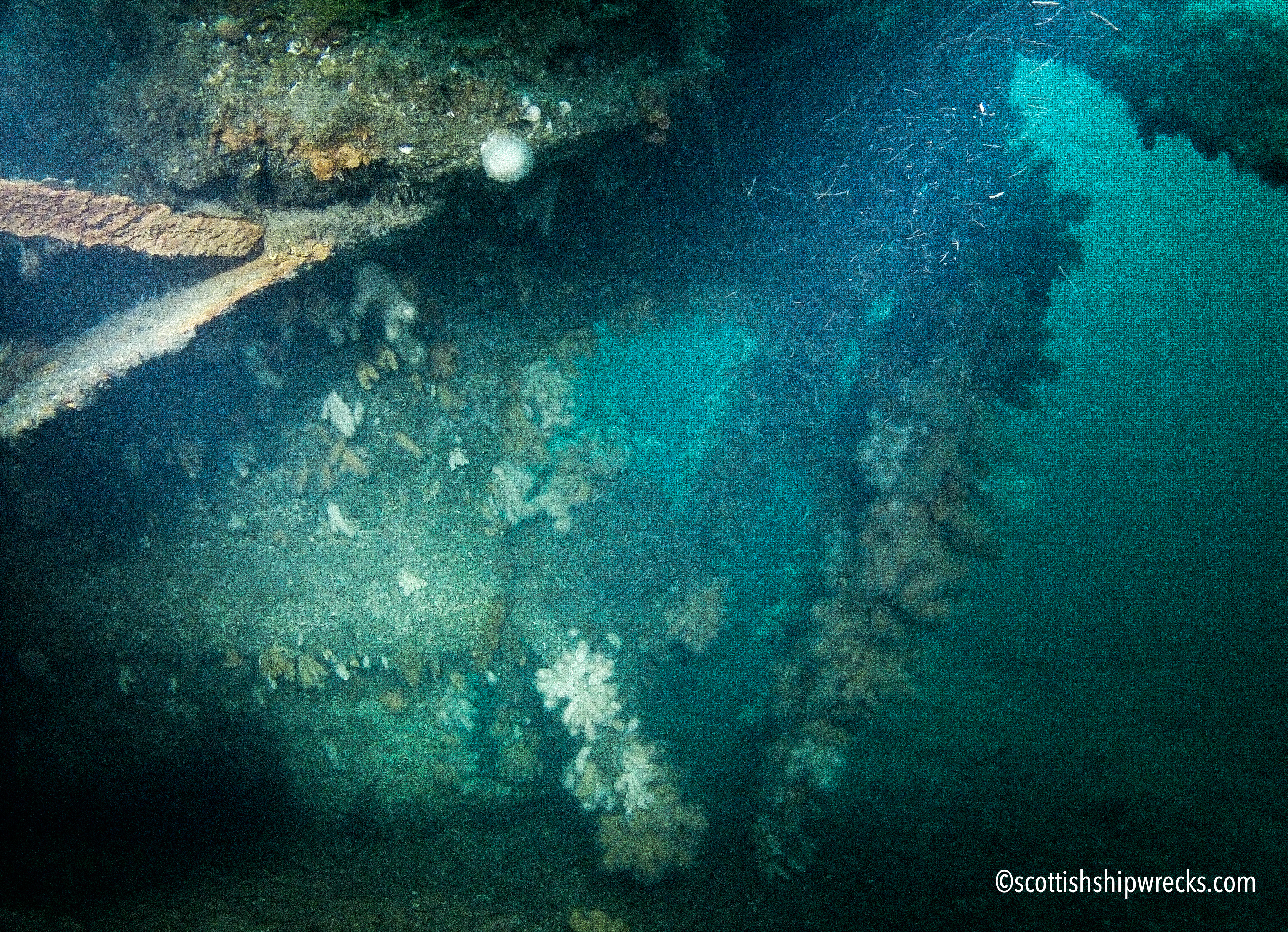 The second wreck to be visited was the Universe, fortunately she has avoided the attentions of any fishing activity, with no nets, buckie pots, ropes or any debris. This wreck lies in 62 metres and rises between 2-4 metres. Visibility of the wreck was very good, probably 10-12 metres, sealife has coated the paddle box framing with dense clumps of orange and white plumose anemones, shoals of small fish and large bib swam around the central section. We hope to add a page for this wreck once we have concluded a bit more research into her loss, but here are some pictures from the dive.