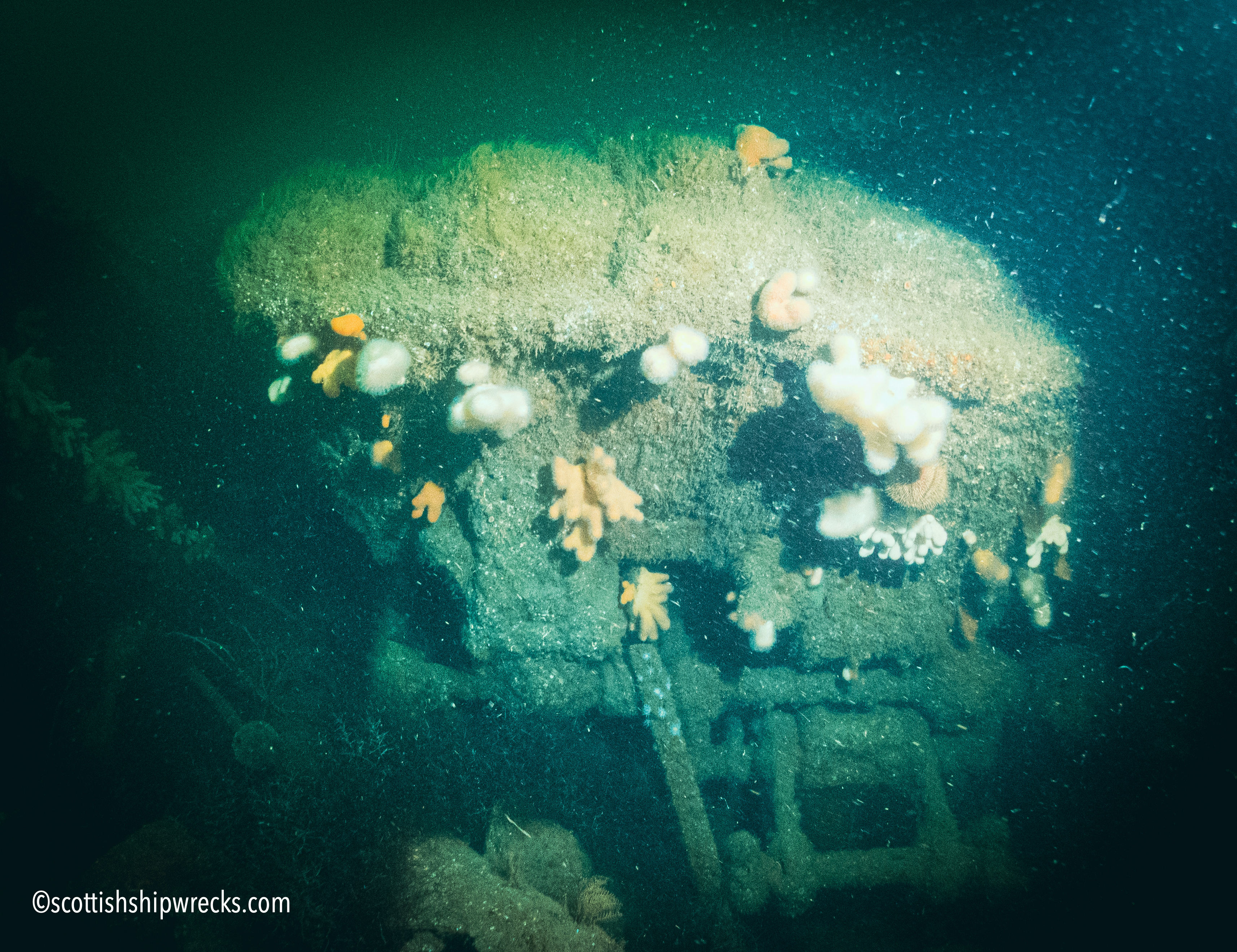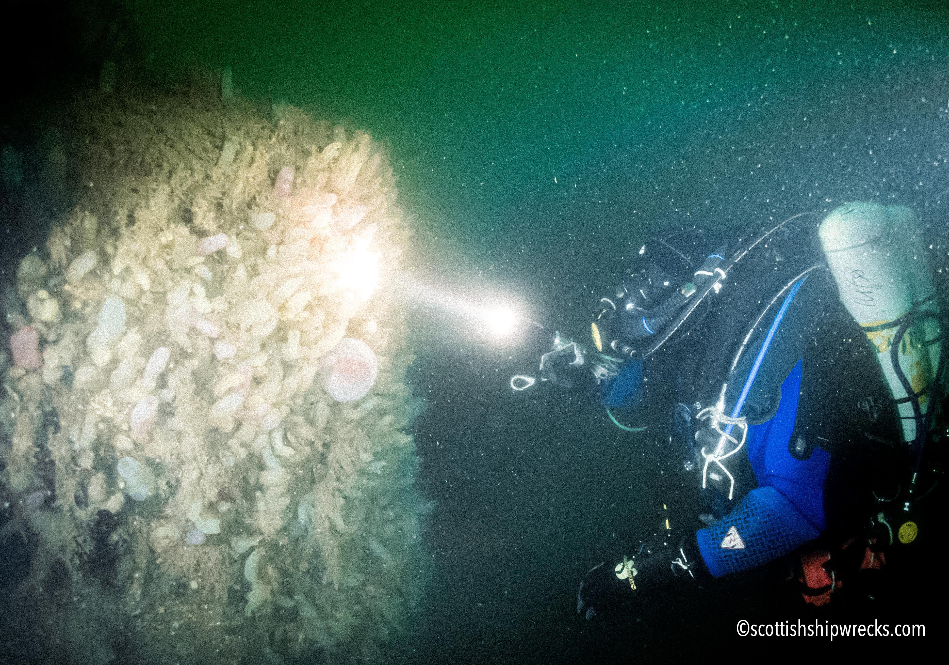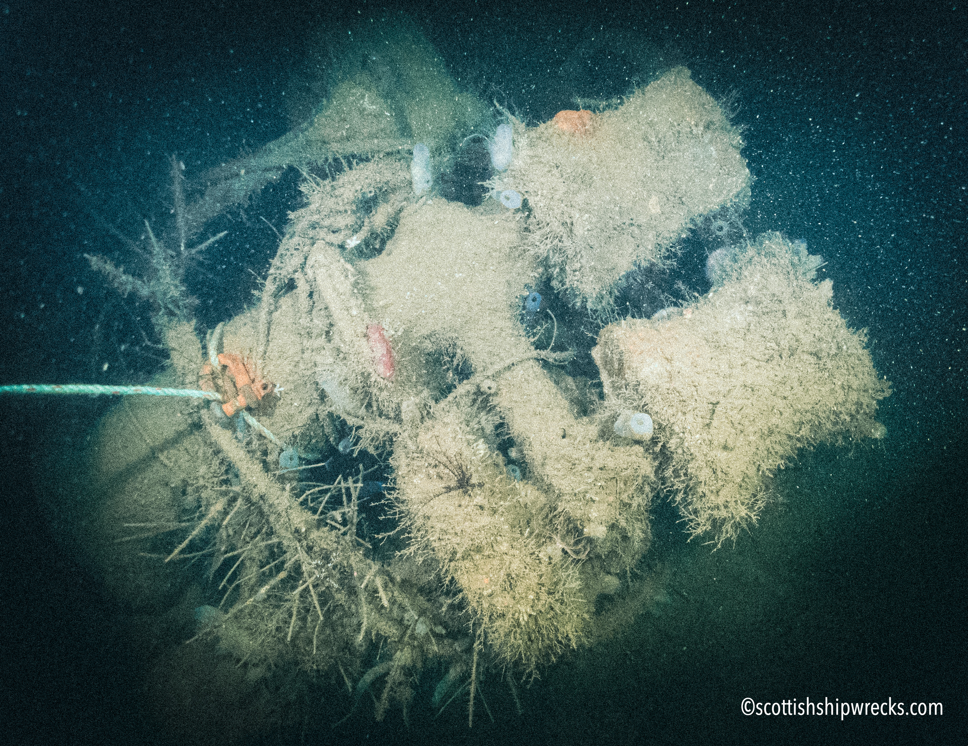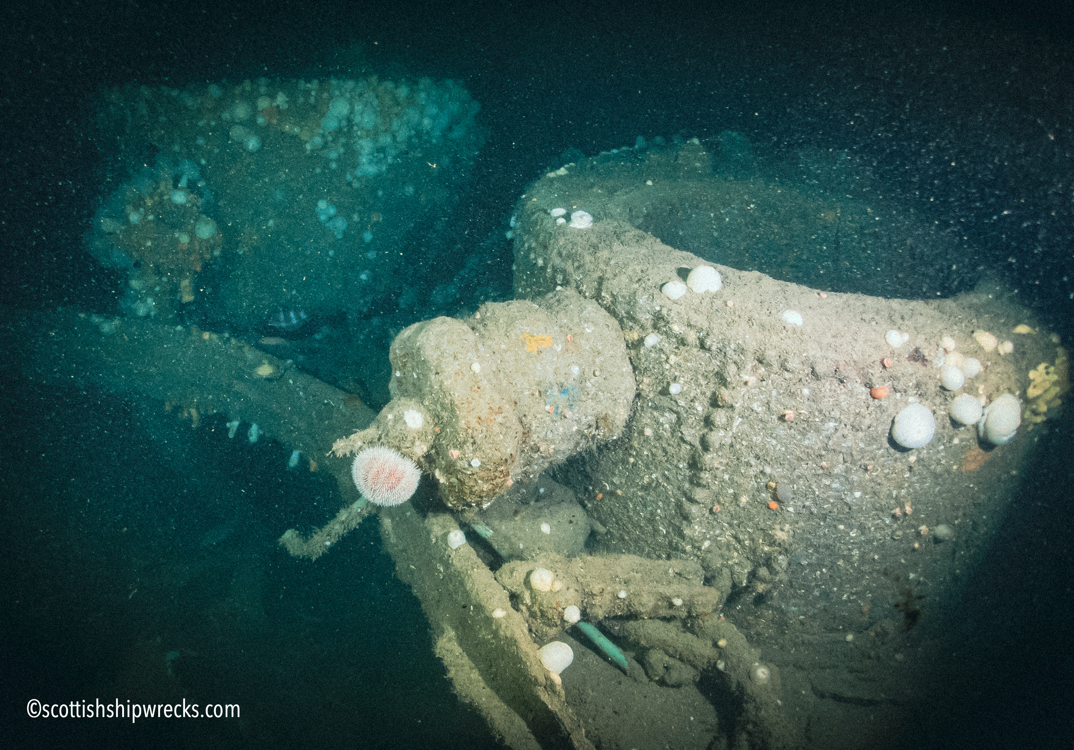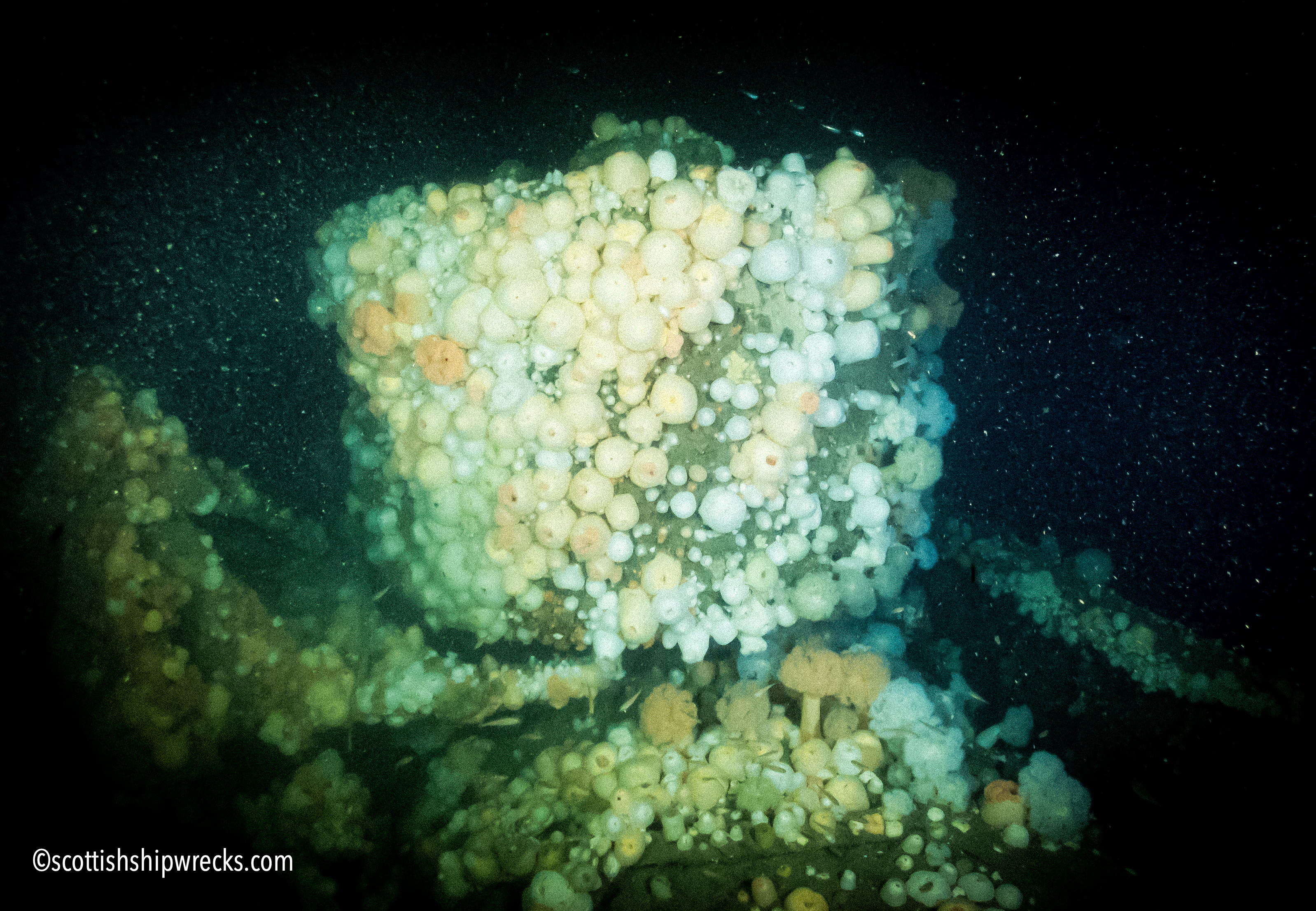 The second wreck to be visited was the Universe, fortunately she has avoided the attentions of any fishing activity, with no nets, buckie pots, ropes or any debris. This wreck lies in 62 metres and rises between 2-4 metres. Visibility of the wreck was very good, probably 10-12 metres, sealife has coated the paddle box framing with dense clumps of orange and white plumose anemones, shoals of small fish and large bib swam around the central section. We hope to add a page for this wreck once we have concluded a bit more research into her loss, but here are some pictures from the dive.