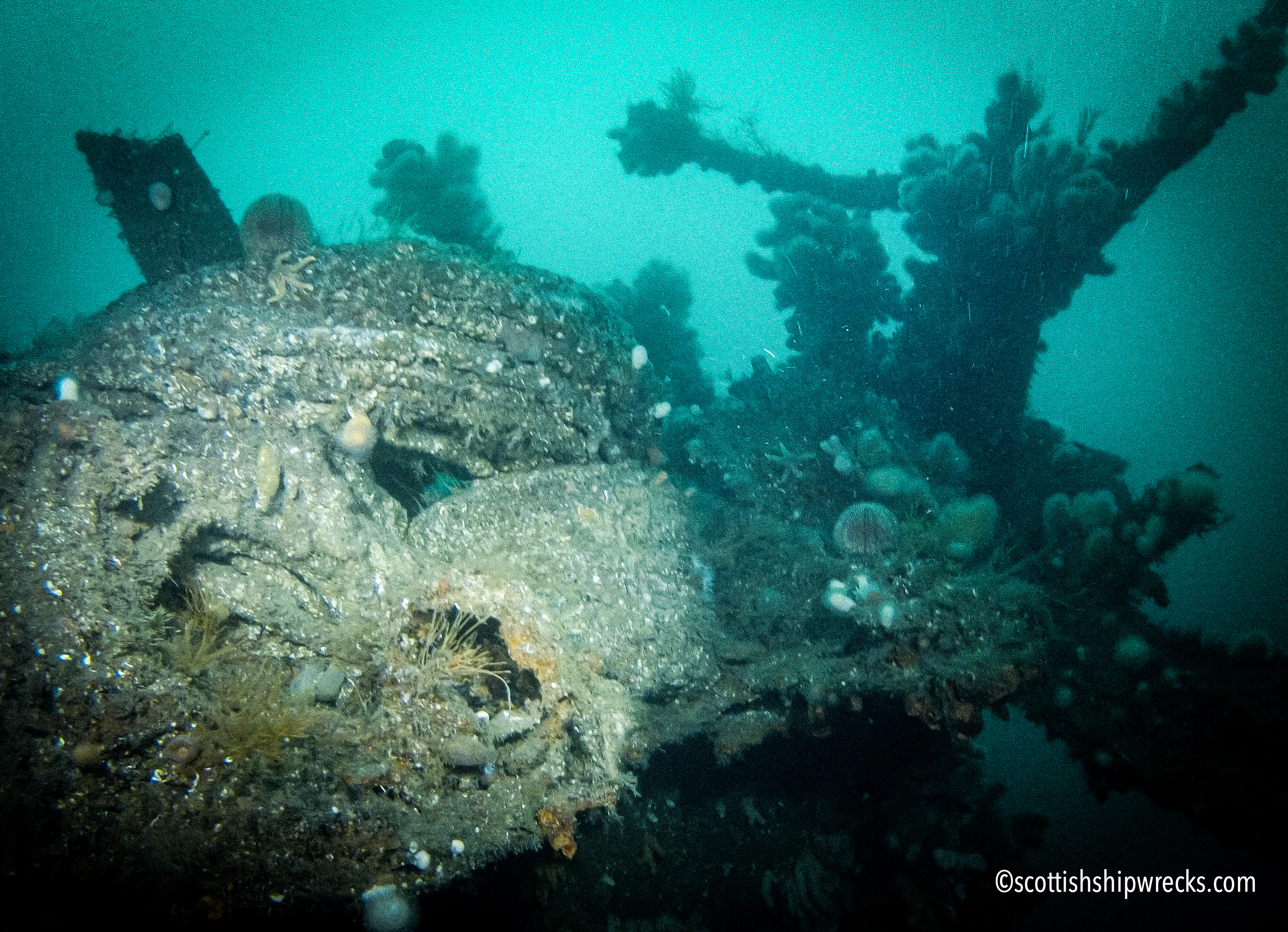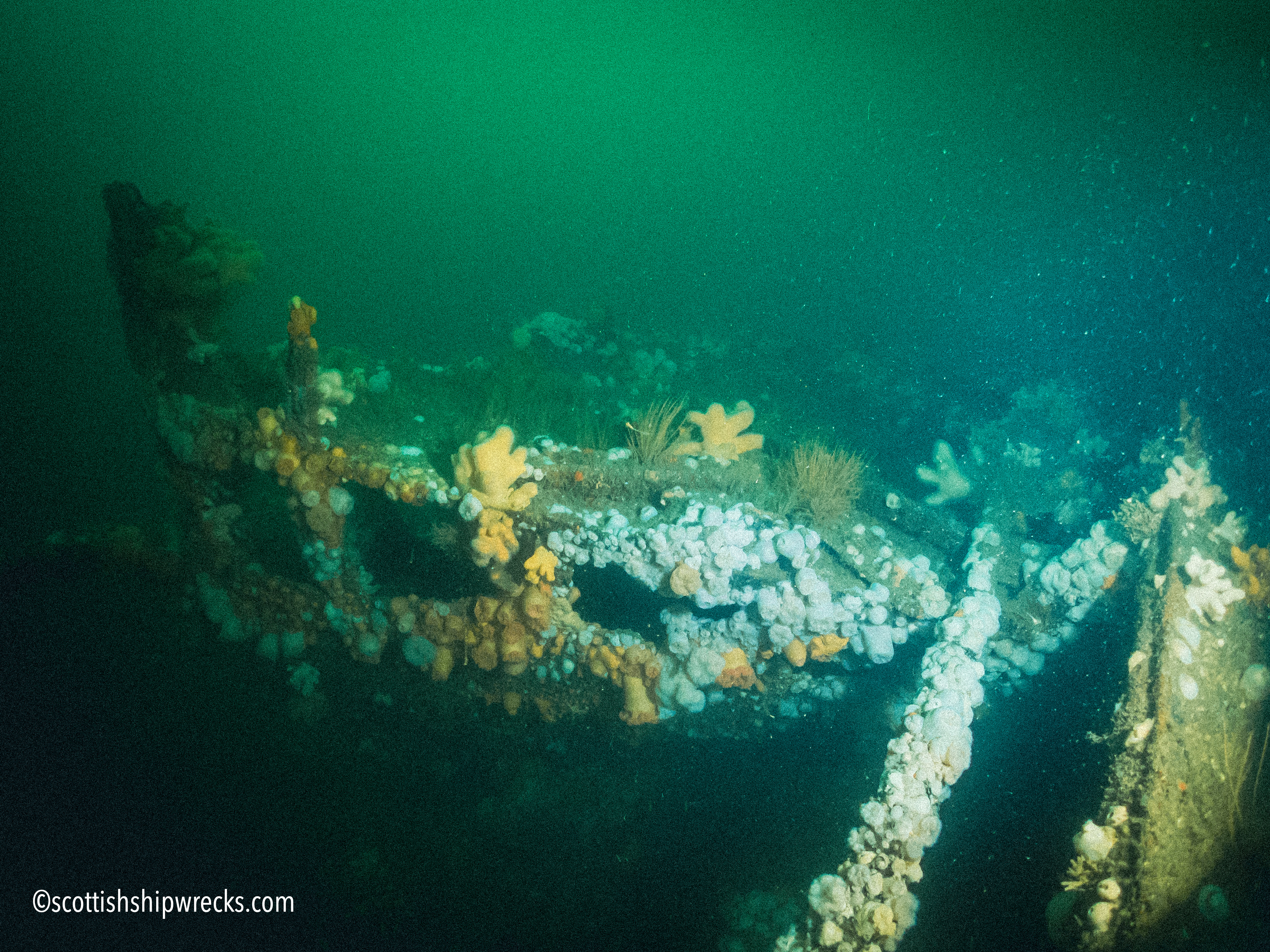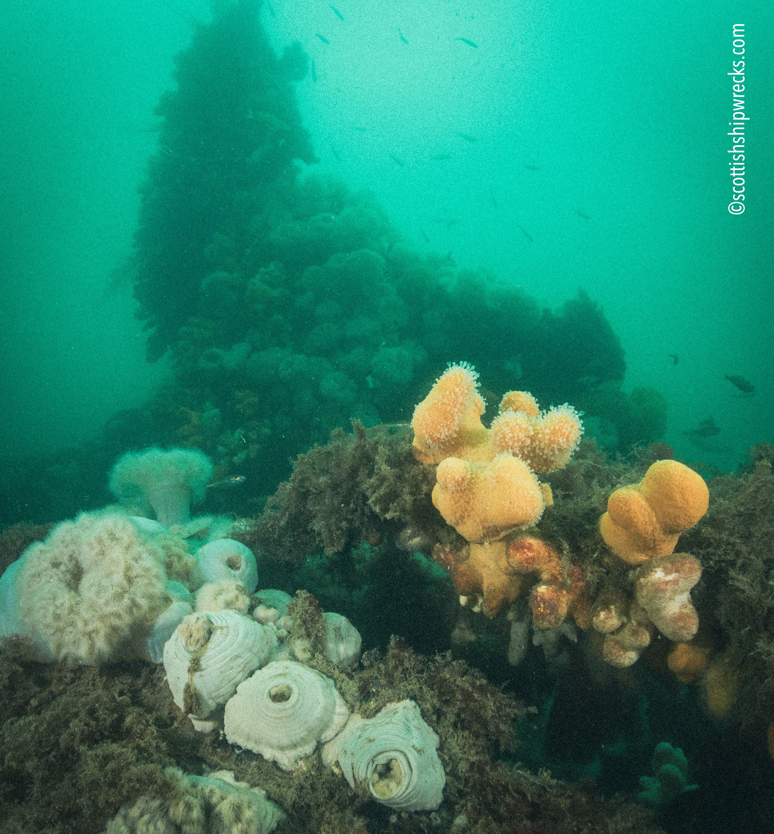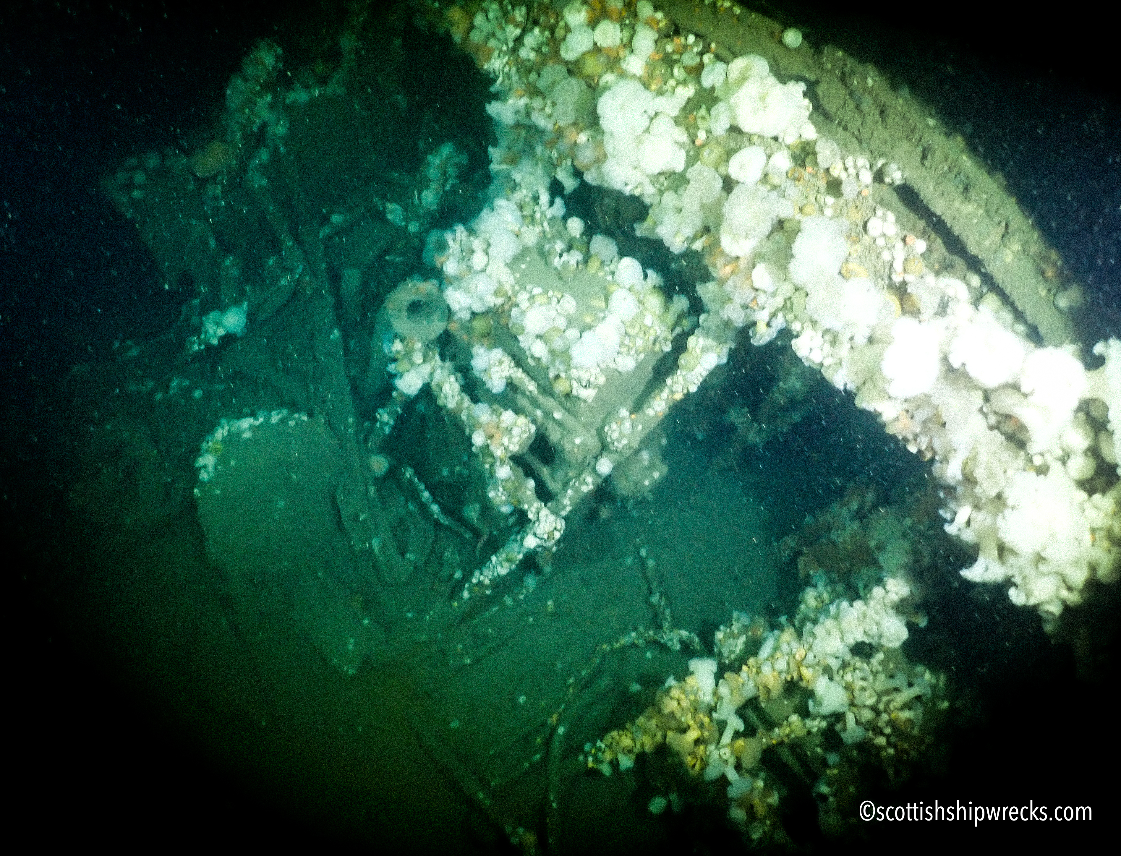The second wreck to be visited was the Universe, fortunately she has avoided the attentions of any fishing activity, with no nets, buckie pots, ropes or any debris. This wreck lies in 62 metres and rises between 2-4 metres. Visibility of the wreck was very good, probably 10-12 metres, sealife has coated the paddle box framing with dense clumps of orange and white plumose anemones, shoals of small fish and large bib swam around the central section. We hope to add a page for this wreck once we have concluded a bit more research into her loss, but here are some pictures from the dive.