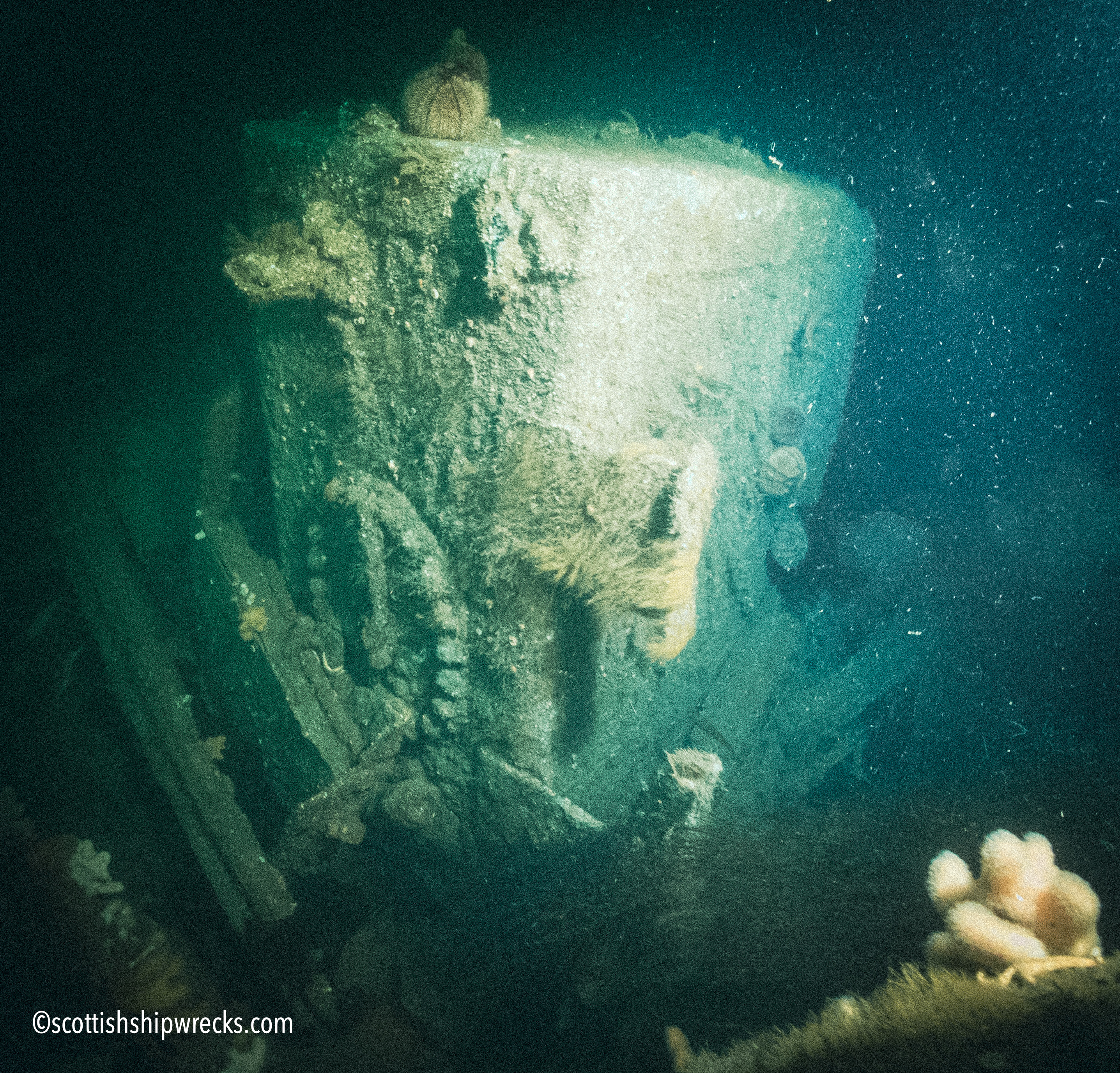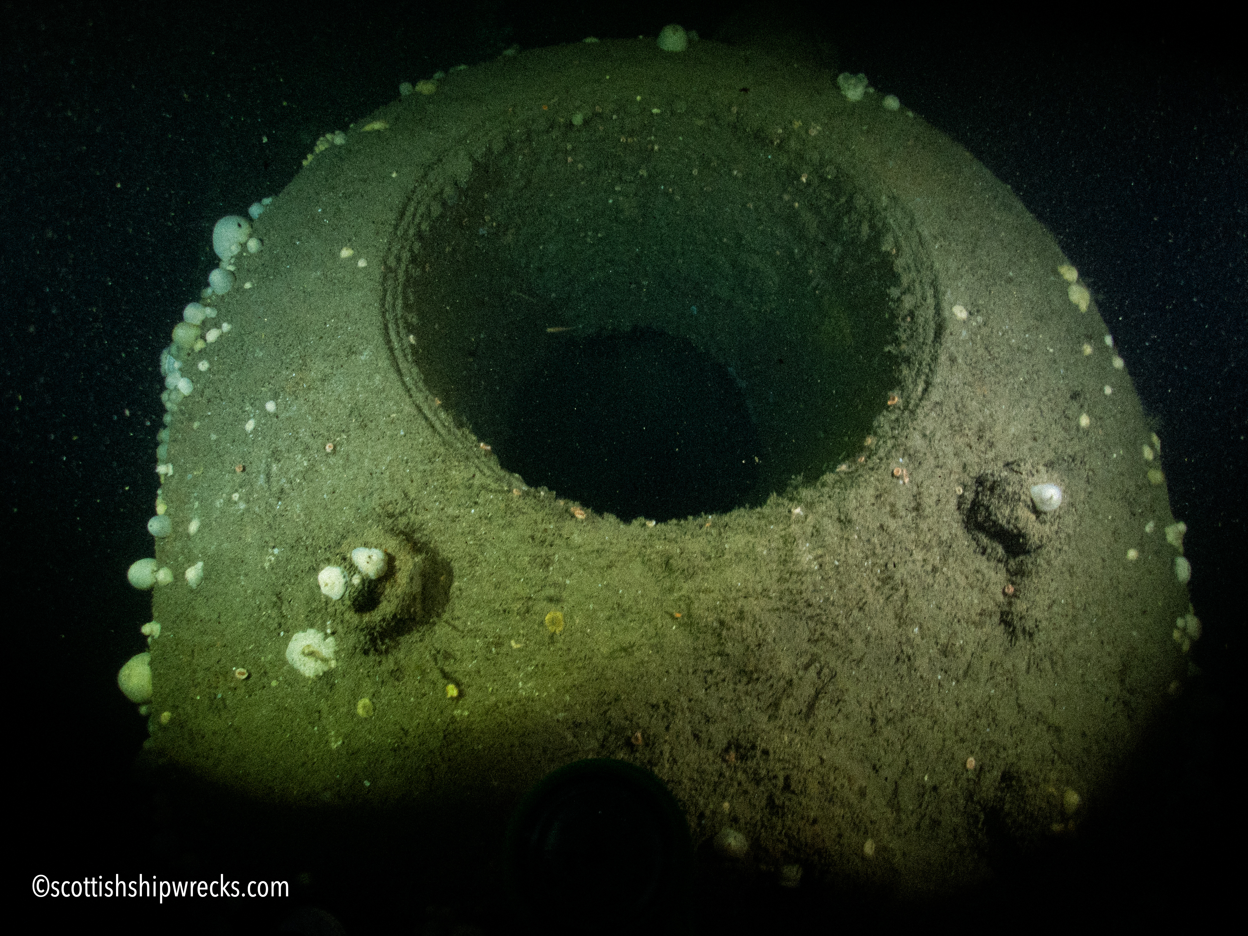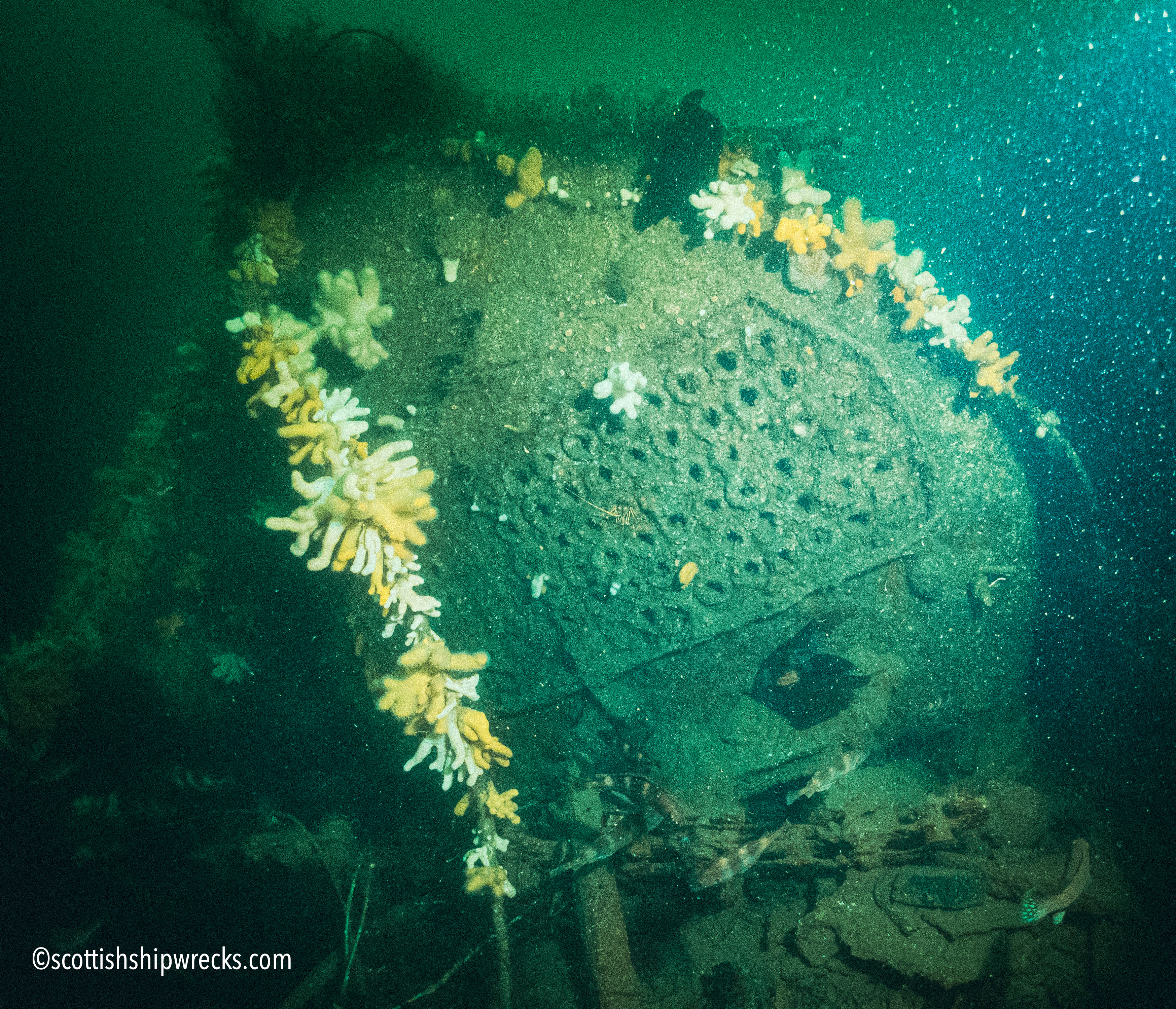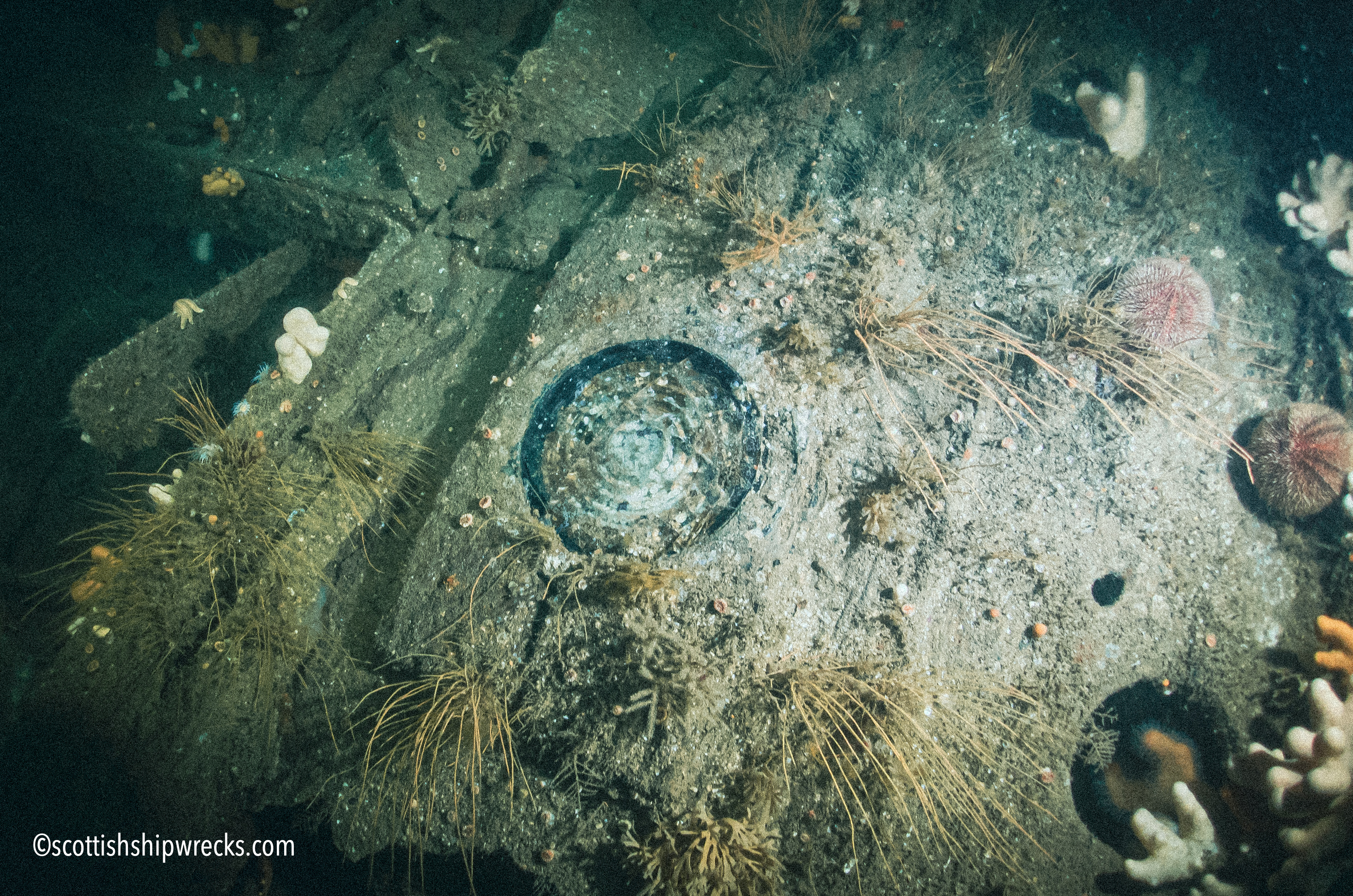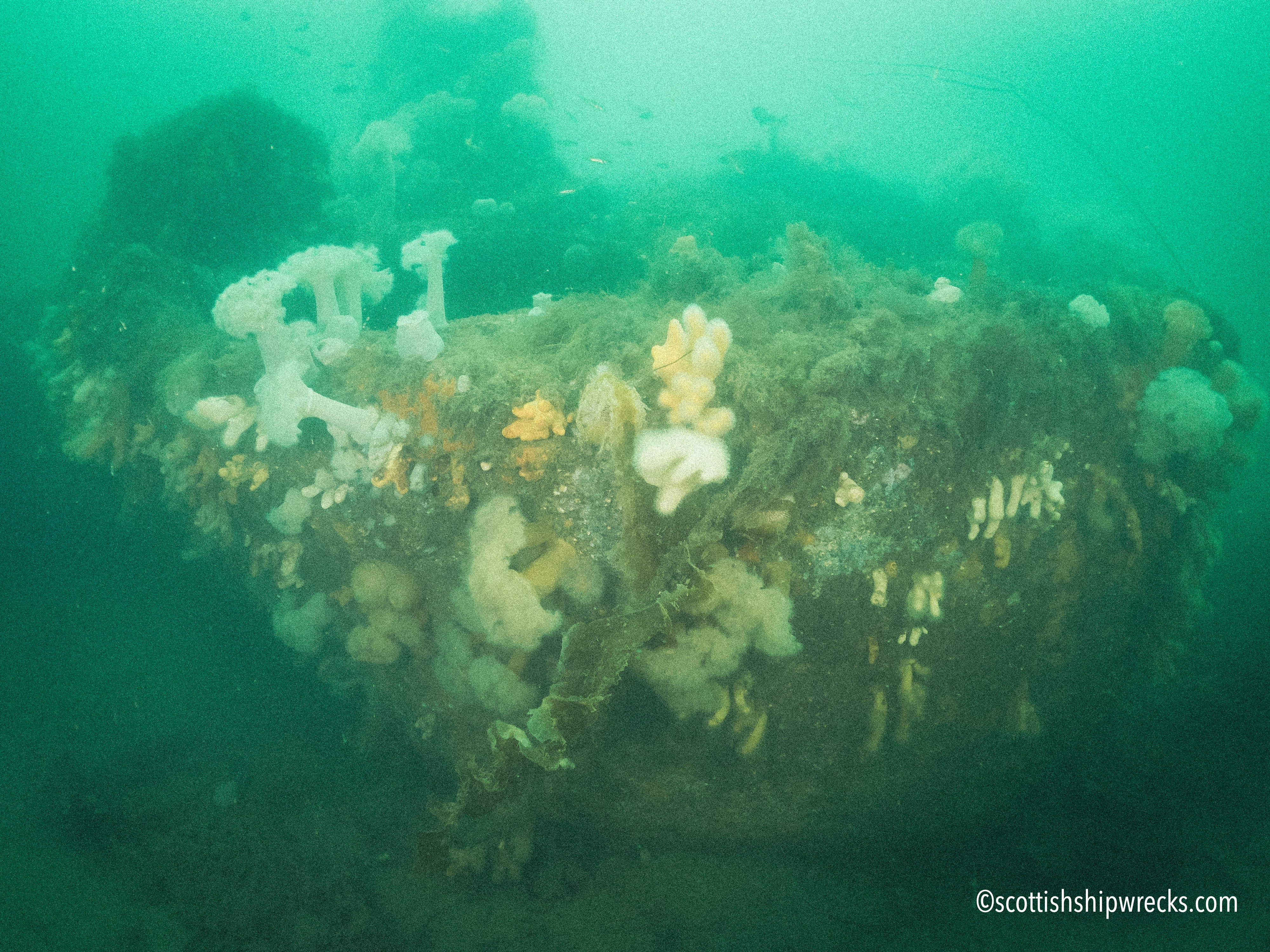The second wreck to be visited was the Universe, fortunately she has avoided the attentions of any fishing activity, with no nets, buckie pots, ropes or any debris. This wreck lies in 62 metres and rises between 2-4 metres. Visibility of the wreck was very good, probably 10-12 metres, sealife has coated the paddle box framing with dense clumps of orange and white plumose anemones, shoals of small fish and large bib swam around the central section. We hope to add a page for this wreck once we have concluded a bit more research into her loss, but here are some pictures from the dive.