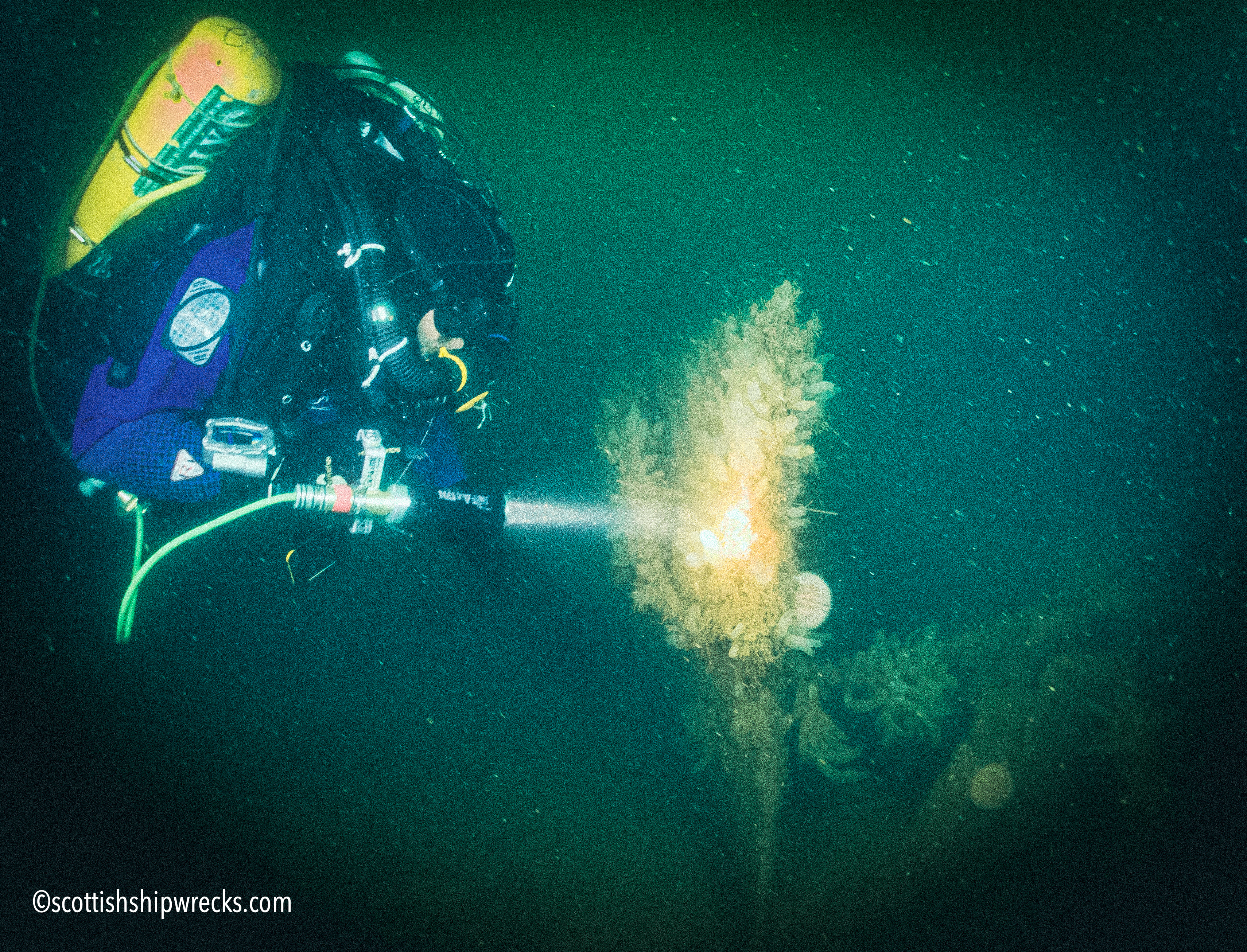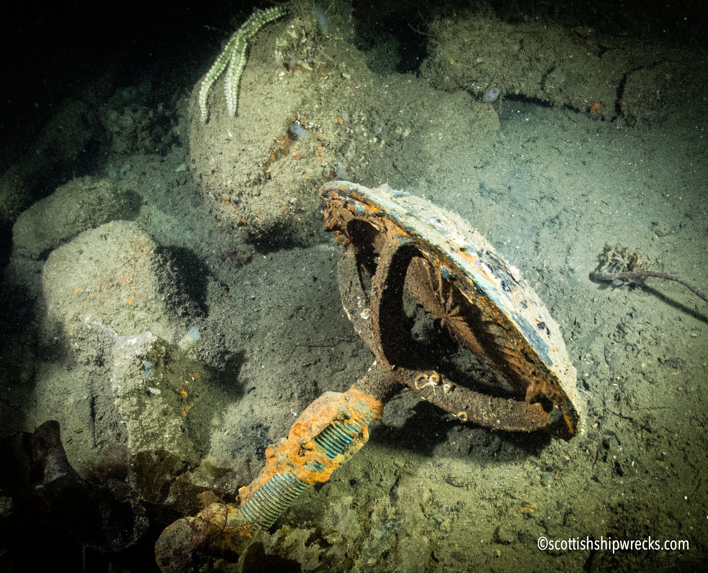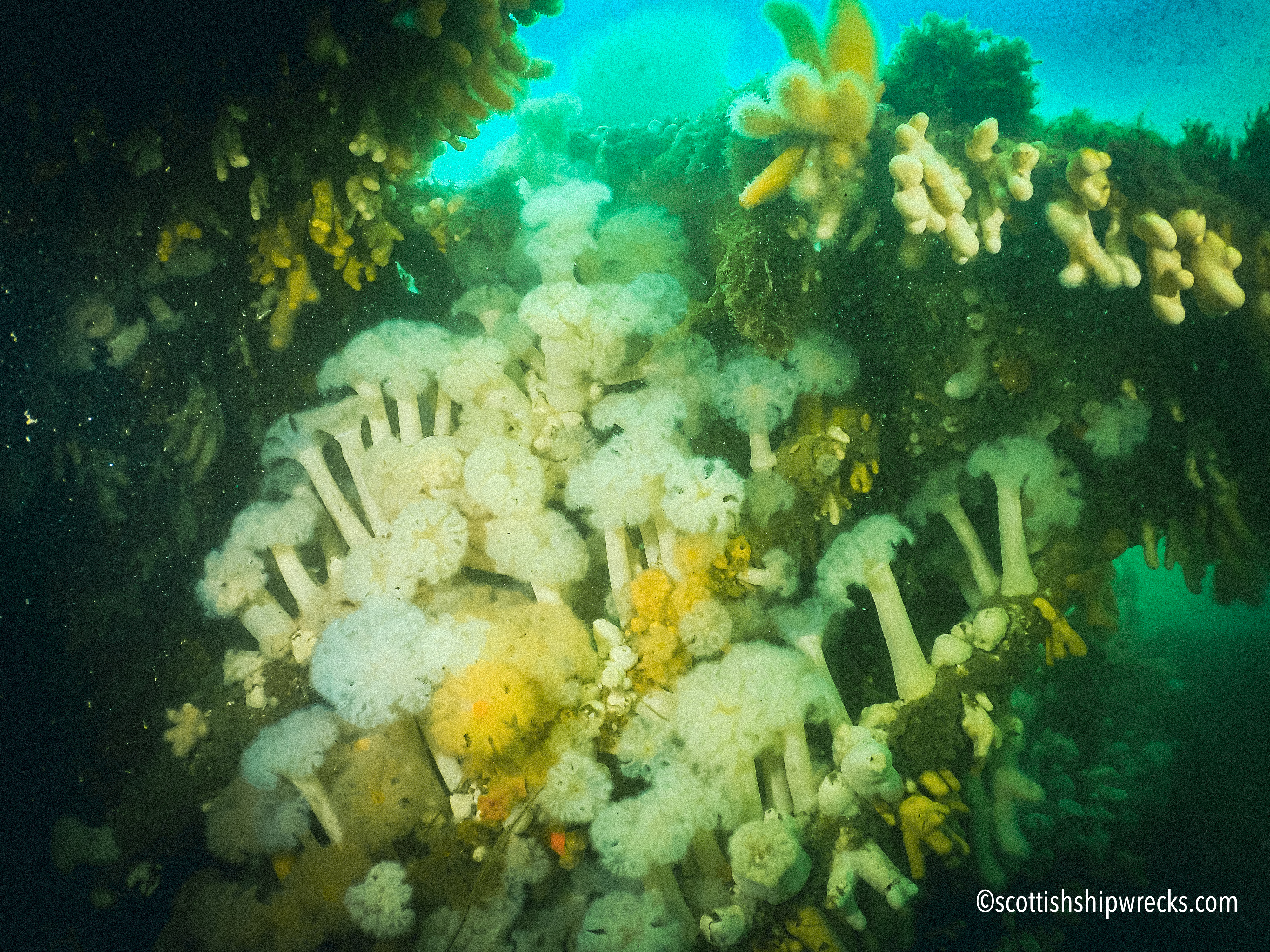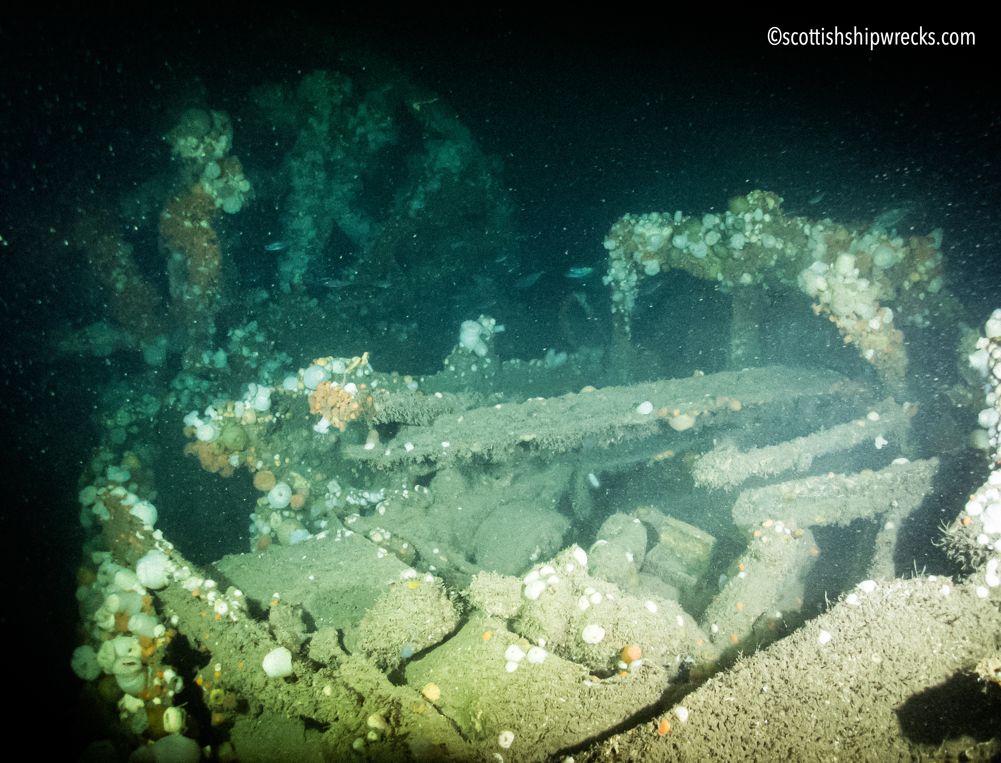The second wreck to be visited was the Universe, fortunately she has avoided the attentions of any fishing activity, with no nets, buckie pots, ropes or any debris. This wreck lies in 62 metres and rises between 2-4 metres. Visibility of the wreck was very good, probably 10-12 metres, sealife has coated the paddle box framing with dense clumps of orange and white plumose anemones, shoals of small fish and large bib swam around the central section. We hope to add a page for this wreck once we have concluded a bit more research into her loss, but here are some pictures from the dive.