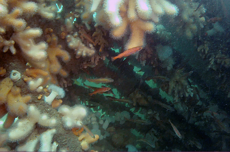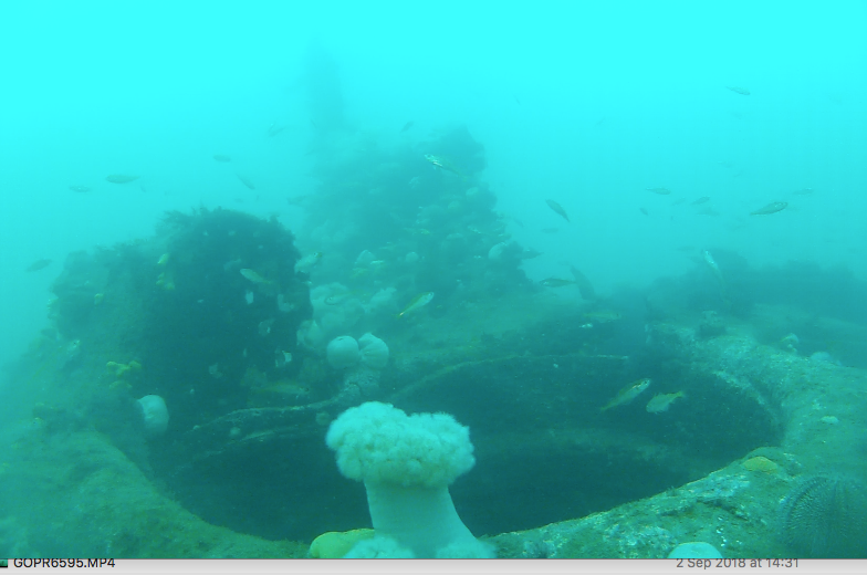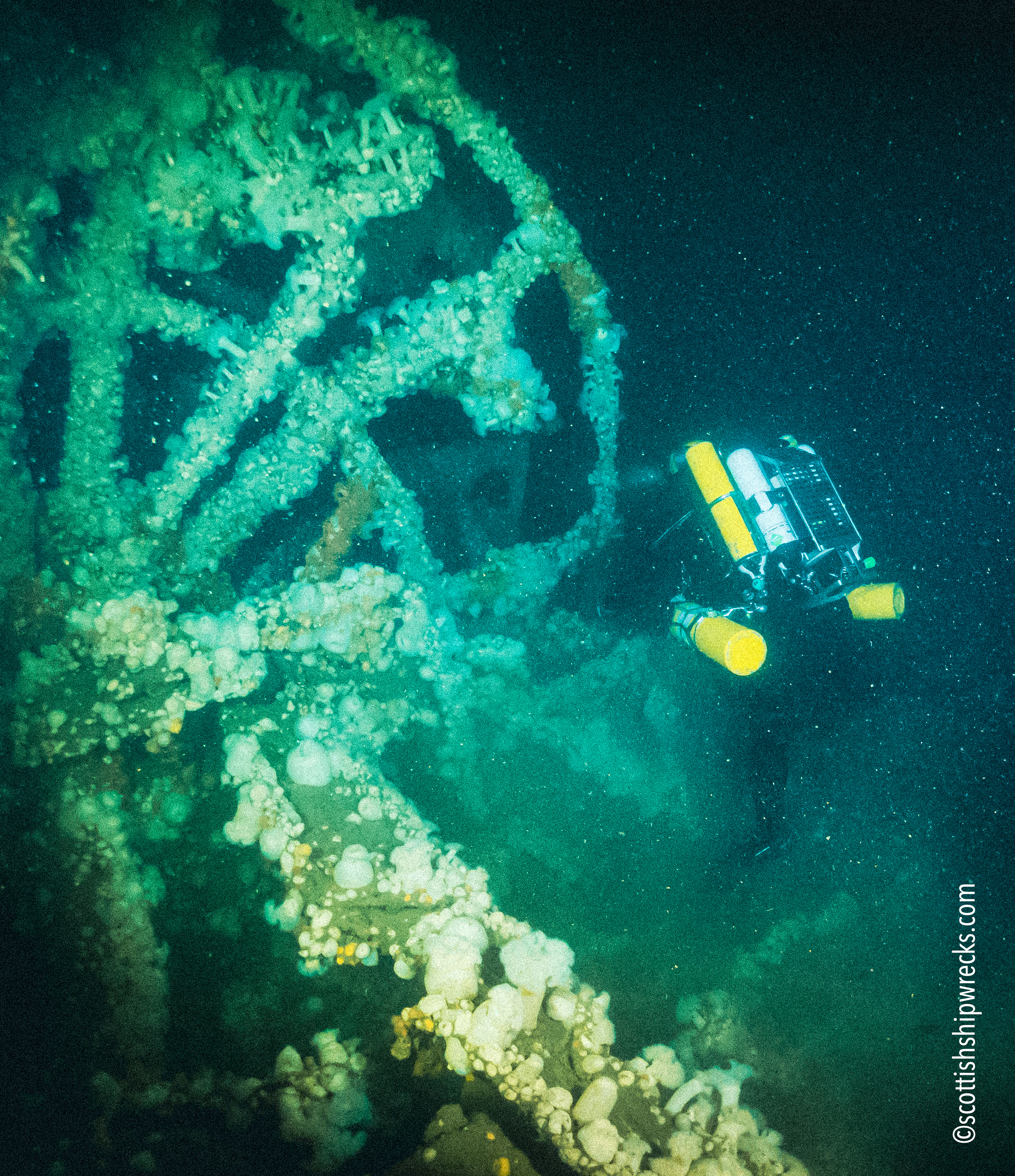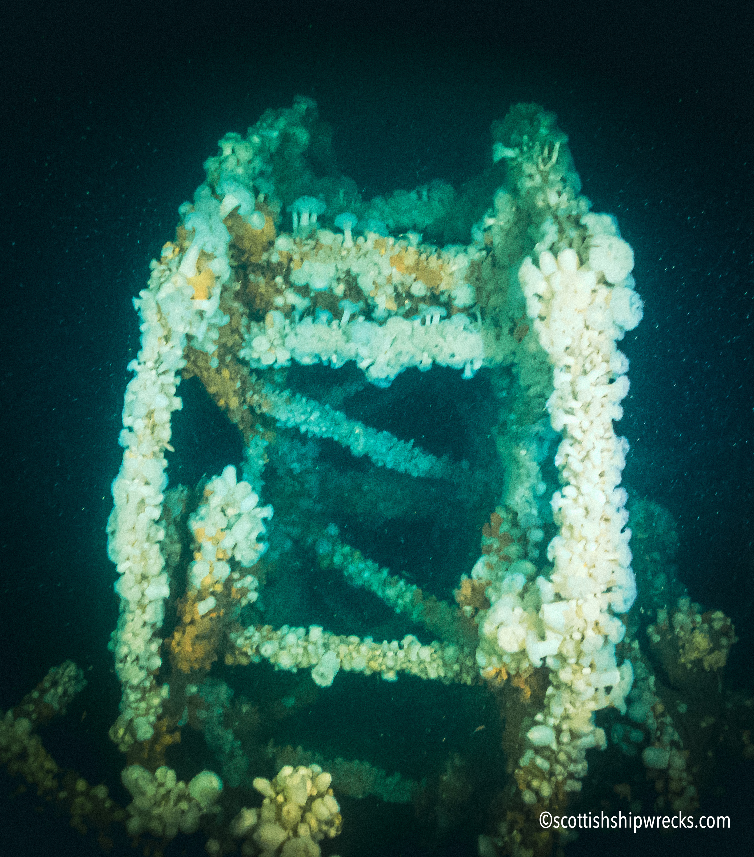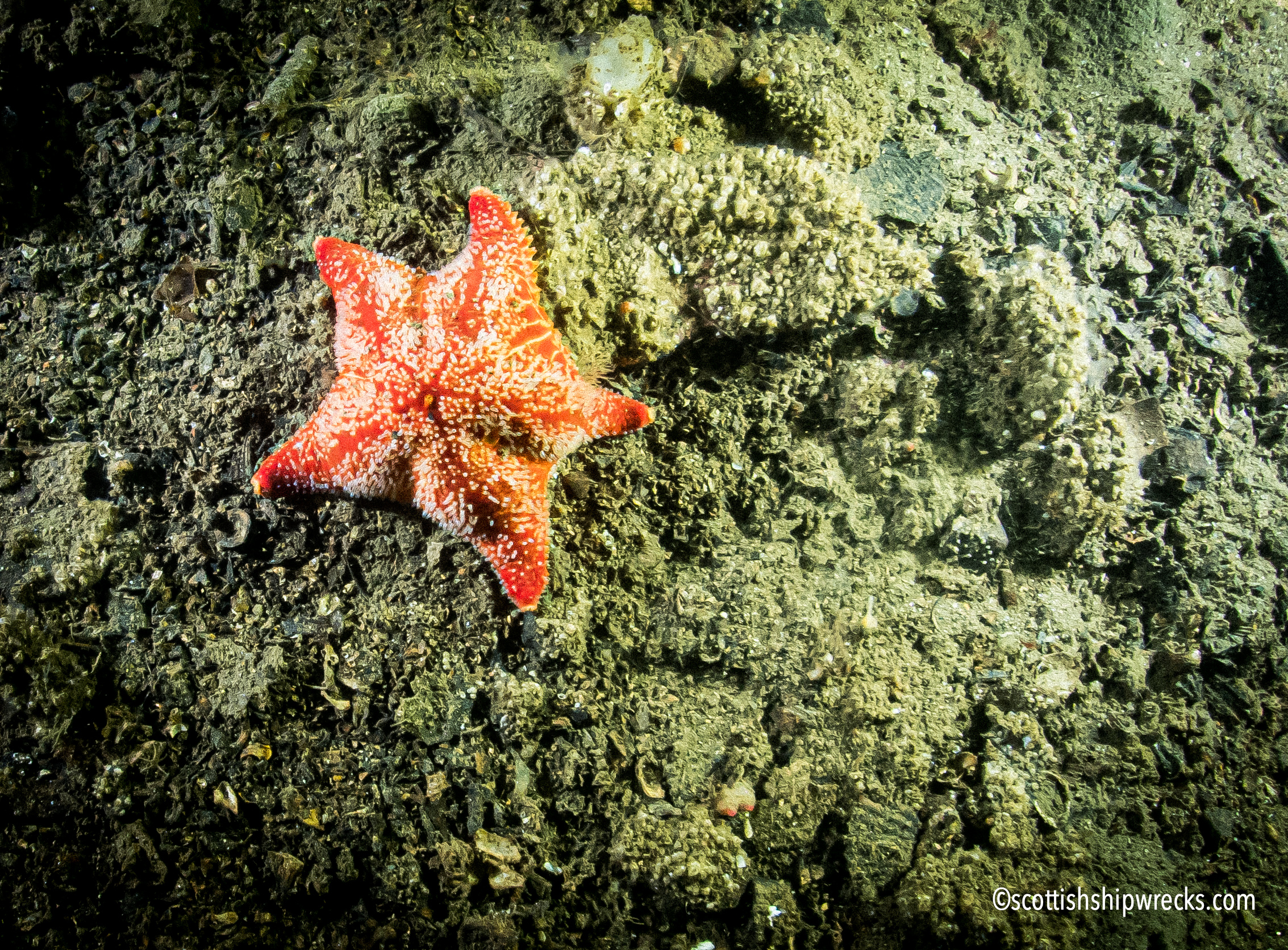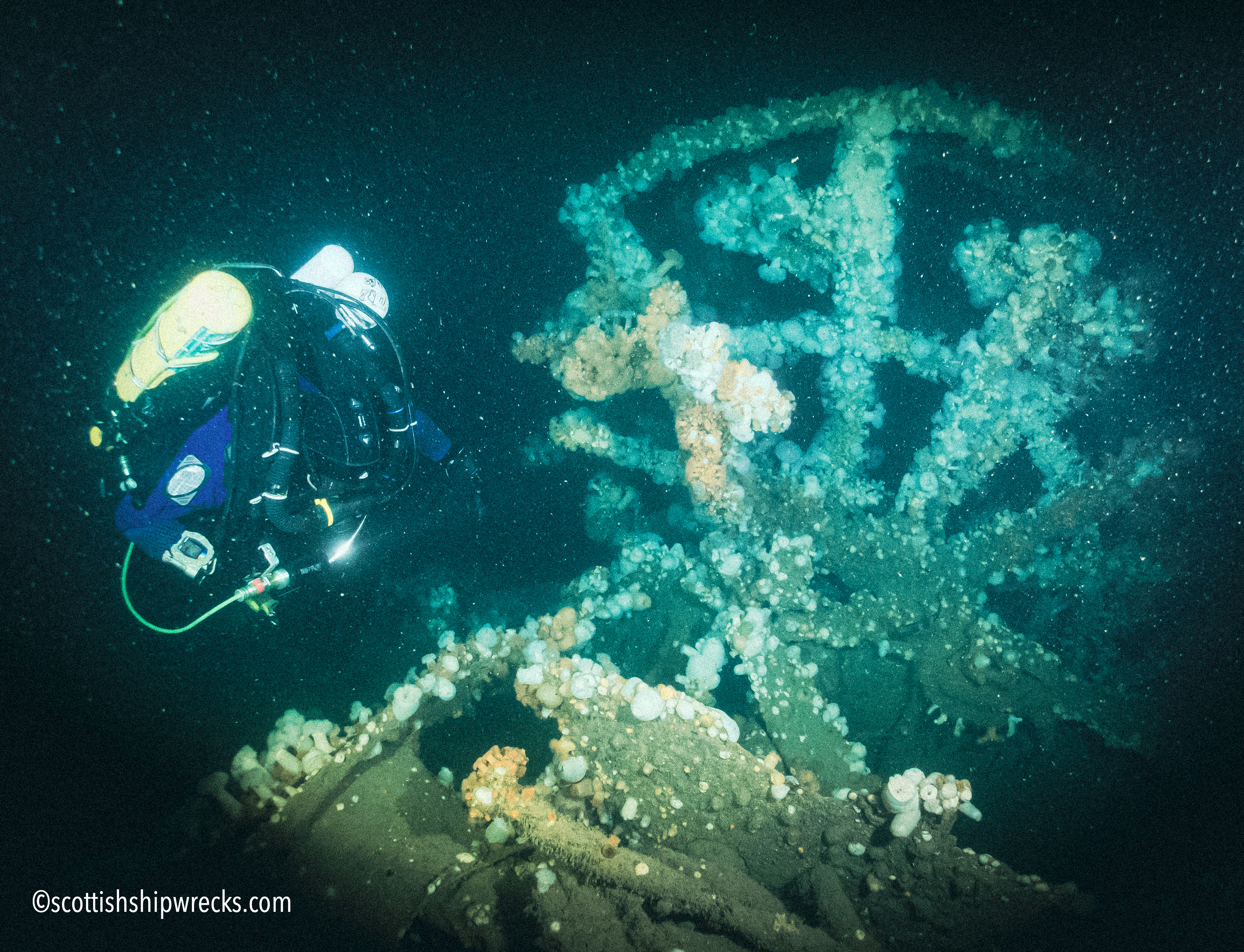 The second wreck to be visited was the Universe, fortunately she has avoided the attentions of any fishing activity, with no nets, buckie pots, ropes or any debris. This wreck lies in 62 metres and rises between 2-4 metres. Visibility of the wreck was very good, probably 10-12 metres, sealife has coated the paddle box framing with dense clumps of orange and white plumose anemones, shoals of small fish and large bib swam around the central section. We hope to add a page for this wreck once we have concluded a bit more research into her loss, but here are some pictures from the dive.