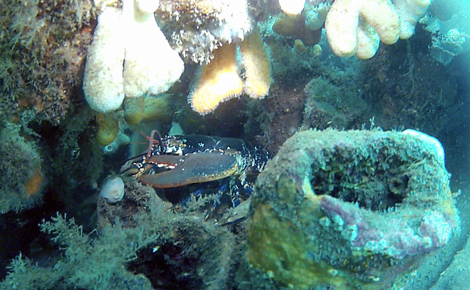 As forecast, the weather conditions improved early afternoon and we moved round to the west coast of Gigha to dive the wreck of the Admiralty steam drifter Riant. The conditions looked great on site and the shot could be seen many metres below the boats. The wreck lies in 31-34 metres although pieces of debris extend down to 36m on the south side. The Riant is a shadow of when I first dived her with Gus Newman from Islay, as she received the attentions of a large scallop trawler many years ago and was basically flattened midships, her bow and stern were also badly damaged. Details of the Riant can be found here Riant.