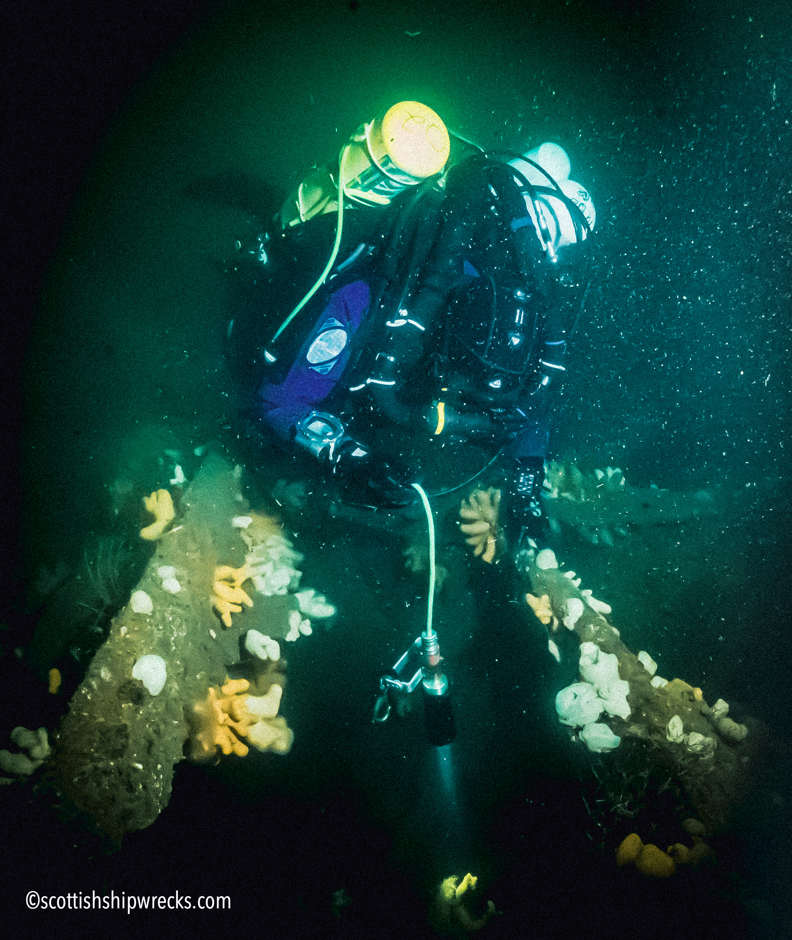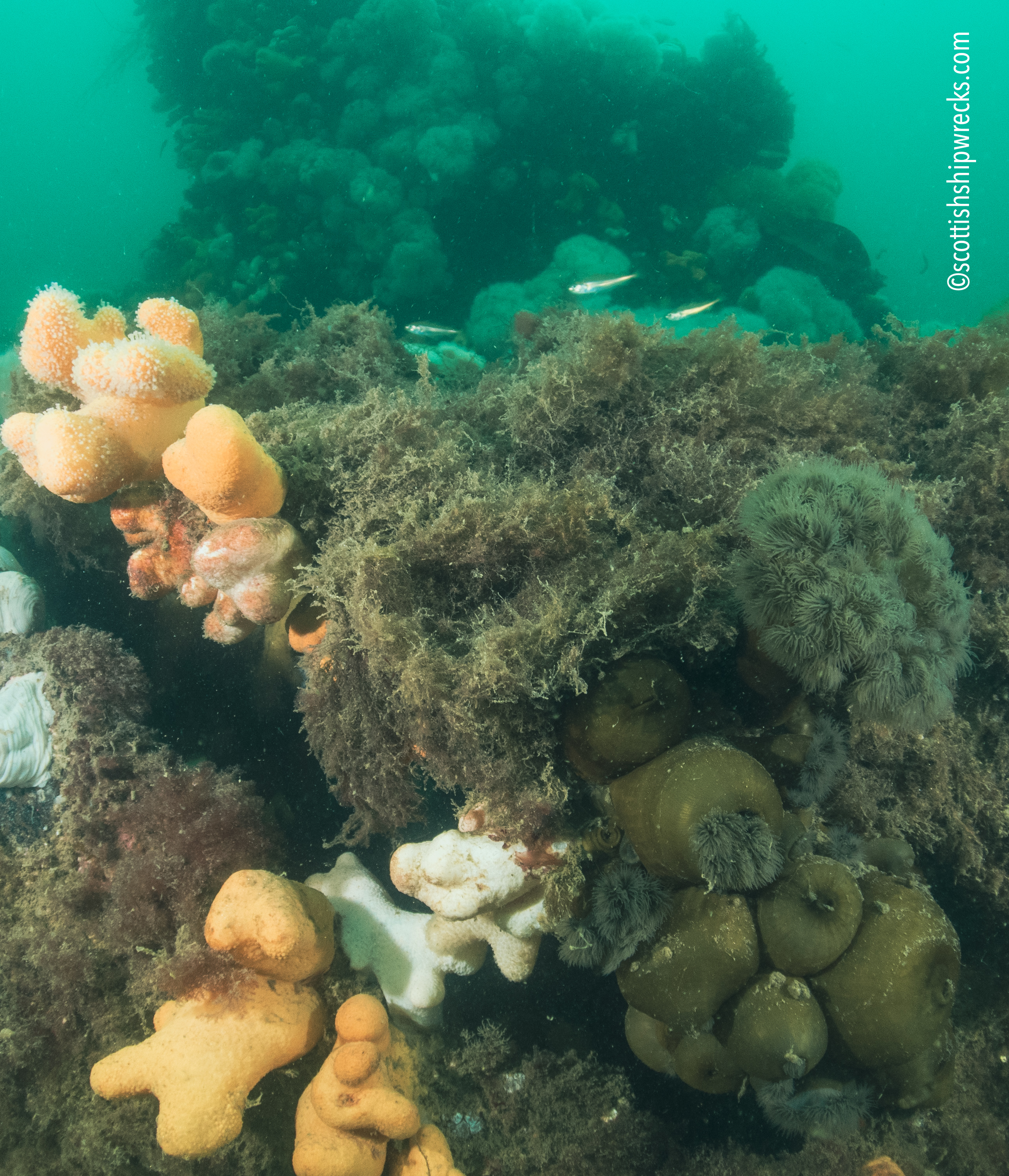 Saturday Dives – overnight the wind had dropped a bit and we decided to dive west side as the wind was due to drop away early afternoon. We headed for the only metal on the east side of Gigha, the remains of the SS Mon Cousu that was moored as a bombing target at the north end of the Sound of Gigha in late 1943 and by early 1944 was so damaged that she sank and was later salvaged in situ. What little remains of the 235 foot long vessel lies in 8-10 metres and provides a very colourful reef for a wide range of sealife and is a great subject for underwater photography. Visibility was around 5-6 metres, probably reduced by the blow on Thursday through Friday.
