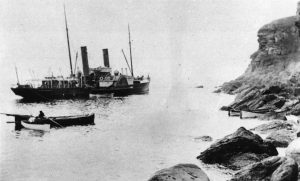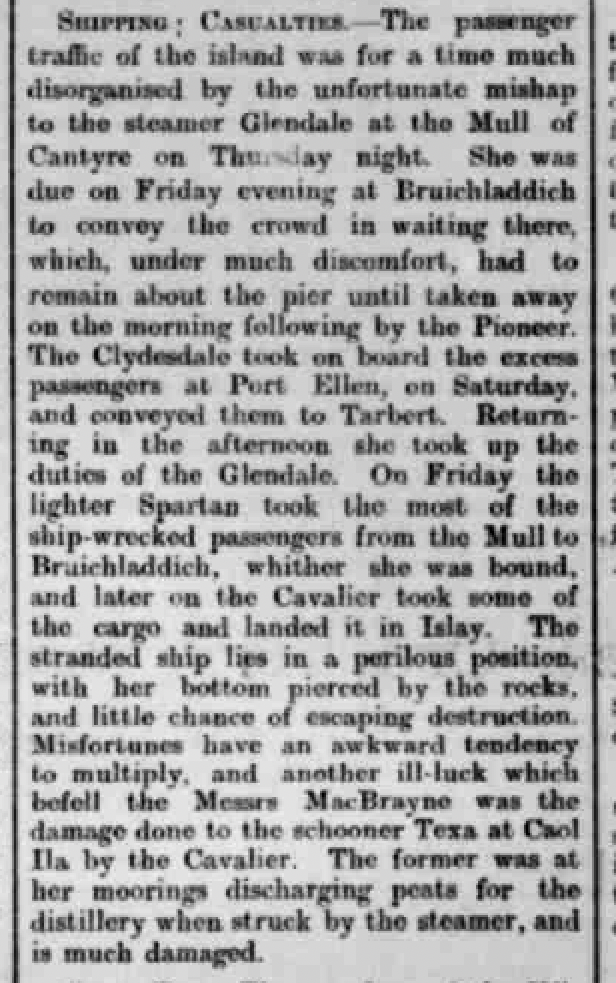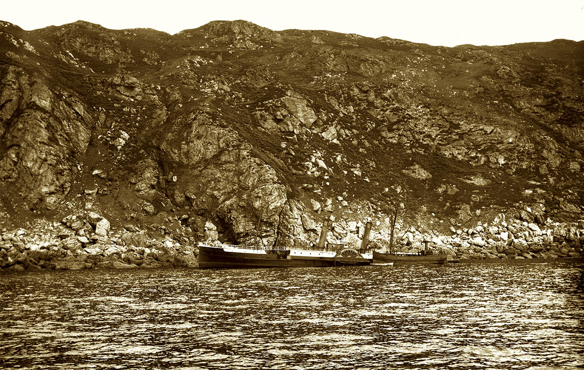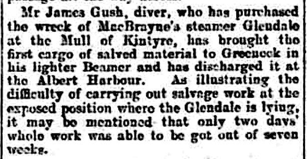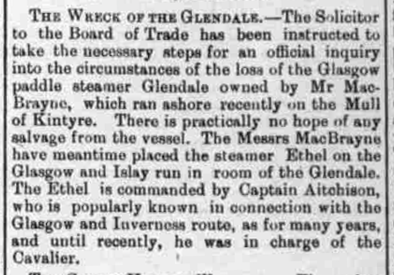 Her career for her final owners was destined to be a short one. At 5:20pm on Thursday 20th July, 1905 she left Greenock bound for Port Ellen, Islay under the command of Captain J McKechnie with thirteen passengers plus the crew aboard. She was going to the island to pick up holiday makers and return them to Glasgow. As she passed Pladda at the south end of Kintyre she was enveloped in a thick fog. At 11:10, while rounding the Mull of Kintyre, she ran aground at Cove Point at speed and stuck fast on a reef just a short distance from the rocky shore. She was badly holed but settled upright and in no immediate danger. As a precaution the passengers were taken ashore in the ship’s boats and spent the night on the rocks. Next morning they were able to reboard the Glendale to take off their possessions before being rowed round to Southend. The Glendale was to become a total wreck.