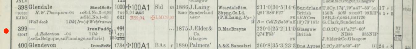 Built for the London, Brighton and South Coast Railway Co Ltd of Newhaven she was first registered on the 15th September 1875. The first thirteen years of her career were spent plying between Newhaven and Dieppe but in 1888, as she had become too slow to compete on this route, she was sold back to her builders (now the Fairfield Company) and reboilered. On completion of the refit she was briefly owned by Mr Richard Barnwell of Glasgow before being sold to the Hamburg – Amerika Line in 1892 and registered in Hamburg where she was named Flamingo. Richard Barnwell bought her back in 1895 and sold her yet again to William Rhodes of London in 1897 who named her La Belgique. Finally in 1902 she was purchased by David MacBrayne, renamed Glendale and set to work on various West Highland routes.