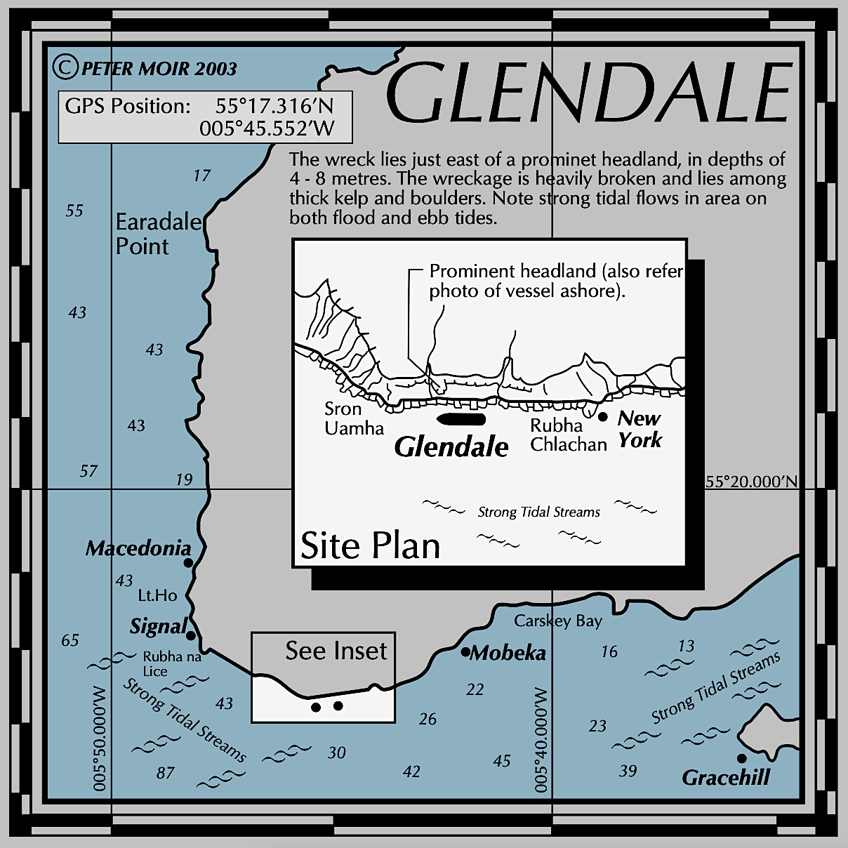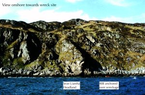 The wreckage lies in shallow water approximately 50 metres from the shore inside the reef she grounded on in position 55° 17.316’N, 005° 45.552’W (GPS) which is about 100 metres east of the point, named Sron Uamha on the chart of the area. It is possible that further wreckage exists outside the reef but the tides in the area make a dive outside the reef extremely difficult except at slack water. Even where she lies the tide can be a hazard.