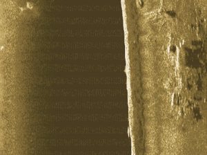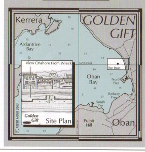 The remains of the Golden Gift lie where she sank close to the shore north of the North Pier, Oban Bay in position 56° 24.974’N, 005° 28.551’W. The wreck, which is easily accessible from the shore, lies at the foot of a muddy slope in 12 – 14 metres on her side with all wooden structures gone and only the crumbling metal framework and boiler remaining. Latest dive reports indicate some of the wreckage still stands proud of the seabed but these reports are not recent. The wreck is covered in sealife but the silty nature of the area makes the visibility reduce rapidly. For many years now it has been forbidden to dive in the Oban Harbour area and, as such, the wreck is off limits, unless you can convince the Harbourmaster to give you permission for a dive. The latest survey in 2013 reported little visible wreckage although there is still enough on site to show up on sidescan image shown above.