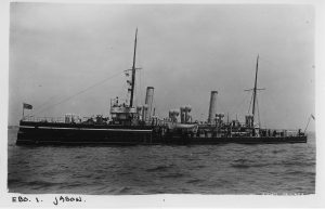 The steel Alarm class torpedo gunboat HMS Jason was launched from the Naval Construction & Armament Co Ltd., Barrow (Yard No 198) on 14th May 1892. She measured 242.0′ x 27.0′ x 12.5′ and her tonnage was 810 displacement tons. She was powered by 2 x 3 cylinder vertical triple expansion steam engines by Naval Construction & Armament delivering 3500 indicated horse power. In September 1902 new engines were installed by Fairfield Shipbuilding Co Ltd., Glasgow increasing her power to 5800 indicated horse power. She was armed with 1 x fixed bow 14” torpedo tube, 2 x revolving 14” torpedo tubes, 2 x 14” fixed torpedo tubes, 2 x 4.7” guns, 4 x 3 pounder guns and 1 Gardner machine gun.