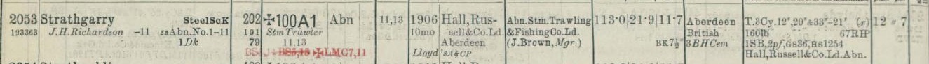 The steel steam trawler Strathgarry was launched from the Footdee yard of Hall, Russell and Co Ltd, Aberdeen (Yard No 411) on 4th September 1906. She measured 113.0′ x 21,9′ x 11.7′ and her tonnage was 202 gross tons, 60 net tons. She was powered by a triple expansion steam engine by Hall Russell delivering 67 registered horse power. Ordered by the Aberdeen Steam Trawling and Fishing Co Ltd she was registered in Aberdeen A97. Her official number was 123363.