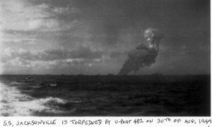 The commander of U-482, Kapitanleutnant Graf von Matuschka, started his attack at 14:55 GMT. He fired two torpedoes at a group of five ships scored a direct hit on the last ship in the line, Jacksonville, which, within seconds, was a mass of flames as her highly combustable cargo caught fire. Within minutes she was ablaze from stem to stern with flames leaping 100 metres into the sky. The position of the initial explosion was reported as 55° 30’N, 007° 30’W. A few minutes later she was hit by a second torpedo which broke her in two and the two burning halves drifted apart. Forty nine crewmen and twenty nine armed guards aboard had no chance – only two men survived to be picked up by the destroyer USS Poole after 90 minutes in the water. Both sections of the doomed ship remained afloat for some time.