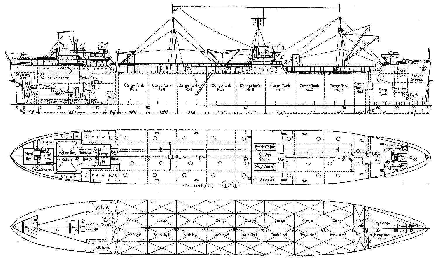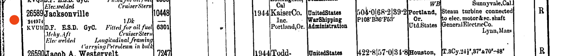 The T2-SE-A1 class steel motor tanker Jacksonville was launched from the Swan Island yard of the Kaiser Corporation, Portland, Oregon (Yard No 45) on 23rd December 1943. She measured 504.0′ x 68.2′ x 39.2′ and her tonnage was 10488 gross tons, 6301 net tons. She was powered by a steam turbine driving a 6000 horse power diesel engine by General Electric Company, Lynn, Massachusetts.
