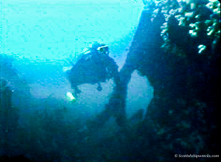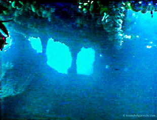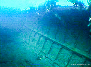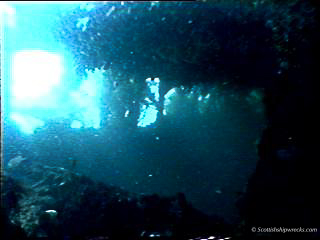 The wreck today lies in position 55° 38.212’N, 006° 05.533’W sitting upright in 8 metres facing south east in the position noted. She is in tact, lying with a slight list to port, with her stern resting on the edge of the reef and the bow slightly deeper on a sandy seabed. The hull, which is covered in colourful sponges and other encrusting sealife, is falling away around the stern accommodation allowing light to flood into this part of the wreck. Otherwise all that remains is the void of the empty hold and a small locker room at the bow. The images below are frame grabs from a dive undertaken in 1988.