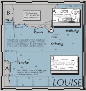 The small wreck of the Louise lies on a sloping sandy seabed off Bogany Point in general seabed depths of 43 metres in position 55° 50.658’N, 005° 00.952’W (GPS). The wreck eluded the attentions of divers for years as it was fairly difficult to locate sitting only two metres proud of the seabed.