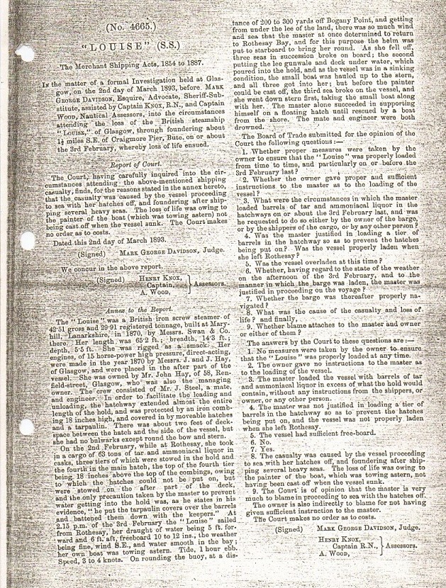 As the Louise left Rothesay Bay the sea was calm but, as she reached Bogany Point at the south east end of the bay, she left the shelter of the land and the sea immediately became rough. Mr Steel decided to return to Rothesay and await calmer weather. As he turned to port his little vessel was hit, side on, by a series of heavy seas and, as a large wave pushed her port gunwhale beneath the surface, the water rushed into the open hold. The master and his two crewmen leapt into the Louise’s lifeboat which was being towed astern but, before they could untie the painter, another large wave struck the Louise and she sank by the stern taking the lifeboat and the two crew with her. Mr Steel survived by clinging to a floating hatch cover.