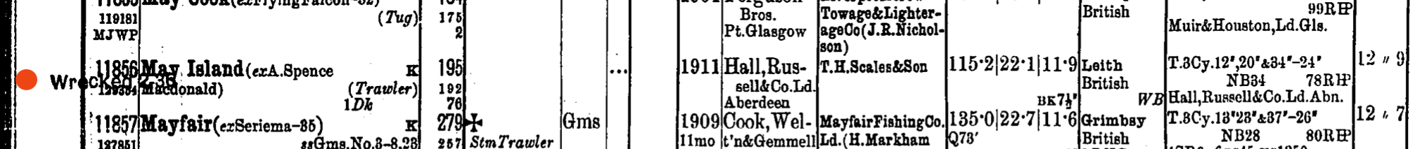 Built for Richard Irvin and Sons Ltd of Aberdeen she was requisitioned for Admiralty service as a minesweeper at the start of World War One. After the war she was sold to the Gamecock Steam Trawling Co Ltd and registered in Scarborough SH148. In 1930 she was purchased by Thomas H Scales of Edinburgh who changed her name to May Island and registered her in Leith LH194.